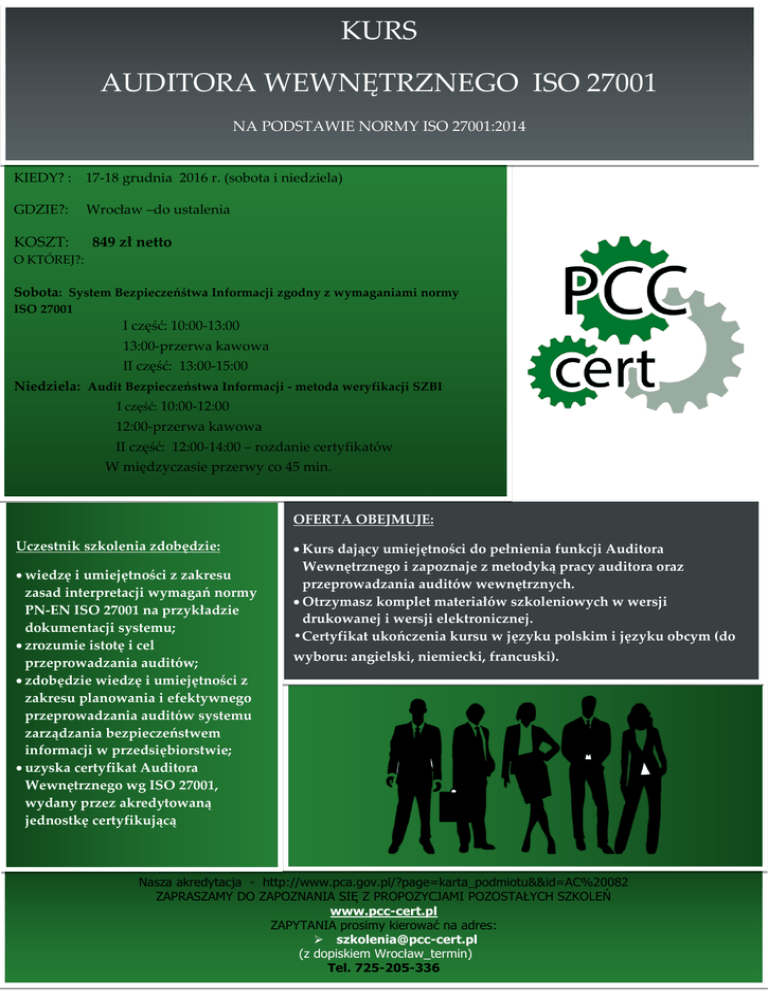 KURS AUDITORA WEWNĘTRZNEGO ISO 27001 NA PODSTAWIE NORMY ISO 27001:2014 KIEDY? : 17-18 grudnia 2016 r. (sobota i niedziela) GDZIE?: Wrocław –do ustalenia KOSZT: 849 zł netto O KTÓREJ?: Sobota: System Bezpieczeńśtwa Informacji zgodny z wymaganiami normy ISO 27001 I część: 10:00-13:00 13:00-przerwa kawowa II część: 13:00-15:00 Niedziela: Audit Bezpieczeństwa Informacji - metoda weryfikacji SZBI I część: 10:00-12:00 12:00-przerwa kawowa II część: 12:00-14:00 – rozdanie certyfikatów W międzyczasie przerwy co 45 min. OFERTA OBEJMUJE: Uczestnik szkolenia zdobędzie: wiedzę i umiejętności z zakresu zasad interpretacji wymagań normy PN-EN ISO 27001 na przykładzie dokumentacji systemu; zrozumie istotę i cel przeprowadzania auditów; zdobędzie wiedzę i umiejętności z zakresu planowania i efektywnego przeprowadzania auditów systemu zarządzania bezpieczeństwem informacji w przedsiębiorstwie; uzyska certyfikat Auditora Wewnętrznego wg ISO 27001, wydany przez akredytowaną jednostkę certyfikującą Kurs dający umiejętności do pełnienia funkcji Auditora Wewnętrznego i zapoznaje z metodyką pracy auditora oraz przeprowadzania auditów wewnętrznych. Otrzymasz komplet materiałów szkoleniowych w wersji drukowanej i wersji elektronicznej. •Certyfikat ukończenia kursu w języku polskim i języku obcym (do wyboru: angielski, niemiecki, francuski). • W cenie przerwa kawowa. Nasza akredytacja - http://www.pca.gov.pl/?page=karta_podmiotu&&id=AC%20082 ZAPRASZAMY DO ZAPOZNANIA SIĘ Z PROPOZYCJAMI POZOSTAŁYCH SZKOLEŃ www.pcc-cert.pl ZAPYTANIA prosimy kierować na adres: [email protected] (z dopiskiem Wrocław_termin) Tel. 725-205-336 KURS AUDITORA WEWNĘTRZNEGO ISO 27001 NA PODSTAWIE NORMY ISO 27001:2014 ` Kim jest Audytor Wewnętrzny ISO 9001? Tylko w roku 2014 w Polsce około 10 000 organizacji uzyskało certyfikat ISO 27001, dotyczący zarządzania bezpieczeństwem informacji . Te organizacje to nie tylko międzynarodowe korporacje, ale również małe przedsiębiorstwa. Każda z tych firm potrzebuje osoby która będzie miała za zadanie nadzorować system zarządzania bezpieczeństwem informacji ISO 27001. Taka osoba wg normy ISO 27001 musi posiadać odpowiednie, potwierdzone kompetencje. Takie kompetencje zapewnia certyfikat ukończenia szkolenia Auditora Wewnętrznego ISO 27001. Współpraca między PCC-CERT Sp. z o.o. Sp.k. , uczelniami wyższymi i firmami w Polsce umożliwia wspólną organizację kursów. Dzięki temu dostęp do naszych szkoleń mają nie tylko pracownicy zatrudnieni już w firmach, ale również studenci, kandydaci na przyszłe stanowiska. Wcześniej, ze względu na koszty studenci mieli do nich ograniczony dostęp. ~Prezes PCC – CERT Sp. z o.o. Sp.k. Współpracujemy m.in. z: Nasza akredytacja - http://www.pca.gov.pl/?page=karta_podmiotu&&id=AC%20082 ZAPRASZAMY DO ZAPOZNANIA SIĘ Z PROPOZYCJAMI POZOSTAŁYCH SZKOLEŃ www.pcc-cert.pl ZAPYTANIA prosimy kierować na adres: [email protected] (z dopiskiem Miasto-termin) Tel. 725-205-336