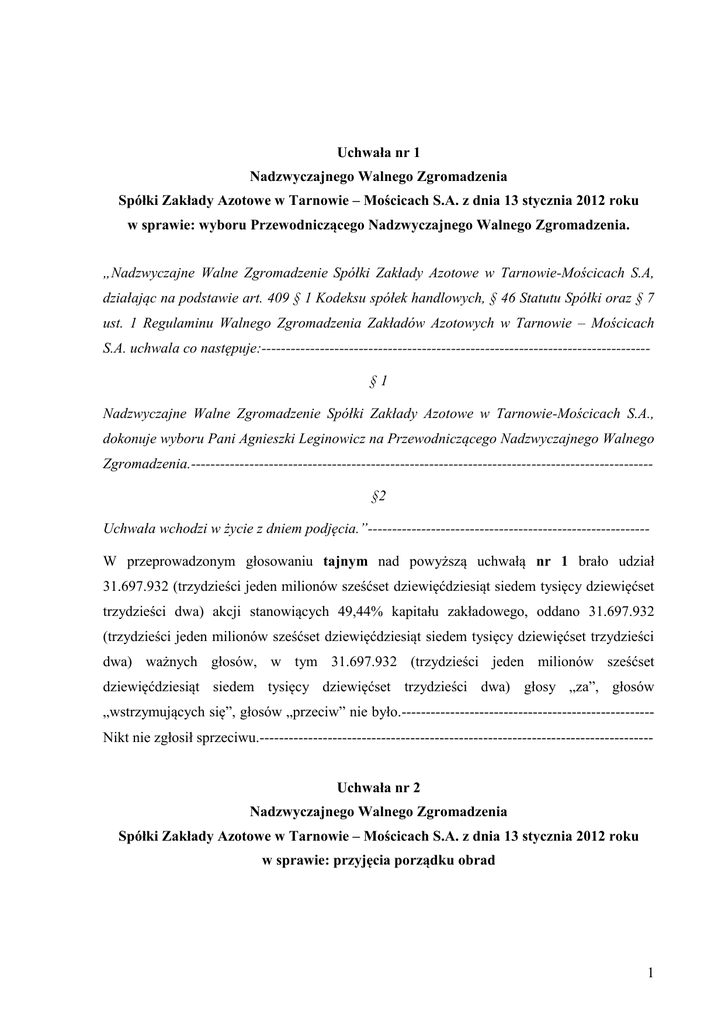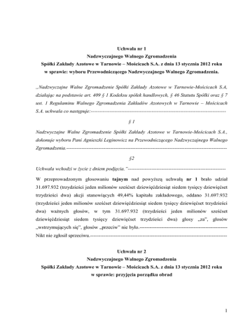 Uchwała nr 1 Nadzwyczajnego Walnego Zgromadzenia Spółki Zakłady Azotowe w Tarnowie – Mościcach S.A. z dnia 13 stycznia 2012 roku w sprawie: wyboru Przewodniczącego Nadzwyczajnego Walnego Zgromadzenia. „Nadzwyczajne Walne Zgromadzenie Spółki Zakłady Azotowe w Tarnowie-Mościcach S.A, działając na podstawie art. 409 § 1 Kodeksu spółek handlowych, § 46 Statutu Spółki oraz § 7 ust. 1 Regulaminu Walnego Zgromadzenia Zakładów Azotowych w Tarnowie – Mościcach S.A. uchwala co następuje:-------------------------------------------------------------------------------§1 Nadzwyczajne Walne Zgromadzenie Spółki Zakłady Azotowe w Tarnowie-Mościcach S.A., dokonuje wyboru Pani Agnieszki Leginowicz na Przewodniczącego Nadzwyczajnego Walnego Zgromadzenia.----------------------------------------------------------------------------------------------§2 Uchwała wchodzi w życie z dniem podjęcia.”---------------------------------------------------------W przeprowadzonym głosowaniu tajnym nad powyższą uchwałą nr 1 brało udział 31.697.932 (trzydzieści jeden milionów sześćset dziewięćdziesiąt siedem tysięcy dziewięćset trzydzieści dwa) akcji stanowiących 49,44% kapitału zakładowego, oddano 31.697.932 (trzydzieści jeden milionów sześćset dziewięćdziesiąt siedem tysięcy dziewięćset trzydzieści dwa) ważnych głosów, w tym 31.697.932 (trzydzieści jeden milionów sześćset dziewięćdziesiąt siedem tysięcy dziewięćset trzydzieści dwa) głosy „za”, głosów „wstrzymujących się”, głosów „przeciw” nie było.---------------------------------------------------Nikt nie zgłosił sprzeciwu.--------------------------------------------------------------------------------Uchwała nr 2 Nadzwyczajnego Walnego Zgromadzenia Spółki Zakłady Azotowe w Tarnowie – Mościcach S.A. z dnia 13 stycznia 2012 roku w sprawie: przyjęcia porządku obrad 1 „Nadzwyczajne Walne Zgromadzenie Spółki Zakłady Azotowe w Tarnowie-Mościcach S.A, działając na podstawie § 22 ust. 1 Regulaminu Walnego Zgromadzenia Zakładów Azotowych w Tarnowie – Mościcach S.A. uchwala co następuje:------------------------------------------------§1 Nadzwyczajne Walne Zgromadzenie przyjmuje następujący porządek obrad:--------------------1. Otwarcie Zgromadzenia,-----------------------------------------------------------------------2. Wybór Przewodniczącego Zgromadzenia oraz sporządzenie listy obecności,---------- 3. Stwierdzenie prawidłowości zwołania Zgromadzenia i jego zdolności do podejmowania uchwał,-------------------------------------------------------------------------4. Przyjęcie porządku obrad,---------------------------------------------------------------------5. Powołanie Komisji Skrutacyjnej,-------------------------------------------------------------6. Zmiany w składzie Rady Nadzorczej Zakładów Azotowych w Tarnowie-Mościcach S.A.,-----------------------------------------------------------------------------------------------7. Zmiany w Statucie Spółki,---------------------------------------------------------------------8. Zamknięcie obrad.------------------------------------------------------------------------------§2 Uchwała wchodzi w życie z dniem podjęcia.”---------------------------------------------------------Nikt z obecnych nie zgłosił propozycji zmian co do projektu przedstawionej powyżej uchwały.-----------------------------------------------------------------------------------------------------W przeprowadzonym głosowaniu jawnym nad powyższą uchwałą nr 2 brało udział 31.697.932 (trzydzieści jeden milionów sześćset dziewięćdziesiąt siedem tysięcy dziewięćset trzydzieści dwa) akcji stanowiących 49,44% kapitału zakładowego, oddano 31.697.932 (trzydzieści jeden milionów sześćset dziewięćdziesiąt siedem tysięcy dziewięćset trzydzieści dwa) ważnych głosów, w tym 31.697.932 (trzydzieści jeden milionów sześćset dziewięćdziesiąt siedem tysięcy dziewięćset trzydzieści dwa) głosy „za”, głosów „wstrzymujących się”, głosów „przeciw” nie było.---------------------------------------------------Nikt nie zgłosił sprzeciwu.--------------------------------------------------------------------------------Przewodnicząca Zgromadzenia stwierdziła, że uchwała nr 2 została podjęta.--------------------Uchwała nr 3 Nadzwyczajnego Walnego Zgromadzenia Spółki Zakłady Azotowe w Tarnowie – Mościcach S.A. z dnia 13 stycznia 2012 roku 2 w sprawie: powołania Komisji Skrutacyjnej „Nadzwyczajne Walne Zgromadzenie Spółki Zakłady Azotowe w Tarnowie-Mościcach S.A., działając na podstawie § 23 ust. 1 Regulaminu Walnego Zgromadzenia Zakładów Azotowych w Tarnowie – Mościcach S.A. uchwala co następuje:------------------------------------------------§1 Nadzwyczajne Walne Zgromadzenie Zakładów Azotowych w Tarnowie Mościcach S.A. powołuje Komisję Skrutacyjną w składzie:------------------------------------------------------------1. Joanna Barnaś,----------------------------------------------------------------------------------2. Anna Dura,--------------------------------------------------------------------------------------3. Janusz Florek.-----------------------------------------------------------------------------------§2 Uchwała wchodzi w życie z dniem podjęcia”.---------------------------------------------------------Nikt z obecnych nie zgłosił propozycji zmian co do projektu przedstawionej powyżej uchwały.-----------------------------------------------------------------------------------------------------W przeprowadzonym głosowaniu tajnym nad powyższą uchwałą nr 3 brało udział 31.697.932 (trzydzieści jeden milionów sześćset dziewięćdziesiąt siedem tysięcy dziewięćset trzydzieści dwa) akcji stanowiących 49,44% kapitału zakładowego, oddano 31.697.932 (trzydzieści jeden milionów sześćset dziewięćdziesiąt siedem 