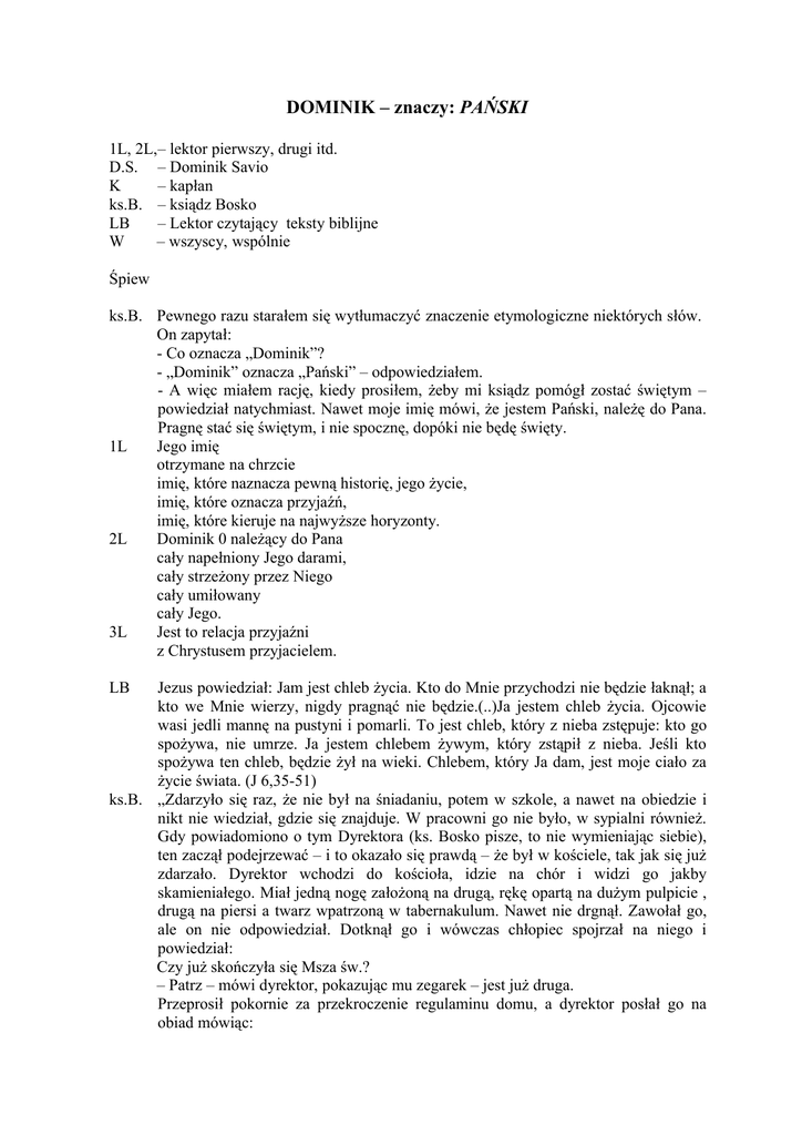 DOMINIK – znaczy: PAŃSKI 1L, 2L,– lektor pierwszy, drugi itd. D.S. – Dominik Savio K – kapłan ks.B. – ksiądz Bosko LB – Lektor czytający teksty biblijne W – wszyscy, wspólnie Śpiew ks.B. Pewnego razu starałem się wytłumaczyć znaczenie etymologiczne niektórych słów. On zapytał: - Co oznacza „Dominik”? - „Dominik” oznacza „Pański” – odpowiedziałem. - A więc miałem rację, kiedy prosiłem, żeby mi ksiądz pomógł zostać świętym – powiedział natychmiast. Nawet moje imię mówi, że jestem Pański, należę do Pana. Pragnę stać się świętym, i nie spocznę, dopóki nie będę święty. 1L Jego imię otrzymane na chrzcie imię, które naznacza pewną historię, jego życie, imię, które oznacza przyjaźń, imię, które kieruje na najwyższe horyzonty. 2L Dominik 0 należący do Pana cały napełniony Jego darami, cały strzeżony przez Niego cały umiłowany cały Jego. 3L Jest to relacja przyjaźni z Chrystusem przyjacielem. LB Jezus powiedział: Jam jest chleb życia. Kto do Mnie przychodzi nie będzie łaknął; a kto we Mnie wierzy, nigdy pragnąć nie będzie.(..)Ja jestem chleb życia. Ojcowie wasi jedli mannę na pustyni i pomarli. To jest chleb, który z nieba zstępuje: kto go spożywa, nie umrze. Ja jestem chlebem żywym, który zstąpił z nieba. Jeśli kto spożywa ten chleb, będzie żył na wieki. Chlebem, który Ja dam, jest moje ciało za życie świata. (J 6,35-51) ks.B. „Zdarzyło się raz, że nie był na śniadaniu, potem w szkole, a nawet na obiedzie i nikt nie wiedział, gdzie się znajduje. W pracowni go nie było, w sypialni również. Gdy powiadomiono o tym Dyrektora (ks. Bosko pisze, to nie wymieniając siebie), ten zaczął podejrzewać – i to okazało się prawdą – że był w kościele, tak jak się już zdarzało. Dyrektor wchodzi do kościoła, idzie na chór i widzi go jakby skamieniałego. Miał jedną nogę założoną na drugą, rękę opartą na dużym pulpicie , drugą na piersi a twarz wpatrzoną w tabernakulum. Nawet nie drgnął. Zawołał go, ale on nie odpowiedział. Dotknął go i wówczas chłopiec spojrzał na niego i powiedział: Czy już skończyła się Msza św.? – Patrz – mówi dyrektor, pokazując mu zegarek – jest już druga. Przeprosił pokornie za przekroczenie regulaminu domu, a dyrektor posłał go na obiad mówiąc: Jeśli ktoś zapyta cię, skąd przychodzisz, odpowiedz, że przychodzisz po wypełnieniu mego polecenia. Innego dnia, skończywszy normalne dziękczynienie po Mszy św., wychodziłem z zakrystii, gdy usłyszałem na chórze głos jakiejś osoby rozmawiającej z kimś. Idą zobaczyć i znajdują Dominika, który coś mówi, potem zatrzymuje się, jakby czekał na odpowiedź. Wśród innych słów wyraźnie usłyszałem następujące: Tak mój Boże, już Ci powiedziałem i powtarzam to: kocham Cię i chcę Ciebie kochać aż do śmierci. Jeśli zobaczysz, Boże, że chcę Cię obrazić, ześlij mi śmierć, tak, wolę umrzeć, niż Cię obrazić. Czasami pytałem, co robi w czasie kiedy opóźniał wyjście z kościoła, a on z całą prostotą odpowiedział; - o ja biedny, czasami ulegam roztargnieniom, tracę wątek modlitw i wydaje mi się, że widzę rzeczy tak piękne, iż godziny mijają jak jedna chwila”. (Z „Zycie Dominika Savio”, napisanego przez Ks. Bosko). Przyjaciel, który stawia pytania! On nie zobowiązuje, nie krzyczy, ALE OCZEKUJE I OFIARUJE SIĘ! Co znaczą dla ciebie różne elementy, których Jezus użył na określenie siebie? Czy odczuwasz spotkanie z Nim jako coś ważnego: chleb, brama, droga prawda, życie, Pasterz twojego życia? Jakie chwile rezerwujesz sobie by „wyjść” z Nim? LB 1L W „A wy, za kogo Mnie uważacie”? Coście przyszli zobaczyć? Pozwólcie, że powtórzę to pytanie: coście przyszli zobaczyć? Albo lepiej, kogo przyszliście zobaczyć? Ważne jest, byście zdali sobie sprawę, że wśród licznych pytań, jakie rodzą się w waszych sercach, te najistotniejsze nie zaczynają się od „co”. Zasadnicze pytanie brzmi: „kto”; „do kogo” się udać, „za kim” pójść, „komu” zawierzyć swoje życie. W rzeczywistości, kiedy marzycie o szczęściu, szukacie właśnie Jezusa. To On na was czeka, gdy nie zadowala was nic z tego, co znajdujecie. To On jest pięknem, które tak was pociąga. To On wzbudza w was pragnienie radykalnych wyborów, które nie pozwala iść na kompromisy. To On każe wam zrzucać maski, które zakłamują wasze życie. To On odczytuje w waszych sercach decyzje najbardziej autentyczne, które inni chcieliby zagłuszyć. To Jezus wzbudza w was pragnienie, byście uczynili ze swego życia coś wielkiego, byście szli za jakimś ideałem, nie dawali się pochłonąć przeciętności. Daje odwagę, by pokornie i wytrwale dążyć do doskonalenia samych siebie i społeczeństw, czyniąc je bardziej ludzkim i braterskim. Ta On – Chrystus. ( Jan Paweł II, ŚDM 2000) Usłysz, Panie, mój głos. Wołam do Ciebie: zmiłuj się nade mną i wysłuchaj mnie. O Tobie mówi moje serce: szukajcie Jego oblicza. Szukam o Boże, Twojego oblicza, swego oblicza nie zakrywaj przede mną, nie odpędzaj z gniewem swojego sługi. Ty jesteś moją pomocą więc mnie nie odrzucaj i nie opuszczaj mnie, Boże, moje zbawienie! Choćby mnie opuścili ojciec mój i matka, to jednak Bóg mnie przygarnie. 1L 2L W Śpiew Boże, naucz mnie Twojej drogi, prowadź mnie ścieżką prostą. (Ps 27). „Ty”, które nadeje sens naszej wędrówce. Relacja przyjaźni, która daje uśmiech naszemu życiu. Spojrzenie nieba, które otwiera Boże horyzonty przed naszym człowieczeństwem. Ty, Panie Jezu stała obecności naszego życia. Ty, obecności, która daje Miłosierdzie. Ty, obecności, która jako Chleb z nieba podtrzymuje naszą drogę. Ty, obecności żywa, która idzie z nami w Kościele, w Twoim ciele. Ty, obecności obok nas za pośrednictwem Twojej Matki, Maryi. Ty, obecności, która oświ
