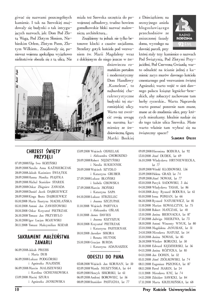 fot. Raf a³ R Rafa³ Roojek giwaæ siê nazwami poszczególnych kamienic. I tak na Szewskiej znajdowa³y siê budynki o tak intryguj¹cych nazwach, jak: Dom Pod Z³ot¹ Wag¹, Pod Z³otym S³oniem, Niebieskim Or³em, Z³otym Psem, Z³otym Wilkiem... Znajdowa³y siê, poniewa¿ wojenna apokalipsa wyj¹tkowo nielitociwie obesz³a siê z t¹ ulic¹. Nie CHRZEST WIÊTY PRZYJÊLI 07.09.2008 Filip Iwo KOZIÑSKI 28.09.2008 Natalia Anna KAMIERCZAK 28.09.2008 Jakub Kazimierz WI¥ TEK 28.09.2008 Hanna Monika PI¥STKA 28.09.2008 Micha³ Stanis³aw STAREK 28.09.2008 Oskar Zbigniew ZAWADA 28.09.2008 Daniel Jacek D¥BKIEWICZ 28.09.2008 Kinga Beata D¥BKIEWICZ 05.10.2008 Maria Faustyna MACHLAÑSKA 05.10.2008 Antoni Jan ZAWISTOWSKI 18.10.2008 Oskar Krzysztof PIETRZAK 26.10.2008 Tomasz Jan PRZYBY£O 26.10.2008 Igor Lucjan ROJEWSKI 30.11.2008 Tomasz Maksymilian KOZAR SAKRAMENT MA£¯EÑSTW A MA£¯EÑSTWA ZA W ARLI ZAW 06.09.2008 Jakub PREISS i Maria DUB 06.09.2008 £ukasz PODGÓRSKI i Agnieszka MAJDZIK 06.09.2008 Marcin MALISZEWSKI i Karolina OCHENKOWSKA 13.09.2008 Maciej SZURA i Agnieszka JANKOWSKA 10 mia³a te¿ Szewska szczêcia do powojennej odbudowy, trudno bowiem gomu³kowskie bloki nazwaæ malownicz¹ architektur¹... Znajdziemy tu jednak nie tylko betonowe klocki z czasów socjalizmu. Strzelisty gotyk kocio³a pod wezwaniem w. Marii Magdaleny wraz z doklejonym do niego jeszcze w redniowieczu romañskim portalem i modernistyczny Dom Handlowy Kameleon, to najbardziej charakterystyczne budynki tej staromiejskiej ulicy. Warto te¿ zwróciæ swoj¹ uwagê na naro¿n¹ kamienicê ze redniowieczn¹ figur¹ Matki Boskiej z Dzieci¹tkiem; na secesyjnego anio³a b³ogos³awi¹cego przechodniów ze zniszczonej fasady domu, wyros³ego na dawniej parceli, przy której sta³y trzy kamienice o nazwach Pod wi¹tyni¹, Pod Z³otymi Przyjació³mi, Pod Czerwon¹ Gwiazd¹; warto odnaleæ na cianie jednej z kamienic zarys murów dawnego kocio³a cmentarnego pod wezwaniem wiêtej Agnieszki; warto wejæ w sieñ dawnego pa³acu ksi¹¿¹t legnicko-brzeskich, aby zobaczyæ zachowane tam herby rycerskie... Warto. Naprawdê warto poznaæ pozornie nam znane, znane a¿ do znudzenia ulice, przy których mieszkamy. Idealnie nadaje siê do tego tak¿e ulica Szewska. Mo¿e warto w³anie tam wybraæ siê na wi¹teczny spacer? 13.09.2008 Wojciech OSMELAK i Aleksandra CHOROSZKO 20.09.2008 Robert NÊDZYÑSKI i Natalia SUKIENNIK 20.09.2008 Wojciech SZYD£O i Katarzyna GRUBER 27.09.2008 £ukasz B£OÑSKI i Izabela CISOWSKA 27.09.2008 Marcin MOÑSKI i Katarzyna SAPA 04.10.2008 £ukasz STRZELEC i Joanna SZCZUPAK 11.10.2008 Wojciech PARTYKA i Aleksandra OLAK 11.10.2008 James DAVIES i Joanna KSZYSZUK 18.10.2008 Krzysztof PIETRZAK i Katarzyna PASTERNAK 18.10.2008 Jaros³aw SIKORA i Renata HUTNIK 25.10.2008 Gracjan BURDA i Katarzyna ADAMASZEK 09.09.2008 Hieronima BODURA, lat 92 13.10.2008 Józef DUDEK, lat 69 16.10.2008 W³adys³awa HRYNIEWIECKA, lat 77 20.09.2008 Witold K£ODOWSKI, l.56 25.09.2008 Helena GRAD, lat 74 29.09.2008 Józef NOWAK, lat 77 03.10.2008 Patryk SADOWSKI, 3 dni 04.10.2008 W³adys³awa TASAK, lat 86 04.10.2008 Jerzy Ryszard BODURA, lat 61 05.10.2008 Irena POMIAN, lat 66 06.10.2008 Ryszard NATUSEWICZ, lat 81 11.10.2008 Marian KOWALCZYK, lat 75 12.10.2008 Robert MATCZAK, lat 40 13.10.2008 Janina BIERNACKA, lat 87 17.10.2008 Jadwiga MIERZWA, lat 73 18.10.2008 Antoni Wincenty WNUK, lat 80 23.10.2008 Magdalena JANUSIAK, lat 51 24.10.2008 Miros³awa MATUSZ, lat 54 25.10.2008 Janina NOWAK, lat 85 26.10.2008 Wies³aw BORUCKI, lat 50 31.10.2008 Edward KÊDZIERSKI, lat 56 04.11.2008 Janina RÓ¯YCKA, lat 85 04.11.2008 Jan DOMIN, lat 52 05.11.2008 Józef ZIÓ£KOWSKI, lat 74 08.11.2008 Eugeniusz PSZONKA, lat 87 08.11.2008 Pawe³ MARIN, lat 24 11.11.2008 Miros³awa KYC, lat 74 14.11.2008 Zdzis³aw SAWICKI, lat 84 17.11.2008 Marta KRZEMIÑSKA, lat 68 ODESZLI DO PANA 03.08.2008 Wojciech Jan KORMAN, lat 50 02.09.2008 Wanda MUSZYÑSKA, lat 64 05.09.2008 Henryk SIKORSKI, lat 61 06.09.2008 Andrzej BOROWIEC, lat 56 08.09.2008 Stanis³aw PASTUCHA, lat 77 S £A W OMIR O P ASEK £AW Pr zy K oci el niw ersyt eckim Przy Koci ociel elee U Uniw niwersyt ersyteckim