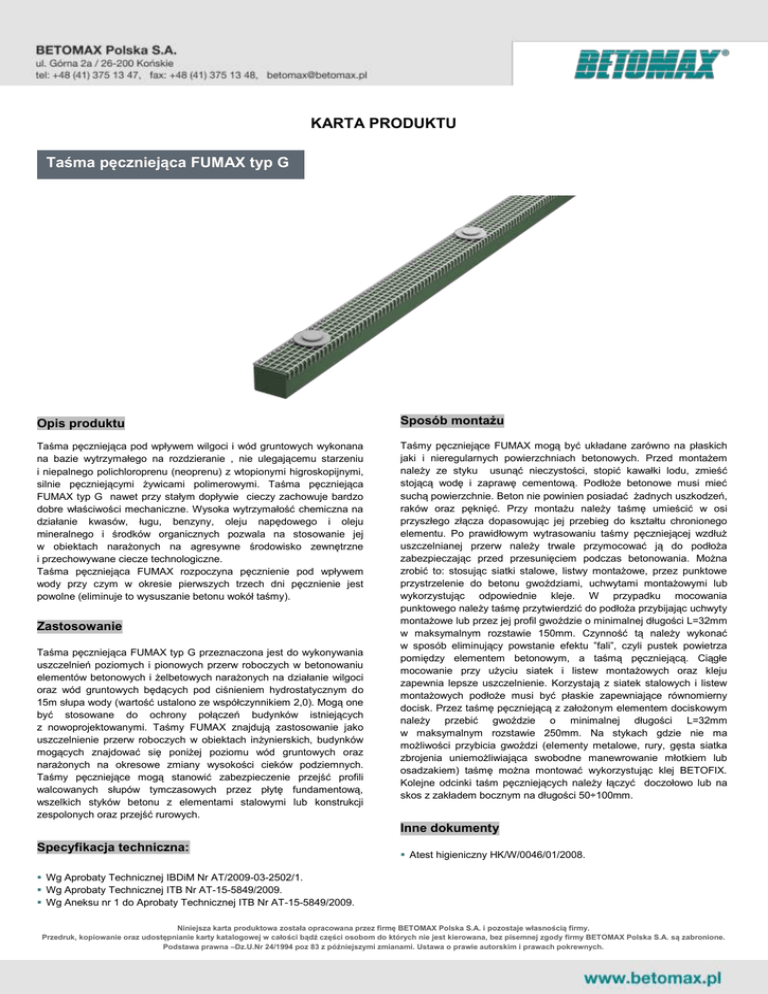 KARTA PRODUKTU Taśma pęczniejąca FUMAX typ G