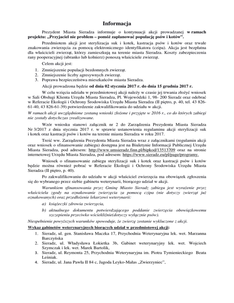Informacja Prezydent Miasta Sieradza informuje o kontynuacji akcji prowadzanej w ramach projektu: „Przyjaciel nie problem – pomóż zaplanować populację psów i kotów”. Przedmiotem akcji jest sterylizacja suk i kotek, kastracja psów i kotów oraz trwałe znakowania zwierzęcia za pomocą elektronicznego identyfikatora (czipa). Akcja jest bezpłatna dla właścicieli zwierząt, którzy zamieszkują na terenie miasta Sieradza. Koszty zabezpieczenia rany pooperacyjnej (ubranko lub kołnierz) ponoszą właściciele zwierząt. Celem akcji jest: 1. Zmniejszenie populacji bezdomnych zwierząt. 2. Zmniejszenie liczby agresywnych zwierząt. 3. Poprawa bezpieczeństwa mieszkańców miasta Sieradza. Akcji prowadzona będzie od dnia 02 stycznia 2017 r. do dnia 15 grudnia 2017 r. W celu wzięcia udziału w przedmiotowej akcji należy w czasie jej trwania złożyć wniosek w Sali Obsługi Klienta Urzędu Miasta Sieradza, Pl. Wojewódzki 1, 98- 200 Sieradz oraz odebrać w Referacie Ekologii i Ochrony Środowiska Urzędu Miasta Sieradza (II piętro, p. 40, tel. 43 82661-40, 43 826-61-39) potwierdzenie zakwalifikowania do udziału w akcji. W ramach akcji uwzględnione zostaną wnioski złożone i przyjęte w 2016 r., co do których zabiegi nie zostały dotychczas zrealizowane. Wzór wniosku stanowi załącznik nr 2 do Zarządzenia Prezydenta Miasta Sieradza Nr 3/2017 z dnia stycznia 2017 r. w sprawie ustanowienia regulaminu akcji sterylizacji suk i kotek oraz kastracji psów i kotów na terenie miasta Sieradza w roku 2017. Treść ww. Zarządzenia Prezydenta Miasta Sieradza wraz z załącznikami (regulamin akcji oraz wniosek o sfinansowanie zabiegu) dostępna jest na Biuletynie Informacji Publicznej Urzędu Miasta Sieradza, pod adresem: http://www.umsieradz.finn.pl/bipkod/13513709 oraz na stronie internetowej Urzędu Miasta Sieradza, pod adresem: https://www.sieradz.eu/pl/page/programy. Wniosek o sfinansowanie zabiegu sterylizacji suk i kotek oraz kastracji psów i kotów będzie można również pobrać w Referacie Ekologii i Ochrony Środowiska Urzędu Miasta Sieradza (II piętro, p. 40). Po zakwalifikowaniu do udziału w akcji właściciel zwierzęcia ma obowiązek zgłoszenia się do wybranego przez siebie gabinetu weterynarii, biorącego udział w akcji. Warunkiem sfinansowania przez Gminę Miasto Sieradz zabiegu jest wyrażenie przez właściciela zgody na oznakowanie zwierzęcia za pomocą czipa (nie dotyczy zwierząt już oznakowanych) oraz przedłożenie lekarzowi weterynarii: a) książeczki zdrowia zwierzęcia, b) aktualnego dokumentu potwierdzającego poddanie zwierzęcia obowiązkowemu szczepieniu przeciwko wściekliźnie(dotyczy wyłącznie psów). Niespełnienie powyższych warunków spowoduje, że zwierzę zostanie wykluczone z akcji. Wykaz gabinetów weterynaryjnych biorących udział w przedmiotowej akcji: 1. Sieradz, ul. gen. Stanisława Maczka 17, Przychodnia Weterynaryjna lek. wet. Marzanna Barczyńska 2. Sieradz, ul. Władysława Łokietka 3b, Gabinet weterynaryjny lek. wet. Wojciech Szymczak i lek. wet. Marek Bartolik, 3. Sieradz, ul. Reymonta 25, Przychodnia Weterynaryjna im. Piotra Tymienieckiego Beata Leśniak. 4. Sieradz, ul. Jana Pawła II 84 c, Jagoda Leyko-Małas „Zwierzyniec”,