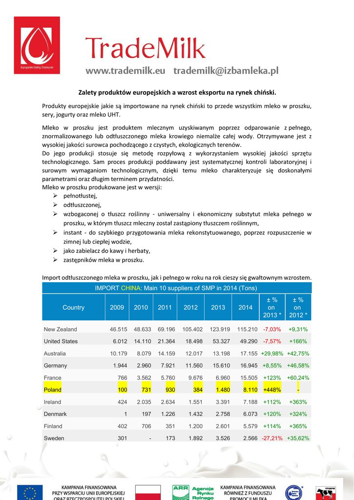 Zalety produktów europejskich a wzrost eksportu na rynek chiński. Produkty europejskie jakie są importowane na rynek chiński to przede wszystkim mleko w proszku, sery, jogurty oraz mleko UHT. Mleko w proszku jest produktem mlecznym uzyskiwanym poprzez odparowanie z pełnego, znormalizowanego lub odtłuszczonego mleka krowiego niemalże całej wody. Otrzymywane jest z wysokiej jakości surowca pochodzącego z czystych, ekologicznych terenów. Do jego produkcji stosuje się metodę rozpyłową z wykorzystaniem wysokiej jakości sprzętu technologicznego. Sam proces produkcji poddawany jest systematycznej kontroli laboratoryjnej i surowym wymaganiom technologicznym, dzięki temu mleko charakteryzuje się doskonałymi parametrami oraz długim terminem przydatności. Mleko w proszku produkowane jest w wersji: pełnotłustej, odtłuszczonej, wzbogaconej o tłuszcz roślinny - uniwersalny i ekonomiczny substytut mleka pełnego w proszku, w którym tłuszcz mleczny został zastąpiony tłuszczem roślinnym, instant - do szybkiego przygotowania mleka rekonstytuowanego, poprzez rozpuszczenie w zimnej lub ciepłej wodzie, jako zabielacz do kawy i herbaty, zastępników mleka w proszku. Import odtłuszczonego mleka w proszku, jak i pełnego w roku na rok cieszy się gwałtownym wzrostem. IMPORT CHINA: Main 10 suppliers of SMP in 2014 (Tons) 2009 2010 2011 2012 2013 2014 ±% on 2013 * ±% on 2012 * New Zealand 46.515 48.633 69.196 105.402 123.919 115.210 -7,03% +9,31% United States 6.012 14.110 21.364 18.498 53.327 49.290 -7,57% +166% Australia 10.179 8.079 14.159 12.017 13.198 17.155 +29,98% +42,75% Germany 1.944 2.960 7.921 11.560 15.610 16.945 +8,55% +46,58% France 766 3.562 5.760 9.676 6.960 15.505 +123% +60,24% Poland 100 731 930 384 1.480 8.110 +448% - Ireland 424 2.035 2.634 1.551 3.391 7.188 +112% +363% 1 197 1.226 1.432 2.758 6.073 +120% +324% Finland 402 706 351 1.200 2.601 5.579 +114% +365% Sweden 301 - 173 1.892 3.526 2.566 -27,21% +35,62% Country Denmark Source: Processed by Clal based on GTIS data * Change from the same period of previous year. IMPORT CHINA: Main 10 suppliers of Whey Powder in 2014 (Tons) Country United States 2009 2010 2011 2012 2013 2014 ±% on 2013 * ±% on 2012 * 140.019 141.524 162.933 173.615 206.987 208.378 +0,67% +20,02% France 49.758 35.633 47.680 54.873 60.574 64.426 +6,36% +17,41% Germany 15.107 16.399 20.635 23.049 20.591 22.357 +8,57% Netherlands 14.903 11.789 23.593 25.325 27.964 22.158 -20,76% -12,51% Argentina 5.767 4.805 16.803 23.556 37.259 22.058 -40,80% Poland 5.778 7.951 13.516 11.124 16.779 16.534 -1,46% +48,63% Finland 14.148 13.654 14.363 15.320 14.900 15.825 +6,21% Ireland 13.070 9.270 18.011 14.851 13.930 11.609 -16,67% -21,83% Australia 8.932 6.391 5.536 6.192 4.820 3.617 -24,96% -41,59% Austria 2.166 1.195 100 2.698 3.526 2.994 -15,08% +10,99% -3,00% -6,36% +3,30% Source: Processed by Clal based on GTIS data * Change from the same period of previous year. Kolejnym produktem cieszącym się wzrostem jest żółty ser , który przeciwdziała powstawaniu próchnicy. Zapobiega powstawaniu kwasów, niszczących szkliwo zębów, regularne żucie sera po posiłkach zmniejszy ilość ubytków o połowę1. Ser zawiera spore ilości fosforu i skoncentrowanego białka, obfituje też w witaminę D i A, oraz łatwo przyswajalny wapń. Zawiera też witaminy z grupy B. Wszystko to pozytywnie wpływa na organizm i jest wyjątkowo ważne, zwłaszcza w przypadku dzieci i młodzieży, ponieważ znajdują się oni cały czas w fazie rozwoju. 1 http://tipy.interia.pl/artykul_6955,dlaczego-warto-jesc-zolty-ser.html Ser żółty, przeciwdziała chorobom skóry i poprawia funkcjonowanie systemu nerwowego. Plasterek żółtego sera, poprawi humor i zapewni energię do dalszego działania2. Jogurt jest szczególnym rodzajem fermentowanego mleka zawierającym kultury bakterii Lactobacillus bulgaricus oraz Streptococcus thermopilus ułatwia trawienie laktozy i pomagającym zapobiegać niedoborom wapnia i witaminy D3. Badanie 280 młodych Chińczyków w wieku od 7 do 12 lat wskazuje na fakt, że dzieci konsumujące jogurt pitny dwa do czterech razy tygodniowo mają mniejszą próchnicę, niż pozostałe4. Jogurt wspomaga oczyszczanie przewodu pokarmowego z toksyn, zapobiega rozwojowi bakterii chorobotwórczych i podnosi odporność organizmu. Zawiera on około 3,3% białka, 2 do 6% tłuszczu, 3,1% cukru, 0,8% kwasu mlekowego. W jednej szklance jogurtu znajduje się 415 miligramów bardzo dobrze przyswajalnego wapnia ( w mleku odtłuszczonym – 302 mg), witamin i innych biopierwiastków. Podobnie jak inne produkty eliminuje bakterie chorobotwórcze i gnilne z przewodu pokarmowego. Jest bogatszy w wapń niż mleko, zawiera 4-5 krotnie więcej aminokwasów. Ułatwia syntezę witamin w organizmie, wspomaga układ odpornościowy, ułatwia wchłanianie żelaza, pomaga przy zaparciach i wzdęciach5. Ogrzane surowe mleko do bardzo wysokiej temperatury, a następnie poddane błyskawicznemu schłodzeniu do temperatury około 20°C powoduje otrzymanie mleka UHT (ang. Ultra High Temperature), będącego produktem o kilkumiesięcznym okresie przydatności do spożycia. Mleko krowie jest pełnowartościowym produktem odżywczym dla osób w każdym wieku. Zawiera wiele niezbędnych dla organizmu składników. Jest dobrym źródłem wysokowartościowych białek, łatwo przyswajalnego tłuszczu, laktozy, niezbędnych soli mineralnych (wapń, fosfor, magnez, potas, cynk), biopierwiastków śladowych (miedź, mangan, selen, jod), wszystkich witamin rozpuszczalnych w tłuszczach (A, D, E, K) i w wodzie (B1, B2, B6, B12, C i in.). Znaczenie mleka dla zdrowia i rozwoju dzieci i młodzieży zostało dobrze poznane i udokumentowane wieloma badaniami klinicznymi. Podstawowa rola białek to tworzenie struktury narządów - tkanki umięśnionej, kostnej kolagen i białka niekolagenowe, np. osteokalcyna. Białka wchodzące w skład enzymów, hormonów, aktywnych peptydów odgrywają ważną ro