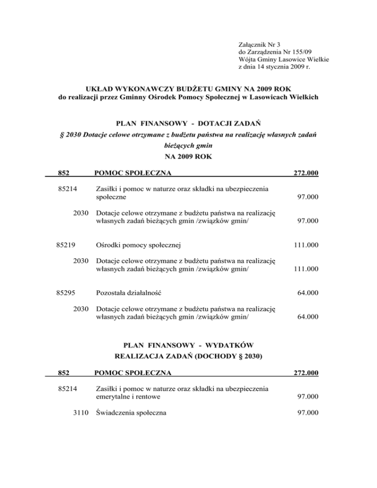 Załącznik Nr 3 do Zarządzenia Nr 155/09 Wójta Gminy Lasowice Wielkie z dnia 14 stycznia 2009 r. UKŁAD WYKONAWCZY BUDśETU GMINY NA 2009 ROK do realizacji przez Gminny Ośrodek Pomocy Społecznej w Lasowicach Wielkich PLAN FINANSOWY - DOTACJI ZADAŃ § 2030 Dotacje celowe otrzymane z budŜetu państwa na realizację własnych zadań bieŜących gmin NA 2009 ROK 852 POMOC SPOŁECZNA 85214 Zasiłki i pomoc w naturze oraz składki na ubezpieczenia społeczne 97.000 Dotacje celowe otrzymane z budŜetu państwa na realizację własnych zadań bieŜących gmin /związków gmin/ 97.000 2030 85219 2030 85295 2030 272.000 Ośrodki pomocy społecznej 111.000 Dotacje celowe otrzymane z budŜetu państwa na realizację własnych zadań bieŜących gmin /związków gmin/ 111.000 Pozostała działalność 64.000 Dotacje celowe otrzymane z budŜetu państwa na realizację własnych zadań bieŜących gmin /związków gmin/ 64.000 PLAN FINANSOWY - WYDATKÓW REALIZACJA ZADAŃ (DOCHODY § 2030) 852 POMOC SPOŁECZNA 85214 Zasiłki i pomoc w naturze oraz składki na ubezpieczenia emerytalne i rentowe 97.000 Świadczenia społeczna 97.000 3110 272.000 85219 4010 4040 4110 4120 4300 4440 4700 85295 3110 Ośrodki pomocy społecznej 111.000 Wynagrodzenia osobowe pracowników Dodatkowe wynagrodzenie roczne Składki na ubezpieczenia społeczne Składki na Fundusz Pracy Zakup usług pozostałych Odpisy na zakładowy fundusz świadczeń socjalnych Szkolenia pracowników niebędących członkami korpusu słuŜby cywilnej 89.000 6.000 12.200 2.000 300 1.000 Pozostała działalność 64.000 Świadczenia społeczne 64.000 500 PLAN DOCHODÓW NA 2009 ROK ZADANIA WŁASNE 852 POMOC SPOŁECZNA 9.700 85214 Zasiłki i pomoc w naturze oraz składki na ubezpieczenia emerytalne i rentowe 8.100 Wpływy z róŜnych dochodów 8.100 Usługi opiekuńcze i specjalistyczne usługi opiekuńcze 1.600 Wpływy z usług 1.600 0970 85228 0830 PLAN WYDATKÓW NA 2009 ROK ZADANIA WŁASNE 852 POMOC SPOŁECZNA 372.000 85214 Zasiłki i pomoc w naturze oraz składki na ubezpieczenia emerytalne i rentowe 115.000 3110 4330 Świadczenia społeczne Zakup usług przez jednostki samorządu terytorialnego od innych jednostek samorządu terytorialnego 2 35.000 80.000 85219 Ośrodki pomocy społecznej 3020 4010 4040 4110 4120 4210 4300 4410 4430 4440 4700 4740 4750 85228 3020 4010 4040 4110 4120 4170 4410 4440 85295 3110 4300 129.000 Wydatki osobowe niezaliczone do wynagrodzeń Wynagrodzenia osobowe pracowników Dodatkowe wynagrodzenie roczne Składki na ubezpieczenia społeczne Składki na Fundusz Pracy Zakup materiałów i wyposaŜenia Zakup usług pozostałych PodróŜe słuŜbowe krajowe RóŜne opłaty i składki Odpisy na zakładowy fundusz świadczeń socjalnych Szkolenia pracowników niebędących członkami korpusu słuŜby cywilnej Zakup materiałów papierniczych do sprzętu drukarskiego i urządzeń kserograficznych Zakup akcesoriów komputerowych, w tym programów i licencji 1.400 83.300 5.800 15.800 2.300 1.500 500 8.000 800 5.800 Usługi opiekuńcze i specjalistyczne usługi opiekuńcze 38.000 Wydatki osobowe niezaliczone do wynagrodzeń Wynagrodzenia osobowe pracowników Dodatkowe wynagrodzenie roczne Składki na ubezpieczenia społeczne Składki na Fundusz Pracy Wynagrodzenia bezosobowe PodróŜe słuŜbowe krajowe Odpisy na zakładowy fundusz świadczeń socjalnych 300 19.500 1.050 4.500 500 9.050 2.000 1.100 Pozostała działalność 90.000 Świadczenia społeczne Zakup usług pozostałych 70.000 20.000 1.500 300 2.000 PLAN FINANSOWY - DOTACJI ZADAŃ ZLECONYCH, ZADAŃ NA PODSTAWIE POROZUMIEŃ, PLAN FINANSOWY - DOTACJI ZADAŃ § 2010 Dotacje celowe otrzymane z budŜetu państwa na realizację zadań bieŜących z zakresu administracji rządowej oraz innych zadań zleconych gminie ustawami NA 2009 ROK 852 POMOC SPOŁECZNA 56.200 85213 Składki na ubezpieczenie zdrowotne opłacane za osoby 3 pobierające niektóre świadczenia z pomocy społecznej, niektóre świadczenia rodzinne oraz za osoby uczestniczące w zajęciach w centrum integracji społecznej 2010 Dotacje celowe otrzymane z budŜetu państwa na realizację zadań bieŜących z zakresu administracji rządowej oraz innych zadań zleconych gminie (związkom gmin) ustawami 85214 5.200 5.200 Zasiłki i pomoc w naturze oraz składki na ubezpieczenia emerytalne i rentowe 51.000 2010 Dotacje celowe otrzymane z budŜetu państwa na realizację zadań bieŜących z zakresu administracji rządowej oraz innych zadań zleconych gminie (związkom gmin) ustawami 51.000 PLAN FINANSOWY WYDATKÓW ZADAŃ ZLECONYCH, ZADAŃ NA PODSTAWIE POROZUMIEŃ NA 2009 ROK 852 POMOC SPOŁECZNA 56.200 85213 Składki na ubezpieczenie zdrowotne opłacane za osoby pobierające niektóre świadczenia z pomocy społecznej oraz niektóre świadczenia rodzinne 4130 Składki na ubezpieczenie zdrowotne 85214 Zasiłki i pomoc w naturze oraz składki na ubezpieczenia emerytalne i rentowe 3110 Świadczenia społeczne 5.200 5.200 51.000 51.000 RAZEM DOCHODY w tym: - dotacje na zadania zlecone - dotacje na zadania własne - środki samorządowe RAZEM WYDATKI w tym: - dotacje na zadania zlecone - dotacje na zadania własne - środki samorządowe 4 337.900 56.200 272.000 9.700 700.200 56.200 272.000 372.000