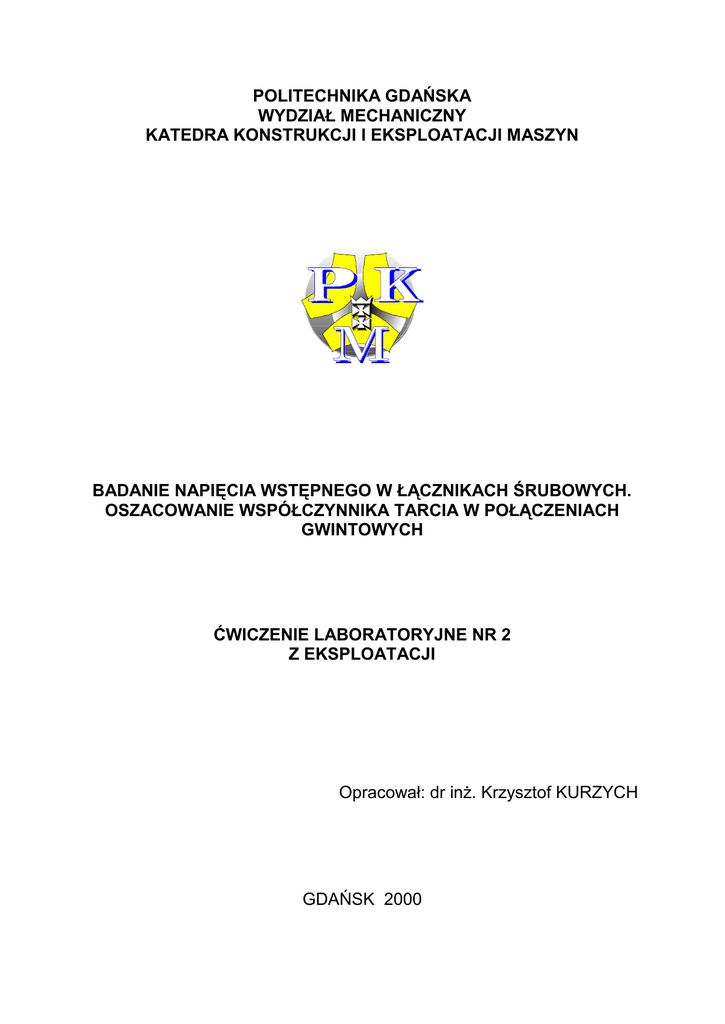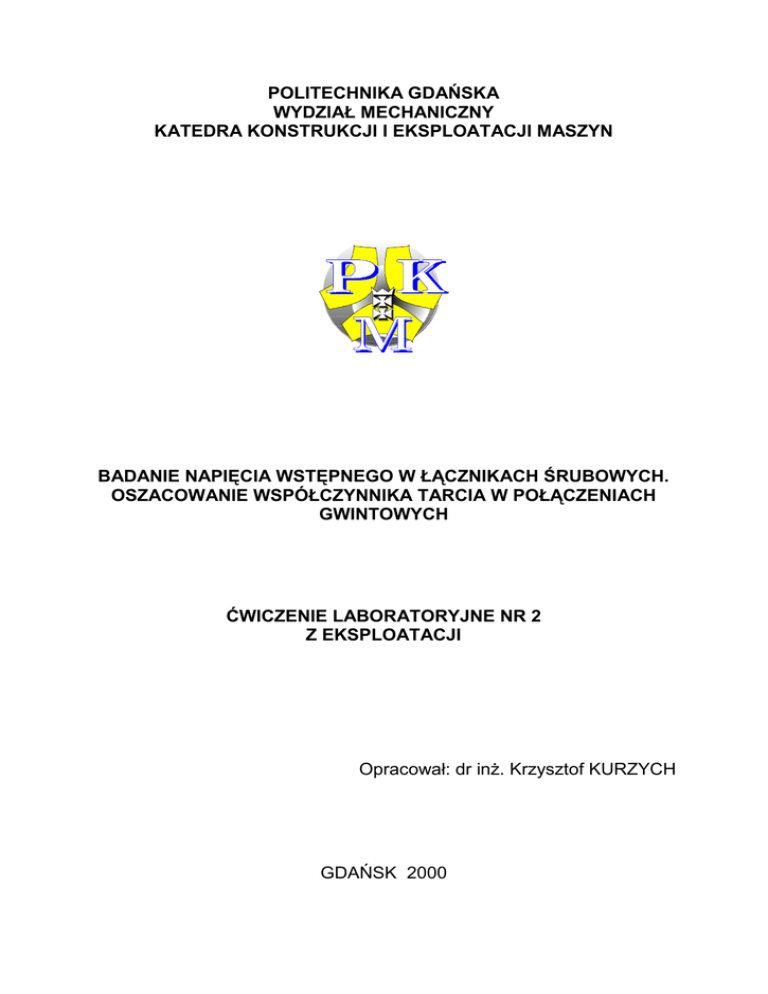 POLITECHNIKA GDAŃSKA WYDZIAŁ MECHANICZNY KATEDRA KONSTRUKCJI I EKSPLOATACJI MASZYN BADANIE NAPIĘCIA WSTĘPNEGO W ŁĄCZNIKACH ŚRUBOWYCH. OSZACOWANIE WSPÓŁCZYNNIKA TARCIA W POŁĄCZENIACH GWINTOWYCH ĆWICZENIE LABORATORYJNE NR 2 Z EKSPLOATACJI Opracował: dr inż. Krzysztof KURZYCH GDAŃSK 2000 1. CEL ĆWICZENIA. Celem ćwiczenia jest zapoznanie się z metodą badania siły w obciążonych złączach śrubowych oraz sposobem oszacowania współczynnika tarcia w połączeniu gwintowym. Poszerzenie i utrwalenie wiedzy na temat spoczynkowych połączeń śrubowych, ze szczególnym uwzględnieniem wpływu stanu powierzchni elementów śrubowych na rzeczywistą wartość siły w śrubie i moment dokręcania. 2. WPROWADZENIE DO ĆWICZENIA. Moment dokręcania złącza śrubowego oblicza się ze wzoru : Mn = M1 + M2 = 0,5 • P • dp • tg('+) + 0,5 • P •DT • Mn P dp p - moment przyłożony do nakrętki (łba śruby) siła rozciągająca śrubę średnica podziałowa śruby zredukowany kąt tarcia współczynnik tarcia ' = arctg = arctg - kąt wzniosu linii śrubowej = arctg h DT - [1] cos 2 h • dp [2] [3] skok gwintu średnia średnica styku nakrętki i elementu łączonego przyjmowana za średnicę, na której działa siła tarcia D0 + d0 DT = [4] 2 Rysunek 1. Model pojedynczego złącza śrubowego ze śrubą luźną. -3Po przekształceniu wzoru [1] wyznaczymy wartość siły w śrubie : P= 2 • Mn dp • tg( + ) + DT • [5] Pod wpływem siły P śruba wydłuży się o wartość LS, zgodnie z prawem Hooka: LS = • Ls = LS LS LC F E Cśr - • Ls E = P Ls P • = C E F śr [6] przyrost długości śruby wydłużenie względne swobodna długość śruby całkowita długość śruby pole przekroju poprzecznego śruby moduł sprężystości podłużnej (Younga) sztywność śruby Lc Ls Ls Rysunek 2. Model złącza obciążonego siłą P. Po podstawieniu wyrażenia [5] do [6] i przekształceniu otrzymamy wartość wydłużenia śruby LS : LS = 8 • M • Ls [dp • tg( + ) + DT • ] • • dr2 •E [7] gdzie: dr - średnica rdzenia śruby Różnice w wydłużeniu śrub wywołane momentem Mn są miernikiem rozrzutu siły rozciągającej śruby. Wyznaczona wartość wydłużenia pozwala na oszacowanie wartości współczynnika tarcia w połączeniu. Wartość współczynnika tarcia w połączeniach śrubowych zawiera się w szerokich granicach (0,05 0,4) i zależy od materiału, dokładności wykonania gwintu, stosowanego pokrycia galwanicznego, smarowania, stanu czystości powierzchni, chropowatości, wilgotności powietrza. Duży rozrzut współczynnika tarcia pociąga za sobą rozrzut wartości siły P. Polska Norma zaleca napinanie śrub blisko granicy plastyczności (około O,8Re). Zbyt małe napięcie wstępne w śrubie nie zapewnia poprawnych warunków pracy połączenia; zbyt duże, oprócz trwałego odkształcenia łączonych elementów może doprowadzić do zerwania śruby lub uszkodzenia -4nakrętki. Ze względu na duży rozrzut wartości współczynnika tarcia w połączeniu gwintowym konieczne jest zaproponowanie szybkiej metody, która w przybliżeniu pozwoli oszacować jego wartość. Jednym ze sposobów stabilizacji (zawężenia rozrzutu) współczynnika tarcia jest zastosowanie powłok. Powłoki nie tylko mają na celu zmianę współczynnika tarcia i jego stabilizację, ale także chronią powierzchnię przed wpływem atmosfery. Producenci oferują duży asortyment łączników z różnymi pokryciami na przykład: Cynkowo chromianowa Fe/Zn6 c Miedziowo niklowa Fe/Cu6 Ni3 b Kadmowo chromianowa Fe/Cd15 c Cynkowa Fe/Zn6 Tlenkowa wytworzona metodą elektrochemiczną Fe/An Fosforanowa nasycona olejem Fe/Fg Niklowo chromowa Cu/Ni6Cr1r itd. Wartość liczbowa oznacza grubość powłoki w m. Symbole literowe: c chromianowana, b błyszcząca, r chromowa zwykła, An anodowa. W oznaczeniach nie określa się grubości powłok tlenkowych i fosforanowych. Istnieje cała grupa powłok, które można wytworzyć bezpośrednio w procesie montażu, używając w tym celu różnych środków smarowych, np. oleje, smar z dwusiarczkiem molibdenu, smary plastyczne, smary plastyczne z dodatkiem grafitu lub pokrycia oferowane przez firmę Loctait, które mogą zabezpieczać także przed luzowaniem się połączeń. Stosowanie smarów i past, prócz zmniejszania współczynnika tarcia, powodują także zmniejszanie rozrzutu jego wartości. 3. OPIS ĆWICZENIA. Ćwiczenie jest wykonywane samodzielnie przez grupę pod nadzorem prowadzącego. Studenci przystępujący do ćwiczenia są zobowiązani do wcześniejszego zapoznania się z instrukcją oraz przypomnienie sobie wiadomości z połączeń gwintowych spoczynkowych. Przed ćwiczeniem należy obliczyć (w domu) wartość momentu jakim należy dokręcić śrubę M12; pozostałe parametry śruby: D = d = 12mm H = 1.75mm Dp = 10,863mm D0 = 18,05mm = 60° d0 = 13mm = 0,05 Prowadzący sprawdza przygotowanie studentów do wykonania ćwiczeń. -5- 3.1. Czynności przygotowawcze. Ćwiczenie należy przeprowadzić dla różnych rodzajów pokryć (minimum trzech). Rodzaje pokryć podaje prowadzący zajęcia. Czynności dla wybranego rodzaju pokrycia : Wykonać montaż połączeń (minimum trzech) śrub z wybranym pokryciem przez wstępne dokręcenie śrub ręką do oporu. W tym stanie bez napięcia wstępnego dokonujemy pomiaru długości śrub Ls. Otrzymane wyniki należy zanotować. Następnie dokręcić śruby kluczem dynamometrycznym. Należy szczególną uwagę zwrócić na sposób montażu połączenia. Nakrętkę należy dokręcać ze stałą prędkością, bez zatrzymań i szarpnięć. Po dokręceniu nakrętki powtórnie dokonujemy pomiaru długości śruby L c i notujemy otrzymane wyniki. Dla danej powłoki należy przeprowadzić analizę statystyczną pomiarów (patrz dodatek „Analiza statystyczna"). Czynności powtórzyć dla danego zestawu (z tą samą powłoką) dwukrotnie. Przeprowadzić dyskusję otrzymanych wyników. Wykonać spr