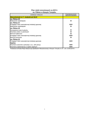 Plan robót remontowych na 2015 r os. Północ w Nowym Tomyślu. Przewidywany termin wykonania kwartalnie Lokalizacja / rodzaj prac Nieruchomość nr 7 - budynki od 18-23 os. Północ 20 Malowanie wiatrołapów os. Północ 21 Przegląd 5 letni wewnętrznej instalacji gazowej Malowanie wiatrołapów os. Północ 22 Docieplenie ścian budynku Wymiana okien w piwnicach Remont balkonów Przegląd 5 letni wewnętrznej instalacji gazowej Remont kominów os. Północ 23 Przegląd 5 letni wewnętrznej instalacji gazowej Ogólne: Wymiana zaworów cyrkulacji c.w.u. (64 piony) Wymiana ciepłomierza w węźle cieplnym III III/IV III III III III III/IV III III/IV III/IV III/IV Podstawa:Uchwała Rady Nadzorczej Spółdzielni Mieszkaniowej w Nowym Tomyślu nr 27 z dn. 23.06.2015 r. 1 02.09.2015 Plan robót remontowych na 2015 r os. Północ w Nowym Tomyślu. Przewidywany termin wykonania kwartalnie Lokalizacja / rodzaj prac Nieruchomość nr 50- budynek 24 os. Północ 24 Wymiana wodomierzy mieszkaniowych Legalizacja ciepłomierzy III III Podstawa:Uchwała Rady Nadzorczej Spółdzielni Mieszkaniowej w Nowym Tomyślu nr 53 z dn. 30.12.2014 r. 2 02.09.2015 Plan robót remontowych na 2015 r os. Północ w Nowym Tomyślu. Przewidywany termin wykonania kwartalnie Lokalizacja / rodzaj prac Nieruchomość nr 50- budynek 24 os. Północ 24 Wymiana wodomierzy mieszkaniowych Legalizacja ciepłomierzy III III Podstawa:Uchwała Rady Nadzorczej Spółdzielni Mieszkaniowej w Nowym Tomyślu nr 27 z dn. 23.06.2015 r. 3 02.09.2015 Plan robót remontowych na 2015 r os. Północ w Nowym Tomyślu. Przewidywany termin wykonania kwartalnie Lokalizacja / rodzaj prac Nieruchomość nr 8 - budynki od 26-29 os. Północ 26 Przegląd 5 letni wewnętrznej instalacji gazowej Remont kominów os. Północ 27 Przegląd 5 letni wewnętrznej instalacji gazowej os. Północ 28 Wymiana zaworów podpionowych z.w. c.w. i cyrkulacji na kulowe 16 pionów Przegląd 5 letni wewnętrznej instalacji gazowej Remont kominów os. Północ 29 Wymiana zaworów podpionowych z.w. c.w. i cyrkulacji na kulowe 14 pionów Remont kominów Wymiana pokrycia na wiatrołapach II III II I II III I III II Podstawa:Uchwała Rady Nadzorczej Spółdzielni Mieszkaniowej w Nowym Tomyślu nr 53 z dn. 30.12.2014 r. 4 02.09.2015 Plan robót remontowych na 2015 r os. Północ w Nowym Tomyślu. Przewidywany termin wykonania kwartalnie Lokalizacja / rodzaj prac Nieruchomość nr 8 - budynki od 26-29 os. Północ 26 Przegląd 5 letni wewnętrznej instalacji gazowej Remont kominów os. Północ 27 Przegląd 5 letni wewnętrznej instalacji gazowej Wymiana drzwi wejściowych do budynku os. Północ 28 Wymiana zaworów podpionowych z.w. c.w. i cyrkulacji na kulowe 16 pionów Przegląd 5 letni wewnętrznej instalacji gazowej Remont kominów os. Północ 29 Wymiana zaworów podpionowych z.w. c.w. i cyrkulacji na kulowe 14 pionów Remont kominów Wymiana pokrycia na wiatrołapach Wymiana ciepłomierza w węźle cieplnym Malowanie klatek schodowych i korytarzy piwnicznych Remont instalacji oświetlenia na klatkach schodowych Wymiana wewnętrznych drzwi wejściowych w wiatrołapach Ogólne: Opracowanie audytów energetycznych III/IV II III/IV III/IV I III/IV II I II III III III III III III Podstawa:Uchwała Rady Nadzorczej Spółdzielni Mieszkaniowej w Nowym Tomyślu nr 27 z dn. 23.06.2015 r. 5 02.09.2015 Plan robót remontowych na 2015 r os. Północ w Nowym Tomyślu. Przewidywany termin wykonania kwartalnie Lokalizacja / rodzaj prac Nieruchomość nr 9 - budynki od 31-36 os. Północ 31 Remont balkonów (10 szt.) Remont elewacji - miejscowy os. Północ 33 Opracowanie audytu energetycznego III III Docieplenie ścian budynku z wyłączeniem szczytu zachodniego Remont balkonów 20 szt. os. Północ 34 Opracowanie audytu energetycznego Opracowanie projektu budowlanego docieplenia os. Północ 35 Remont elewacji w obrębie klatek schodowych os. Północ 36 Wymiana wyłazu Remont schodów wejściowych Mycie szczytu północno-wschodniego I III III I II III II II II Podstawa:Uchwała Rady Nadzorczej Spółdzielni Mieszkaniowej w Nowym Tomyślu nr 53 z dn. 30.12.2014 r. 6 02.09.2015 Plan robót remontowych na 2015 r os. Północ w Nowym Tomyślu. Przewidywany termin wykonania kwartalnie Lokalizacja / rodzaj prac Nieruchomość nr 9 - budynki od 31-36 os. Północ 31 Remont balkonów (10 szt.) Remont elewacji - miejscowy os. Północ 33 Opracowanie audytu energetycznego III III Docieplenie ścian budynku z wyłączeniem szczytu zachodniego Remont balkonów 20 szt. Wymiana okien piwnicznych + wiatrołapy os. Północ 34 Opracowanie audytu energetycznego Opracowanie projektu budowlanego docieplenia os. Północ 35 Remont elewacji w obrębie klatek schodowych os. Północ 36 Wymiana wyłazu Remont schodów wejściowych Mycie szczytu północno-wschodniego Ogólne Wymiana ciepłomierza w węźle cieplnym Wymiana grzejników Faviera w pralniach i suszarniach I III III III I II III II III III III III/IV Podstawa:Uchwała Rady Nadzorczej Spółdzielni Mieszkaniowej w Nowym Tomyślu nr 27 z dn. 23.06.2015 r. 7 Plan robót remontowych na 2015 rok os. mieszkaniowe w Buku. Lokalizacja / rodzaj prac Przewidywany termin wykonania kwartalnie Nieruchomość nr 34 - budynki 1-4 os. Przyjaźni 2 Remont przykanalika kanalizacji deszczowej od strony budynku nr 3 os. Przyjaźni 3 II Montaż dodatkowej izolacji cieplnej na instalacji cyrkulacji c.w.u. w piwnicy os. Przyjaźni 4 II Montaż dodatkowej izolacji cieplnej na instalacji cyrkulacji c.w.u. w piwnicy Remont balkonów 16 szt. Ogólne: Wymiana wyłazów dachowych (bud nr 1-4) Remont zaplecza gospodarczego Drogowe: II II II III Wymiana trylinki na kostkę brukową na szczycie bud. 3 od strony miasta II Remont drogi i parkingu asfaltowego - szczyt bud. 2 i 3 - wymiana na kostkę brukową II Nieruchomość nr 35 - budynek nr 5 na os. Przyjaźni i budynek nr 4 ul. Sokoła os. Przyjaźni 5 Montaż dodatkowej izolacji cieplnej na instalacji cyrkulacji c.w.u. 