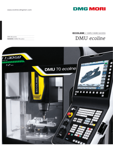 www.ecoline.dmgmori.com // SIMPLY MORE SUCCESS DMU 50 ecoline NOWOŚĆ // DMU 70 ecoline DMU ecoline Zalety obrabiarek Obrabiarka i technika Sterowanie Jakość / opcje i serwis Dane techniczne nowość dmu 70 ecoline DMU ecoline Wydajna i uniwersalna 5-stronna obróbka. Po sukcesie DMU 50 ecoline DMG MORI oferuje Państwu nowe DMU 70 ecoline, które jest kolejnym, niezwykle dokładnym centrum obróbkowym do obróbki 5-stronnej. Nowa obrabiarka DMU 70 ecoline daje użytkownikom możliwość obróbki większych detali. Prosty w obsłudze interface, pulpit obsługowy SLIMline®, do wyboru z Operate 4.5 ze sterowaniem SIEMENS 840D solutionline lub HEIDENHAIN TNC 620 sprawiają, że obrabiarki mogą być obsługiwane zarówno przez początkujących jak i profesjonalnych operatorów, zawsze z maksymalną wydajnością. Nieważne, z jakim sterowaniem – nasze obrabiarki gwarantują Państwu najszybszą drogę od rysunku do gotowego detalu; do Państwa dyspozycji jest bogata oferta wrzecion DMG MORI i nowoczesna technika napędów z posuwem szybkim 24 m/min. 02 Większa przejrzystość! Lampa sygnalizacyjna LED ++ Informuje o aktualnym statusie obróbki ++ Zwiększa bezpieczeństwo procesu wytwarzania i efektywność obróbki Więcej informacji o obróbce! Wyjątkowy wyświetlacz PROGRESSline ++ Produkcja pod kontrolą ++ Cyfrowy wyświetlacz czasu obróbki i liczby wykonanych sztuk z graficznym wskazaniem zaawansowania procesu Więcej zalet! LIGHTline ++ Element świetlny identyfikujący markę ++ Nowoczesne wzornictwo osłon zewnętrznych z wysoką ergonomią eksploatacji 1: wspornik wału korbowego (przemysł samochodowy), materiał: aluminium, wymiary: 125 × 95 × 62 mm 2: wspornik (przemysł samochodowy), materiał: aluminium, wymiary: 108 × 65 × 55 mm 1 2 Zalety ++ Największa elastyczność – 5-stronna obróbka prostych i skomplikowanych detali ++ Wysoka precyzja – sterowany NC, uchylno-obrotowy stół z cyfrowymi napędami ++ Wrzeciono frezarskie: 8.000 obr/min, 83 / 57 Nm i 13 / 9 kW (40 % / 100 % ED) lub 12.000 obr/min (DMU 70 ecoline), opcjonalnie elektrowrzeciono DMU 50 ecoline: 10.000 obr/min, 83 / 57 Nm i 13 / 9 kW (40 % / 100 % ED) ++ DMU 50 ecoline: 16-pozycyjny magazyn narzędziowy typu pick-up, opcjonalnie dostępny magazyn łańcuchowy o pojemności 30 narzędzi SK40, z podwójnym chwytakiem; DMU 70 ecoline: 32-pozycyjny magazyn narzędziowy już w wersji standardowej ++ Bezpośredni system pomiaru drogi (X / Y / Z)* i centralne smarowanie prowadnic wałeczkowych gwarancją dokładności i sztywności układu kinematycznego ++ Sterowanie 3D: 15"-monitor pulpitu obsługowego SLIMline® z Operate 4.5 ze sterowaniem SIEMENS 840D solutionline lub 15"-monitor SLIMline® z HEIDENHAIN TNC 620 ++ DMG SMARTkey® ++ DMG Netservice * opcja 03 Większy komfort obsługi! Pulpit obsługowy SLIMline® trzeciej generacji ++ E rgonomiczny pulpit obsługowy oferuje optymalny komfort obsługi. Powierzchnie pulpitu i monitora są odporne na zarysowania i charakteryzują się dużą trwałością użytkowania. Najlepsza kontrola procesu obróbki! Duża szyba ochronna ++ Optymalny wgląd do przestrzeni roboczej ++ Optymalne oświetlenie przestrzeni roboczej dzięki zastosowaniu nowoczesnej lampy ledowej PLANONlight, która pozwala na oszczędność energii Nowy design! Powierzchnie hightech ++ Proste w utrzymaniu powierzchnie, wykonane z materiałów odpornych na zarysowania, idealnie nadają się do codziennej eksploatacji Zalety obrabiarek Obrabiarka i technika Sterowanie Jakość / opcje i serwis Dane techniczne !!! dokładność DMU ecoline Nowoczesna technika gwarantująca optymalną obróbkę 5-stronną. Frezarskie centra obróbkowe serii DMU ecoline wyróżniają się niezwykłą stabilnością obróbki, osiągniętą dzięki nowoczesnej budowie suportu krzyżowego w konstrukcji C-Frame, ze zintegrowaną, sterowaną NC osią B i C oraz ze sztywnym żeliwnym korpusem, który w połączeniu z wałeczkowymi prowadnicami liniowymi dba o maksymalną precyzję i wysoką jakość obrobionych powierzchni. 1 Konstrukcja C-Frame z żeliwa szarego ++ Osie B / C zintegrowane w stole ++ Maksymalna sztywność kinematyczna oraz niewielkie wymiary obrabiarki 2 Oś Y 450 mm**, 600 mm*** Stabilność i dokładność 3 Oś Z 400 mm**, 520 mm*** ++ Liniowe prowadnice toczne (wałeczkowe) we wszystkich osiach oraz 4-punktowe podparcie korpusu łoża 04 ++ Największa wydajność skrawania w tej klasie obrabiarek; elektrowrzeciono chłodzone cieczą 4 3 4 Oś B –5 ° / +110 ° **, –10 ° / +95 ° *** Magazyn o pojemności 16 / 30* / 32 narzędzi ++ Magazyn typu pick-up (ilość narzędzi: 16) ++ Podwójny chwytak gwarancją szybkiej wymiany narzędzi (pojemność magazynu: 30* / 32 narzędzia) 5 Oś C ±360 ° 1 Nowoczesne sterowania ++ Z symulacją obróbki 3D i graficznym wsparciem na każdym etapie programowania 6 6 Oś X 500 mm**, 750 mm*** Mocne elektrowrzeciono 2 Dynamiczne napędy osi ++ Posuw szybki osi liniowych 24 m/min DMU 50 ecoline DMU 70 ecoline Droga przesuwu (X / Y / Z) mm 500 / 450 / 400 750 / 600 / 520 Max. prędkość obrotowa wrzeciona obr/min 8.000 / 10.000* 12.000 Max. moment obrotowy (40 / 100 %) ED Nm 83 / 57 83 / 57 Moc napędu (40 / 100 % ED) kW 13 / 9 13 / 9 Liczba narzędzi w magazynie Posuw szybki (X / Y / Z) m/min Max. obciążenie stołu kg Stół uchylno-obrotowy sterowany NC (oś B) ° * opcja, ** dane dotyczą DMU 50 ecoline, *** dane dotyczą DMU 70 ecoline 16 / 30* 32 24 / 24 / 24 24 / 24 / 24 200 350 –5 / +110 –10 / +95 5 Sterowany NC stół uchylno-obrotowy ++ Największa stabilność – hydrauliczny zacisk osi B i C ++ Bardzo duży zakres obrotu osi B – DMU 50 ecoline: od –5 ° do +110 ° i DMU 70 ecoline: od –10 ° do +95 °, (oś C: 360 °) ++ 5-stronna obróbka detali o wadze do 200 kg (DMU 50 ecoline) lub 350 kg (DMU 70 ecoline) w jednym mocowaniu ++ Wysoka dokładność pozycjono wania osi obrotowych zapewnia precyzyjną obróbkę detali ++ Opat