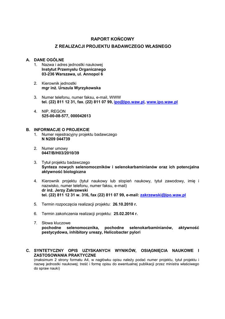 RAPORT KOŃCOWY Z REALIZACJI PROJEKTU BADAWCZEGO WŁASNEGO A. DANE OGÓLNE 1. Nazwa i adres jednostki naukowej Instytut Przemysłu Organicznego 03-236 Warszawa, ul. Annopol 6 2. Kierownik jednostki mgr inŜ. Urszula Wyrzykowska 3. Numer telefonu, numer faksu, e-mail, WWW tel. (22) 811 12 31, fax. (22) 811 07 99, [email protected], www.ipo.waw.pl 4. NIP, REGON 525-00-08-577, 000042613 B. INFORMACJE O PROJEKCIE 1. Numer rejestracyjny projektu badawczego N N209 044739 2. Numer umowy 0447/B/H03/2010/39 3. Tytuł projektu badawczego Synteza nowych selenomoczników i selenokarbaminianów oraz ich potencjalna aktywność biologiczna 4. Kierownik projektu (tytuł naukowy lub stopień naukowy, tytuł zawodowy, imię i nazwisko, numer telefonu, numer faksu, e-mail) dr inŜ. Jerzy Zakrzewski tel. (22) 811 12 31 w. 316, fax (22) 811 07 99, e-mail: [email protected] 5. Termin rozpoczęcia realizacji projektu: 26.10.2010 r. 6. Termin zakończenia realizacji projektu: 25.02.2014 r. 7. Słowa kluczowe pochodne selenomocznika, pochodne selenokarbaminianów, pestycydowa, inhibitory ureazy, Helicobacter pylori C. SYNTETYCZNY OPIS UZYSKANYCH ZASTOSOWANIA PRAKTYCZNE WYNIKÓW, OSIĄGNIĘCIA aktywność NAUKOWE I (maksimum 2 strony formatu A4, w nagłówku opisu naleŜy podać numer projektu, tytuł projektu i nazwę jednostki naukowej; treść i formę opisu do ewentualnej publikacji przez ministra właściwego do spraw nauki) Projekt nr N N209 044739 (nr umowy: 0447/B/H03/2010/39) pt. „Synteza nowych selenomoczników i selenokarbaminianów oraz ich potencjalna aktywność biologiczna” – Instytut Przemysłu Organicznego, Warszawa Opracowano nowy, skuteczny sposób otrzymywania izoselenocyjanianów metodą PTC (50% NaOH, czwartorzędowa sól amoniowa jako katalizator). Jako związek wyjściowy w tej metodzie zastosowano zarówno odpowiedni izonitryl jak i bezpośrednio odpowiednią aminę. Izoselenocyjaniany otrzymywano takŜe powszechnie stosowanymi metodami z izonitryli w reakcji z selenem w chloroformie, lub z selenem wobec trietyloaminy w THF. Metoda z zastosowaniem warunków PTC prowadziła do otrzymywania izoselenocyjanianów w sposób bardziej powtarzalny, niŜ np. metoda polegająca na selenizacji izonitryli w chloroformie. Niektóre izoselenocyjaniany udało się efektywnie otrzymać wyłącznie z izonitrylu stosując metodę PTC. W sumie otrzymano 12 izoselenocyjanianów. Z zsyntetyzowanych izoselenocyjanianów otrzymano 60 selenomoczników w reakcji z aminami pierwszo i drugorzędowymi oraz 28 selenokarbaminianów w reakcji z alkoholami. Budowę otrzymanych związków potwierdzono jednoznacznie metodami spektroskopowymi: EI MS, ESI MS, (niska i wysoka rozdzielczość), NMR (1H, 13C, 77Se), IR. Wykorzystując 22 bioindykatory, otrzymane związki oceniono pod kątem działania owadobójczego, przędziorkobójczego, chwastobójczego, bakteriostatycznego oraz grzybobójczego. Wysoką aktywność fungicydową wykazało 49 badanych związków. Szczególnie aktywne wobec grzybów – fitopatogenów roślin okazały się związki zawierające pięcioczłonowe rodniki nitroksylowe, pochodne 2,2,5,5-tetrametylopirrolidyny (21 związków) oraz wszystkie izoselenocyjaniany. Działanie bakteriostatyczne wykazały 34 badane związki, w tym 6 izoselenocyjanianów i 11 pochodnych pięcioczłonowych rodników nitroksylowych. Działanie przędziorkobójcze stwierdzono dla 10 związków, a insektobójcze jedynie dla 2. Aktywność chwastobójczą wykazało 7 związków. Spodziewając się odmiennych właściwości biologicznych, spośród otrzymywanych związków selenoorganicznych (zarówno izoselenocyjanianów jak i selenomoczników) wyodrębniono grupę związków zawierających w strukturze fragmenty nitroksylowe. Związki zawierające pięcioczłonowe ugrupowanie nitroksylowe (PROXYL) wykazały silne działanie grzybobójcze, a takŜe bakteriostatyczne. Otrzymane selenomoczniki i selenokarbaminiany oceniono pod kątem zdolności inhibicji ureazy wobec kwasu acetohydroksamowego jako inhibitora wzorcowego. Prawie wszystkie badane związki posiadają zdolność hamowania ureazy. Aktywność wyŜszą od wzorca stwierdzono dla 35 badanych związków. Szczególnie aktywne okazały się związki zawierające w swojej strukturze ugrupowanie adamantylowe. Ogólne struktury związków otrzymanych w projekcie wykazujących szczególną aktywność biologiczną. Związki wykazujące szczególną aktywność herbicydową Związki wykazujące szczególną aktywność fungicydową i/lub bakteriostatyczną Se HN Związki wykazujące szczególną zdolność do inhibicji ureazy Se Se N CH3 CH3 n HN N • O Y R2 R1 X Y R2 R1 R2 R1 1 R =H, R2= CH3 R1=CF3, R2=H n=0,1 ogólnie: Y=N,O R1,R2=alkil, cykloalkil, piperydyna, morfolina, rodniki nitroksylowe ogólnie: X,Y=N,O R1,R2=alkil, cykloalkil, piperydyna, morfolina, rodniki nitroksylowe Przewiduje się prezentację wyników projektu w: - publikacji opisującej nową metodę otrzymywania izoselenocyjanianów - publikacji opisujących właściwości pestycydowe otrzymanych związków - publikacji opisującej właściwości hamowania ureazy. Otrzymane związki oraz ich aktywność są przedmiotem dwóch zgłoszeń patentowych. Wyniki pracy zostały zaprezentowane na dwóch konferencjach. D. SPRAWOZDANIE MERYTORYCZNE (składane tylko w przypadku raportu końcowego, moŜe stanowić odrębny załącznik, nie dotyczy projektu promotorskiego) E. WYKONANE ZADANIA BADAWCZE WEDŁUG HARMONOGRAMU Lp. Nazwa zadania badawczego 1 2 Wykonawca zadania (jednostka naukowa) Termin zakończenia (miesiąc, rok) Koszty poniesione ze środków projektu (zł) Koszty poniesione łącznie (zł) 3 4 5 6 1 Synteza arylowych pochodnych selenomocznika. Synteza izonitryli z wyjściowych amin. Otrzymywanie izoselenocyjanianów – selenizacja otrzymanych nitryli. Otrzymywanie pochodnych selenomocznika i selenokarbaminianów – reakcja izoselenocyjanianów z aminami i alkoholami. Opcjonalne otrzymywanie pochodny