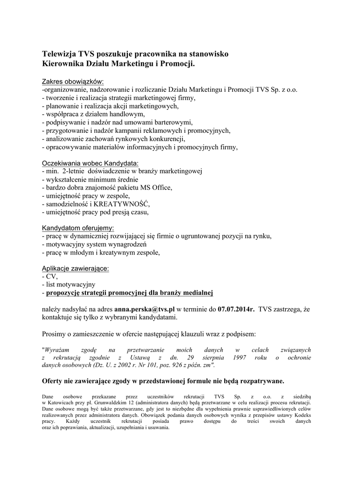 Telewizja TVS poszukuje pracownika na stanowisko Kierownika Działu Marketingu i Promocji. Zakres obowiązków: -organizowanie, nadzorowanie i rozliczanie Działu Marketingu i Promocji TVS Sp. z o.o. - tworzenie i realizacja strategii marketingowej firmy, - planowanie i realizacja akcji marketingowych, - współpraca z działem handlowym, - podpisywanie i nadzór nad umowami barterowymi, - przygotowanie i nadzór kampanii reklamowych i promocyjnych, - analizowanie zachowań rynkowych konkurencji, - opracowywanie materiałów informacyjnych i promocyjnych firmy, Oczekiwania wobec Kandydata: - min. 2-letnie doświadczenie w branży marketingowej - wykształcenie minimum średnie - bardzo dobra znajomość pakietu MS Office, - umiejętność pracy w zespole, - samodzielność i KREATYWNOŚĆ, - umiejętność pracy pod presją czasu, Kandydatom oferujemy: - pracę w dynamiczniej rozwijającej się firmie o ugruntowanej pozycji na rynku, - motywacyjny system wynagrodzeń - pracę w młodym i kreatywnym zespole, Aplikacje zawierające: - CV, - list motywacyjny - propozycję strategii promocyjnej dla branży medialnej należy nadsyłać na adres [email protected] w terminie do 07.07.2014r. TVS zastrzega, że kontaktuje się tylko z wybranymi kandydatami. Prosimy o zamieszczenie w ofercie następującej klauzuli wraz z podpisem: "Wyrażam zgodę na przetwarzanie moich danych z rekrutacją zgodnie z Ustawą z dn. 29 sierpnia danych osobowych (Dz. U. z 2002 r. Nr 101, poz. 926 z późn. zm". w celach 1997 roku o związanych ochronie Oferty nie zawierające zgody w przedstawionej formule nie będą rozpatrywane. Dane osobowe przekazane przez uczestników rekrutacji TVS Sp. z o.o. z siedzibą w Katowicach przy pl. Grunwaldzkim 12 (administratora danych) będą przetwarzane w celu realizacji procesu rekrutacji. Dane osobowe mogą być także przetwarzane, gdy jest to niezbędne dla wypełnienia prawnie usprawiedliwionych celów realizowanych przez administratora danych. Obowiązek podania danych osobowych wynika z przepisów ustawy Kodeks pracy. Każdy uczestnik rekrutacji posiada prawo dostępu do treści swoich danych oraz ich poprawiania, aktualizacji, uzupełniania i usuwania.