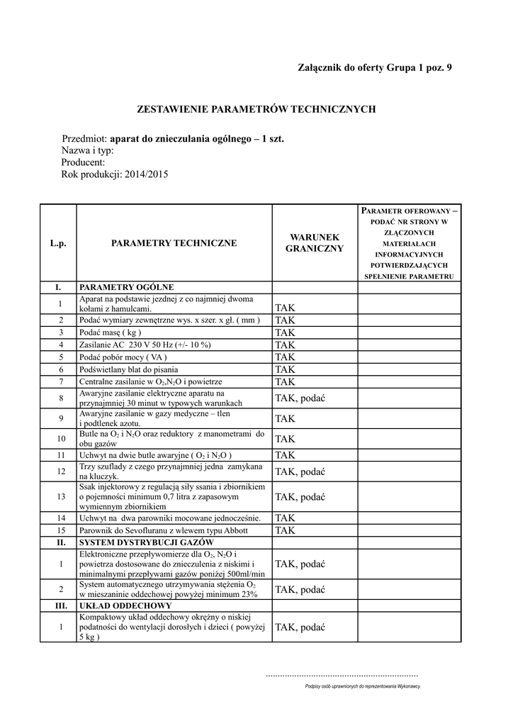 Załącznik do oferty Grupa 1 poz. 9 ZESTAWIENIE PARAMETRÓW TECHNICZNYCH Przedmiot: aparat do znieczulania ogólnego – 1 szt. Nazwa i typ: Producent: Rok produkcji: 2014/2015 PARAMETR OFEROWANY – PODAĆ NR STRONY W L.p. PARAMETRY TECHNICZNE WARUNEK GRANICZNY ZŁĄCZONYCH MATERIAŁACH INFORMACYJNYCH POTWIERDZAJĄCYCH SPEŁNIENIE PARAMETRU I. 1 2 3 4 5 6 7 8 9 10 11 12 13 14 15 II. 1 2 III. 1 PARAMETRY OGÓLNE Aparat na podstawie jezdnej z co najmniej dwoma kołami z hamulcami. Podać wymiary zewnętrzne wys. x szer. x gł. ( mm ) Podać masę ( kg ) Zasilanie AC 230 V 50 Hz (+/- 10 %) Podać pobór mocy ( VA ) Podświetlany blat do pisania Centralne zasilanie w O2,N2O i powietrze Awaryjne zasilanie elektryczne aparatu na przynajmniej 30 minut w typowych warunkach Awaryjne zasilanie w gazy medyczne – tlen i podtlenek azotu. Butle na O2 i N2O oraz reduktory z manometrami do obu gazów Uchwyt na dwie butle awaryjne ( O2 i N2O ) Trzy szuflady z czego przynajmniej jedna zamykana na kluczyk. Ssak injektorowy z regulacją siły ssania i zbiornikiem o pojemności minimum 0,7 litra z zapasowym wymiennym zbiornikiem Uchwyt na dwa parowniki mocowane jednocześnie. Parownik do Sevofluranu z wlewem typu Abbott SYSTEM DYSTRYBUCJI GAZÓW Elektroniczne przepływomierze dla O2, N2O i powietrza dostosowane do znieczulenia z niskimi i minimalnymi przepływami gazów poniżej 500ml/min System automatycznego utrzymywania stężenia O2 w mieszaninie oddechowej powyżej minimum 23% UKŁAD ODDECHOWY Kompaktowy układ oddechowy okrężny o niskiej podatności do wentylacji dorosłych i dzieci ( powyżej 5 kg ) TAK TAK TAK TAK TAK TAK TAK TAK, podać TAK TAK TAK TAK, podać TAK, podać TAK TAK TAK, podać TAK, podać TAK, podać ................................................................ Podpisy osób uprawnionych do reprezentowania Wykonawcy. 2 3 4 5 6 7 8 9 IV. 1 2 3 4 5 6 7 V. 1 2 3 4 5 VI. 1. 2. 3. 4. 5. 6. VII. 1 2 3 4 5 Możliwość prowadzenia wentylacji dzieci i dorosłych bez wymiany innego niż dreny układu pacjenta oprzyrządowania Układ oddechowy o prostej budowie, łatwy do wymiany i sterylizacji Obejście tlenowe ( BYPASS ) Możliwość stosowania układów półotwartych Ciśnieniowa zastawka bezpieczeństwa Wielorazowy pochłaniacz dwutlenku węgla o obudowie przeziernej z pojemnikiem z wapnem sodowanym Możliwość stosowania jednorazowych pochłaniaczy dwutlenku węgla Eliminacja gazów anestetycznych poza salę operacyjną TRYBY WENTYLACJI RESPIRATORA ANESTETYCZNEGO Respirator anestetyczny pracujący w układzie zamkniętym, półzamkniętym i otwartym o napędzie elektrycznym Tryb ręczny Oddech spontaniczny Wentylacja ciśnieniowo zmienna PCV Wentylacja objętościowo zmienna IPPV Nastawy ciśnienia PEEP w zakresie minimalnym od 4 do 20 cmH2O ( podać zakres ) Zastawka nadciśnieniowa ( podać zakres nastaw ) USTAWIENIA PARAMETRÓW Nastawy stosunku wdechu do wydechu min. 2:1 ÷ 1:4 ( podać zakres nastaw ) Nastawy częstości oddechu min. 4 ÷ 60 1/min ( podać zakres nastaw ) Nastawy objętości oddechowej min. 50 ÷ 1400 ml ( podać zakres nastaw ) Nastawy plateau wdechu: min. 10 ÷ 50% czasu wdechu ( podać zakres nastaw ) Nastawy ciśnienia wdechu min. 10 ÷ 60 hPa ( podać zakres nastaw ) ALARMY Niskiej minutowej objętości oddechowej Minimalnego i maksymalnego ciśnienia w drogach oddechowych Niskiej i wysokiej częstości oddechów Braku zasilania w energię elektryczna Braku zasilania lub niskiego ciśnienia gazów oddechowych Bezdechu PARAMETRY MIERZONE I OBRAZOWANE Stężenie tlenu w gazach oddechowych przy pomocy czujnika paramagnetycznego ( nie dopuszcza się czujnika galwanicznego ) Pomiar objętości wdechowej Pomiar objętości minutowej Pomiar ciśnienia szczytowego Pomiar ciśnienia plateau, TAK TAK TAK TAK TAK TAK TAK TAK TAK TAK TAK TAK TAK TAK, podać TAK, podać TAK TAK TAK TAK TAK TAK TAK TAK TAK TAK TAK TAK TAK TAK TAK TAK TAK TAK ................................................................ Podpisy osób uprawnionych do reprezentowania Wykonawcy. 6 7 8 9 10 11 VIII. 1 2 3 4 5 6 7 8 9 10 11 12 13 14 Pomiar ciśnienia średniego Pomiar ciśnienia PEEP Pomiar częstości oddychania Pomiar zawartości dwutlenku węgla w strumieniu wdechowym i wydechowym. Obrazowanie kapnogramu i wartości EtCO2. Zakres pomiarowy EtCO2 minimum 0 ÷ 9,9 kPa. Komplety jednorazowych linii pomiarowych – 20 szt. Pomiar stężenia środków anestetycznych w mieszaninie wdechowej i wydechowej dla: N2O, izofluranu, sevofluranu i desfluranu . Obrazowanie krzywej stężenia anestetyku wziewnego i wartości cyfrowej koncentracji. Oprogramowanie zawierające kalkulator parametrów MAC Prezentacja mierzonych parametrów gazów oddechowych (O2, CO2) i stężeń anestetyków wziewnych możliwa na ekranie monitora aparatu do znieczulenia lub ekranie monitora podstawowych funkcji życiowych. MONITOR PARAMETRÓW HEMODYNAMICZNYCH PARAMETRY OGÓLNE Monitor modułowy – pomiar parametrów realizowany za pomocą modułów Pojedynczy płaski medyczny ekran kolorowy LCD TFT o przekątnej min. 10" z możliwością konfiguracji ekranu oraz prezentacji przynajmniej sześciu krzywych (opisać) Obsługa monitora przez pokrętło i przyciski lub ekran dotykowy Zasilanie AC 230V 50 Hz ( +/- 10 % ) Alarmy 3-stopniowe ( wizualne i akustyczne ) wszystkich parametrów z możliwością zawieszenia czasowego i na stałe Element montażowy zapewniający wygodną i bezpieczną eksploatację monitora na aparacie bez konieczności podłączania przewodów zasilających. Monitor spełnia wymogi obowiązujących norm bezpieczeństwa Możliwość ręcznej zmiany poszczególnych parametrów pracy i granic alarmowych Układy alarmowe o różnych stopniach ważności. Ustawianie granic alarmowych wszystkich parametrów ręczne lub automatyczne. Pamięć alarmów Pamięć zdarzeń krytycznych Możliwość wyświetlania trendów wszystkich mierzonych parametrów, w postaci tablic i graficznie ( minimum 24 godziny ) Opr