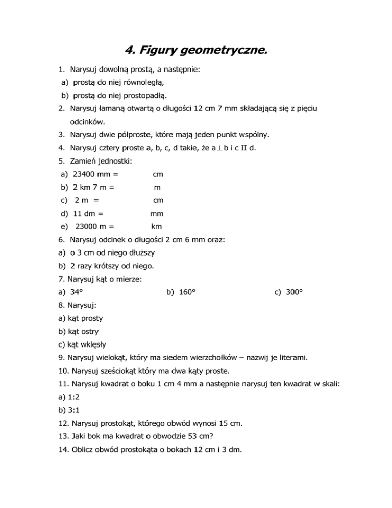 4. Figury geometryczne. 1. Narysuj dowolną prostą, a następnie: a) prostą do niej równoległą, b) prostą do niej prostopadłą. 2. Narysuj łamaną otwartą o długości 12 cm 7 mm składającą się z pięciu odcinków. 3. Narysuj dwie półproste, które mają jeden punkt wspólny. 4. Narysuj cztery proste a, b, c, d takie, że a b i c II d. 5. Zamień jednostki: a) 23400 mm = cm b) 2 km 7 m = m c) 2 m = cm d) 11 dm = mm e) 23000 m = km 6. Narysuj odcinek o długości 2 cm 6 mm oraz: a) o 3 cm od niego dłuższy b) 2 razy krótszy od niego. 7. Narysuj kąt o mierze: a) 34° b) 160° c) 300° 8. Narysuj: a) kąt prosty b) kąt ostry c) kąt wklęsły 9. Narysuj wielokąt, który ma siedem wierzchołków – nazwij je literami. 10. Narysuj sześciokąt który ma dwa kąty proste. 11. Narysuj kwadrat o boku 1 cm 4 mm a następnie narysuj ten kwadrat w skali: a) 1:2 b) 3:1 12. Narysuj prostokąt, którego obwód wynosi 15 cm. 13. Jaki bok ma kwadrat o obwodzie 53 cm? 14. Oblicz obwód prostokąta o bokach 12 cm i 3 dm. 15. Obwód prostokąta wynosi 40 cm. Jaka długość ma krótszy bok, jeśli dłuższy ma 12 cm? 16. Narysuj okrąg o promieniu 3 cm 2 mm. Zaznacz w nim promień, średnicę oraz kilka cięciw. Jaką długość ma średnica tego okręgu? 17. W jakiej skali wykonano mapę, jeśli 1 cm na mapie odpowiada 3 km w rzeczywistości? 18. Obraz ma wymiary 3 m x 2 m. Jakie będzie miał wymiary ten obraz na planie wykonanym w skali 1:100? 19. Podaj rzeczywiste wymiary budynku narysowanego poniżej, jeśli skala wynosi 1: 2000. 20. Czy wystarczy 3 m tasiemki aby obszyć obrus w kształcie kwadratu o boku 1m 35 cm?