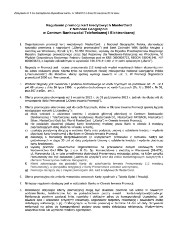 Załącznik nr 1 do Zarządzenia Dyrektora Banku nr 34/2012 z dnia 29 sierpnia 2012 roku Regulamin promocji kart kredytowych MasterCard z National Geographic w Centrum Bankowości Telefonicznej i Elektronicznej 1. Organizatorem promocji kart kredytowych MasterCard z National Geographic Polska, stanowiącej sprzedaŜ premiową z nagrodami („Oferta promocyjna”) jest Bank Zachodni WBK Spółka Akcyjna z siedzibą we Wrocławiu, Rynek 9/11, 50-950 Wrocław, wpisany do Rejestru Przedsiębiorców Krajowego Rejestru Sądowego prowadzonego przez Sąd Rejonowy dla Wrocławia-Fabrycznej we Wrocławiu, VI Wydział Gospodarczy Krajowego Rejestru Sadowego pod nr KRS 0000008723, REGON 930041341, NIP 896005673, o kapitale zakładowym w wysokości 746.376.310,00 zł w pełni opłaconym („Bank”). 2. Nagrodą w Promocji jest roczna prenumerata (12 kolejnych wydań wysyłanych listem ekonomicznym na adres wskazany przez Klienta tylko na terytorium Polski) miesięcznika National Georgaphic Polska („Prenumerata”) dla Klientów, którzy spełnią wymogi zawarte w ust. 5. W Promocji Organizator przewidział 2000 szt. Prenumerat. 3. Wartość Nagrody jest zwolniona z podatku dochodowego od osób fizycznych na podstawie art. 21 ust.1 pkt 68 ustawy z dnia 26 lipca 1991r. o podatku dochodowym od osób fizycznych (Dz. U z 2010 r. Nr 51, poz.307 z późn. zm.). 4. Oferta promocyjna obowiązuje od 1 września 2012 r. do 31 października 2012 r. jednak nie dłuŜej niŜ do wyczerpania ilości Prenumerat („Okres trwania Promocji”). 5. Oferta promocyjna skierowana jest do osób fizycznych, które w Okresie trwania Promocji spełnią łącznie następujące warunki („Uczestnicy”): a) złoŜą wniosek o udzielenie kredytu i wydanie głównej płatniczej w Centrum Bankowości Elektronicznej i Telefonicznej karty kredytowej MasterCard<30, MasterCard PAYBACK, MasterCard Silver, MasterCard Gold lub World MasterCard („Karta”) w Okresie trwania Promocji, b) nie posiadały dowolnej głównej karty kredytowej wydanej przez Bank w okresie 3 miesięcy poprzedzających datę złoŜenia wniosku o Kartę, c) uzyskają pozytywną decyzję o wydaniu Karty oraz podpiszą umowę o udzielenie kredytu i wydanie płatniczej karty kredytowej z Bankiem w Okresie trwania Promocji, d) dokonają 6 transakcji bezgotówkowych (z wyłączeniem przelewów z rachunku Karty) lub gotówkowych w ciągu 30 dni od daty podpisania Umowy o udzielenie kredytu i wydanie płatniczej karty kredytowej, e) wyraŜą pisemne upowaŜnienie Organizatorowi na przekazanie danych osobowych firmie Wydawnictwo G+J RBA Sp. z o.o. & Co. Sp. Komandytowa z siedzibą w Warszawie (02-674), ul. Marynarska 15, w celu umoŜliwienia dystrybucji Prenumeraty wskazując adres, na który wysyłka Prenumeraty ma być dokonana („Adres do wysyłki”) oraz dla celów marketingowych związanych z ofertami Towarzystwa National Geographic, f) Klient zobowiązuje się posiadać Kartę do zakończenia trwania Prenumeraty (12 miesięcy Prenumeraty), w przypadku rezygnacji z Karty Prenumerata zostanie wstrzymana, g) Promocja nie łączy się z innymi promocjami dot. kart kredytowych MasterCard. 6. Oferta promocyjna nie zmienia warunków cenowych Karty zgodnych z Tabelą Opłat i Prowizji. 7. Niniejszy regulamin dostępny jest w oddziałach Banku w Okresie trwania Promocji. 8. Reklamacje dotyczące Oferty promocyjnej mogą być składane pisemnie lub ustnie w dowolnym oddziale Banku, telefonicznie lub za pośrednictwem poczty e-mail : [email protected]. Reklamacje powinny zawierać imię, nazwisko i dokładny adres do korespondencji Uczestnika, jak równieŜ opis i wskazanie przyczyny reklamacji. Organizator rozpatrzy reklamację i powiadomi osobę składającą reklamację o jej rozstrzygnięciu w formie pisemnej w terminie 14 dni od daty otrzymania reklamacji na adres do korespondencji podany przez osobę składającą reklamację. Wydawnictwo uzupełnia braki lub wymienia wadliwy egzemplarz. 9. Bank Zachodni WBK S.A. z siedzibą we Wrocławiu (50-950), Rynek 9/11, jako Organizator informuje, Ŝe w Okresie trwania Promocji dane osobowe Uczestników będą przetwarzane wyłącznie w celu: realizacji promocji, wyłonienia zwycięzców, doręczenia nagród oraz dla celów marketingowych związanych z ofertami Towarzystwa National Geographic. Podanie danych jest dobrowolne, uczestnikowi przysługuje prawo dostępu do danych oraz ich poprawiania. 10. Właściwym dla Banku organem nadzoru jest Komisja Nadzoru Finansowego. 11. Uczestnik moŜe zwrócić się o bezpłatną pomoc prawną do Miejskich lub Powiatowych Rzeczników Konsumenta. 12. Spory pomiędzy Uczestnikiem a Bankiem mogą być rozstrzygane polubownie przed Arbitrem Bankowym przy Związku Banków Polskich, o ile wartość przedmiotu sporu nie jest wyŜsza niŜ 8000 zł. 13. Bank zastrzega sobie prawo do przedłuŜenia niniejszej Oferty promocyjnej. 14. W sprawach nieuregulowanych niniejszym Regulaminem mają zastosowanie powszechnie obowiązujące przepisy prawa. Oświadczam, Ŝe akceptuję zasady Oferty promocyjnej. UpowaŜniam Bank Zachodni WBK Spółka Akcyjna z siedzibą Wrocław, Rynek 9/11 do przekazania moich danych osobowych objętych tajemnicą bankową (imienia,, nazwiska, adresu do wysyłki): ……………………………………………………… …………………………………………………….. …………………………………………………….. firmie Wydawnictwo G+J RBA Sp. z o.o. & Co. Sp. Komandytowa z siedzibą w Warszawie (02-674), ul. Marynarska 15 w celu umoŜliwienia dystrybucji Prenumeraty na wyŜej wskazany adres oraz dla celów marketingowych związanych z ofertami Towarzystwa National Geographic. Z chwilą przekazania danych, administratorem danych Prenumeratorów staje się Wydawnictwo G+J RBA Sp. z o.o. & Co. Sp. Komandytowa, który informuję, iŜ dane osobowe są chronione zgodnie z Ustawą o Ochronie Danych Osobowych (tj. Dz. U. z 2002r Nr 101, poz. 926