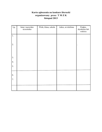 Karta zgłoszenia na konkurs literacki organizowany przez T M Z K listopad 2013 Lp. Imię i nazwisko uczestnika Wiek, klasa, szkoła Adres, nr telefonu Podpis, dyrektora lub rodzica 1. 2. 3. 4. 5. 6. 7. .