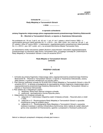 projekt grudzień 2014 r. Uchwała Nr .................. Rady Miejskiej w Tarnowskich Górach z dnia ..................... w sprawie uchwalenia zmiany fragmentu miejscowego planu zagospodarowania przestrzennego Dzielnicy Bobrowniki Śl. - Wschód w Tarnowskich Górach, w rejonie ul. Kazimierza Odnowiciela. Na podstawie art. 18 ust. 2 pkt 5, art. 40 ust. 1 i art. 41 ust.1 ustawy z dnia 8 marca 1990 r. o samorządzie gminnym (tekst jednolity Dz. U. z 2013 r., poz. 594 z późn. zm.) oraz art. 20 ust. 1, art. 27 ustawy z dnia 27 marca 2003 r. o planowaniu i zagospodarowaniu przestrzennym (tekst jednolity Dz. U. z 2012 r. poz. 647 z późn. zm.), na wniosek Burmistrza Miasta Tarnowskie Góry po stwierdzeniu braku naruszenia ustaleń Studium uwarunkowań i kierunków zagospodarowania przestrzennego na obszarze całej Gminy Tarnowskie Góry, przyjętego Uchwałą Nr LXII/619/2014 Rady Miejskiej w Tarnowskich Górach z dnia 24 września 2014 r. Rada Miejska w Tarnowskich Górach uchwala: I. PRZEPISY OGÓLNE §1 1. Uchwala się zmianę fragmentu miejscowego planu zagospodarowania przestrzennego Dzielnicy Bobrowniki Śl. - Wschód w Tarnowskich Górach, w rejonie ul. Kazimierza Odnowiciela, zwaną dalej planem, w granicach określonych na rysunku planu. 2. Plan stanowi realizację uchwały Nr XLIX/501/2013 Rady Miejskiej w Tarnowskich Górach z dnia 25 września 2013 r. w sprawie przystąpienia do sporządzenia zmiany fragmentu miejscowego planu zagospodarowania przestrzennego Dzielnicy Bobrowniki Śl. – Wschód w Tarnowskich Górach w rejonie ul. Kazimierza Odnowiciela. 3. Plan składa się z integralnych części: 1) tekstowej, której treść stanowi niniejsza uchwała, 2) graficznej - sporządzonej w formie Rysunku planu. 4. Załącznikami do niniejszej uchwały są: 1) załącznik nr 1 stanowiący integralną część niniejszej uchwały – Rysunek planu w skali 1:1000, 2) załącznik nr 2 - Rozstrzygnięcie Rady Miejskiej w Tarnowskich Górach o sposobie rozpatrzenia uwag do projektu planu, 3) załącznik nr 3 - Rozstrzygnięcie Rady Miejskiej w Tarnowskich Górach o sposobie realizacji inwestycji z zakresu infrastruktury technicznej, które należą do zadań własnych gminy oraz zasadach ich finansowania, zgodnie z przepisami o finansach publicznych. §2 Ilekroć w dalszych przepisach niniejszej uchwały jest mowa o: 1 1) 2) 3) 4) 5) 6) 7) 8) 9) 10) 11) uchwale - należy przez to rozumieć niniejszą uchwałę Rady Miejskiej w Tarnowskich Górach, o ile z treści przepisu nie wynika inaczej, planie- należy przez to rozumieć niniejszą zmianę miejscowego planu zagospodarowania przestrzennego wg ustaleń § 1 ust. 1 niniejszej uchwały, ustawie lub ustawie o planowaniu i zagospodarowaniu przestrzennym- należy przez to rozumieć ustawę z dnia 27 marca 2003 r. o planowaniu i zagospodarowaniu przestrzennym (tekst jednolity Dz. U. z 2012 r. poz. 647 z późn. zm.), rysunku planu - należy przez to rozumieć rysunek planu, o którym mowa w § 1 ust. 4 pkt 1 niniejszej uchwały, terenie- należy przez to rozumieć teren o określonym przeznaczeniu i zasadach zagospodarowania wydzielony na rysunku planu liniami rozgraniczającymi i oznaczony symbolem literowym i cyfrowym, dla którego ustalenia określa niniejsza uchwała, nieprzekraczalnej linii zabudowy – należy przez to rozumieć linię oznaczoną na rysunku planu określającą minimalną odległość zabudowy od linii rozgraniczającej, dachach spadzistych - należy przez to rozumieć dachy: dwuspadowe, wielospadowe, mansardowe, o kącie nachylenia połaci dachowych 25-45°, dachach płaskich – należy przez to rozumieć dachy o kącie nachylenia połaci dachowych nie większym niż 12°, wysokości zabudowy – należy przez to rozumieć: a) wysokość budynków, b) wysokość obiektów budowlanych innych niż budynki – mierzoną od średniego poziomu terenu na obrysie obiektu do najwyżej położonej części tego obiektu, powierzchni całkowitej zabudowy – należy przez to rozumieć sumę powierzchni całkowitych wszystkich kondygnacji wszystkich budynków znajdujących się na działce budowlanej, usługach nieuciążliwych – należy przez to rozumieć usługi służące zaspokojeniu podstawowych potrzeb ludności, z wyłączeniem: a) usług związanych z wytwarzaniem dóbr materialnych, a także ze składowaniem lub magazynowaniem, b) zakładów rzemieślniczych o profilu produkcyjnym, c) usług związanych z obsługą pojazdów takich jak stacje paliw, myjnie samochodowe, warsztaty, lakiernie i serwisy samochodowe, d) usług stanowiących przedsięwzięcia określane jako mogące znacząco oddziaływać na środowisko. §3 W rysunku planu obowiązują następujące oznaczenia graficzne: 1) granica obszaru objętego planem, 2) określenie skali rysunku planu, w formie liczbowej i liniowej, 3) linie rozgraniczające tereny o różnym przeznaczeniu lub różnych zasadach zagospodarowania, 4) symbole literowe i cyfrowe identyfikujące tereny o różnym przeznaczeniu lub różnych zasadach zagospodarowania, 5) nieprzekraczalne linie zabudowy, II. PRZEPISY SZCZEGÓŁOWE §4 Ustalenia dotyczące przeznaczenia terenów, zasad kształtowania zabudowy oraz wskaźników zagospodarowania terenu. 1.Wyznacza się tereny zabudowy mieszkaniowej jednorodzinnej, oznaczone na rysunku planu symbolami 1MN, 2MN i ustala się ich przeznaczenie oraz zasady zagospodarowania: 1) Przeznaczenie terenu: a) zabudowa mieszkaniowa jednorodzinna, 2) Dopuszcza się: 2 a) usługi nieuciążliwe w formie lokali użytkowych w budynkach mieszkalnych jednorodzinnych, b) altany i wiaty o powierzchni rzutu poziomego zewnętrznego obrysu dachu nie większej niż 40m2, przy czym łączna powierzchnia rzutów poziomych zewnętrznych obrysów dachów wszystkich altan i wiat znajdujących się na działce budowlanej nie może przekraczać 15% powierzchni tej działki, 3) Zasady kształtowania zabudowy oraz wskaźniki zagospodarowania terenu: a) dla terenu 1MN ust