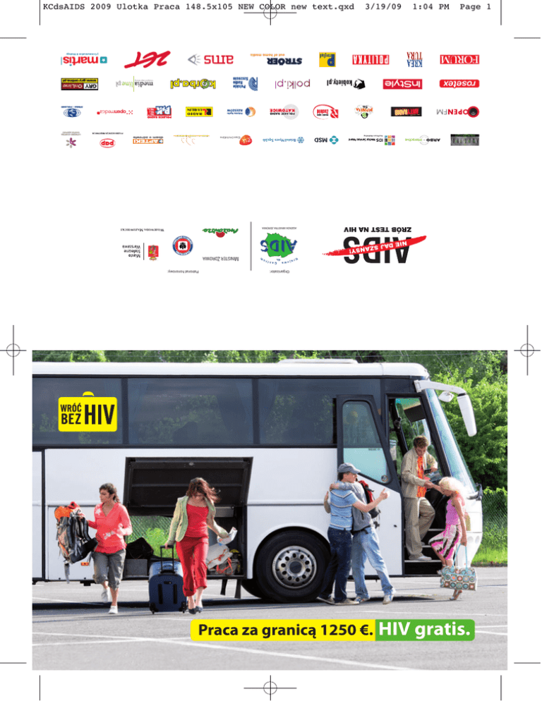 KCdsAIDS 2009 Ulotka Praca 148.5x105 NEW COLOR new text.qxd 3/19/09 1:04 PM Page 1 AGENDA MINISTRA ZDROWIA WOJEWODA MAZOWIECKI MINISTER ZDROWIA Organizator: Patronat honorowy: Praca za granicą 1250 €. HIV gratis. KCdsAIDS 2009 Ulotka Praca 148.5x105 NEW COLOR new text.qxd 3/19/09 1:04 PM Wyjeżdżasz? Wspaniale! Nowe miejsca. Nowe przygody. Jak uniknąć zakażenia HIV: Chroń siebie i swoich bliskich. • używaj jednorazowych, sterylnych igieł Page 2 • używaj tylko własnych przyborów kosmetycznych, np. żyletek i sprzętu do golenia i depilacji, • przekłuwaj uszy, wykonuj zabiegi kosmetyczne i tatuaż tylko w specjalistycznych gabinetach, i strzykawek, • unikaj narkotyków i uważaj, żeby ktoś Ci ich nie podał, • bądź wierny partnerowi i wymagaj wierności od partnera, • przypadkowe kontakty seksualne są ryzykowne – Twój nowy partner może być zakażony HIV, • jeśli piłeś alkohol, poczekaj z seksem, • pamiętaj, że prezerwatywa zmniejsza ryzyko zakażenia HIV, • jeśli zachowałeś się ryzykownie – zrób test na HIV. Całodobowy telefon zaufania AIDS: 022 692 82 26 Poradnia internetowa: www.aids.gov.pl