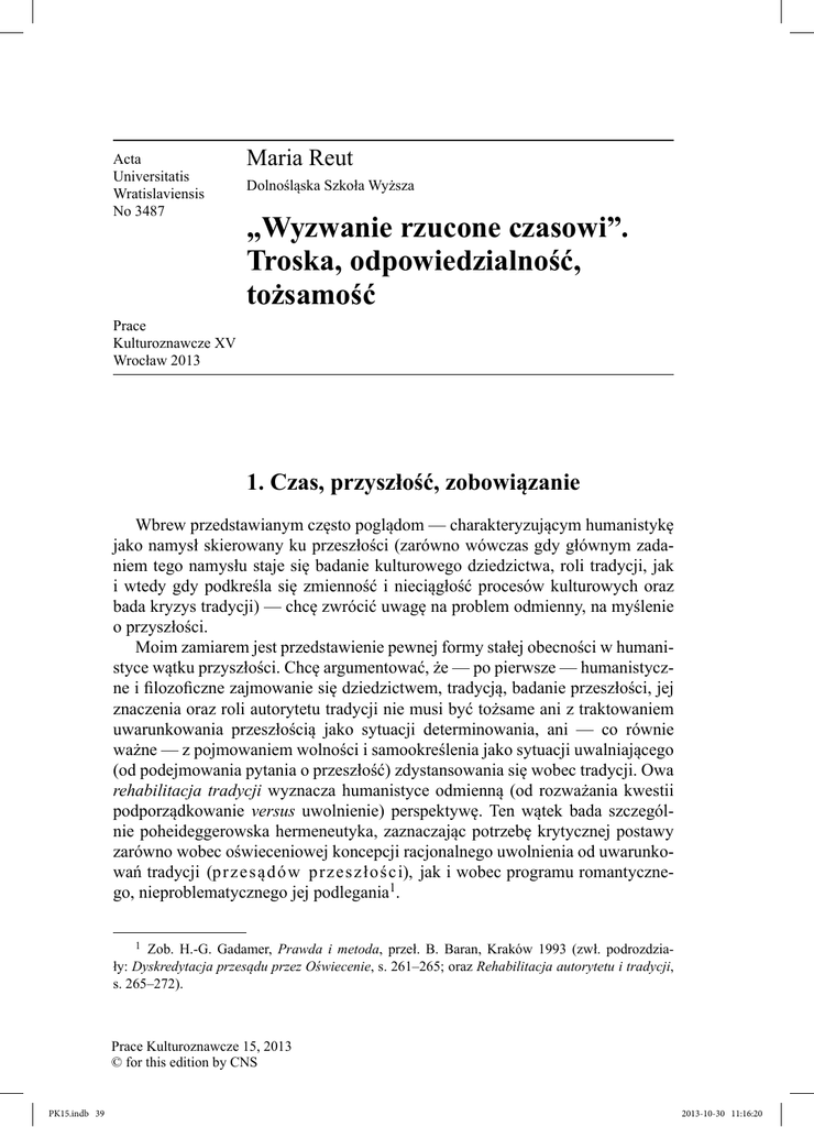Acta Universitatis Wratislaviensis No 3487 Maria Reut Dolnośląska Szkoła Wyższa „Wyzwanie rzucone czasowi”. Troska, odpowiedzialność, tożsamość Prace Kulturoznawcze XV Wrocław 2013 1. Czas, przyszłość, zobowiązanie Wbrew przedstawianym często poglądom — charakteryzującym humanistykę jako namysł skierowany ku przeszłości (zarówno wówczas gdy głównym zadaniem tego namysłu staje się badanie kulturowego dziedzictwa, roli tradycji, jak i wtedy gdy podkreśla się zmienność i nieciągłość procesów kulturowych oraz bada kryzys tradycji) — chcę zwrócić uwagę na problem odmienny, na myślenie o przyszłości. Moim zamiarem jest przedstawienie pewnej formy stałej obecności w humanistyce wątku przyszłości. Chcę argumentować, że — po pierwsze — humanistyczne i filozoficzne zajmowanie się dziedzictwem, tradycją, badanie przeszłości, jej znaczenia oraz roli autorytetu tradycji nie musi być tożsame ani z traktowaniem uwarunkowania przeszłością jako sytuacji determinowania, ani — co równie ważne — z pojmowaniem wolności i samookreślenia jako sytuacji uwalniającego (od podejmowania pytania o przeszłość) zdystansowania się wobec tradycji. Owa rehabilitacja tradycji wyznacza humanistyce odmienną (od rozważania kwestii podporządkowanie versus uwolnienie) perspektywę. Ten wątek bada szczególnie poheideggerowska hermeneutyka, zaznaczając potrzebę krytycznej postawy zarówno wobec oświeceniowej koncepcji racjonalnego uwolnienia od uwarunkowań tradycji (prze są dów prze szł oś ci), jak i wobec programu romantycznego, nieproblematycznego jej podlegania1. 1 Zob. H.-G. Gadamer, Prawda i metoda, przeł. B. Baran, Kraków 1993 (zwł. podrozdziały: Dyskredytacja przesądu przez Oświecenie, s. 261–265; oraz Rehabilitacja autorytetu i tradycji, s. 265–272). Prace Kulturoznawcze 15, 2013 © for this edition by CNS PK15.indb 39 2013-10-30 11:16:20 40 Maria Reut Rozumienie przeszłości, tradycji nie zakłada bowiem w ramach tej orientacji — jak wiemy — ani projektu oswojenia inności, pełnego jej zrozumienia, ani poddania się jej „tajemniczości”. Kategorie dialogu i interpretacji określają rodzaj obcowania z tradycją. Obcowanie to jest aktywnością, jest procesem. W tej sytuacji podmiot owego uznania nie obcuje z zewnętrznym wobec niego przedmiotem. Takie pojmowanie przeszłości kieruje też ku odmiennemu myśleniu o przyszłości. Po drugie — podkreślana współcześnie zmienność i procesualność kultury oraz jej zróżnicowanie, a także nasza ostrożność i nieufność wobec prób przewidywania przyszłości nie muszą czynić namysłu nad nią bezprzedmiotowym czy utopijnym. Skierowanie refleksji na problem relacji przeszłość/przyszłość może być powiązane z zamiarami odmiennymi niż dążenie do utrwalenia przeszłości, pełnego jej zrozumienia, opisania jako (na przykład moralnego) wzoru, czerpania z niej mądrości, ufnego powielania, chronienia dziedzictwa, pilnowania nienaruszalności. Innymi także niż — przeciwstawna tym dążeniom, między innymi oświeceniowa — tendencja do uwolnienia się od autorytetu tradycji. Innymi ponadto niż scjentystycznie uwarunkowana intencja przewidywania przyszłości, jej opanowania, uczynienia znaną, przyjazną lub podporządkowaną teraźniejszym celom, która to intencja powiązana bywa z planami budowania nowego świata. Zawiedzione nadzieje scjentystycznych planów nie muszą łączyć się z unieważnieniem namysłu nad przyszłością. Przyszłość może być interpretowana jako horyzont zobowiązania. Zobowiązania niesprowadzalnego jednak — sprecyzujmy jeszcze raz — ani do krytycznego osądu współczesności (czy przeszłości) i wynikającego z tej analizy systemu przestróg, pouczeń czy projektów zmiany społecznej, ani do zadania przechowania wartości. Kategorie troski, odpowiedzialności występują tu w innych kontekstach etycznych. Jest to (po zwrocie etycznym) etyczność świadoma uwikłania w dramat (również w dramat tradycji, autorytetu). Myślenie etyczne to myślenie otwarte na przyszłość w takim znaczeniu, że dramatyczne wyzwanie czasowości, dramat odpowiedzialności znajdują się w centrum namysłu etycznego i myślenia o tożsamości. Ten problem chcę zasygnalizować, podejmując interpretację wybranych kwestii takich autorów, jak: Hannah Arendt (bycie między czasem minionym a przyszłym; dramatyczny charakter odnawiania świata), Paula Ricoeura (wyzwanie rzucone czasowi) oraz Marthy Nussbaum (dramat i wyobraźnia narracyjna; światowe obywatelstwo). Tak szeroko zarysowany temat rozważań dotyczących relacji: czas, tożsamość, samorozumienie, odpowiedzialność, dramatyczność wymaga — w ramach tej wypowiedzi — zawężenia i sprecyzowania. Tekst ten stanowi fragment większego opracowania2. Skoncentruję się na wybranych problemach z tego rozległego obszaru, sytuując je w kontekście zróżnicowanych współczesnych filozoficznych debat na temat tożsamości, rozumienia i dramatyczności doświadczenia. 2 M. Reut, Tożsamość i odpowiedzialność (w opracowaniu). Prace Kulturoznawcze 15, 2013 © for this edition by CNS PK15.indb 40 2013-10-30 11:16:20 „Wyzwanie rzucone czasowi”. Troska, odpowiedzialność, tożsamość 41 Tytułowe kategorie czasu (przyszłości/przeszłości), troski, odpowiedzialności mogą być charakteryzowane w powiązaniu z pytaniami o współczesną tożsamość. Takimi pytaniami, które kierują ku badaniu ważnych związków w tej dziedzinie, są podejmowane w obszarze współczesnej (ontologicznej) hermeneutyki pytania o tożsamość narracyjną. Tu bowiem kwestie czasu, podmiotowości, samorozumienia, dramatyczności doświadczenia, odpowiedzialności, wyobraźni, narracji w specyficzny sposób się łączą. Tym właśnie fragmentem — szeroko ujętego w tytule zagadnienia — chcę się zająć. Jest to połączenie specyficzne. Badacze zagadnień h