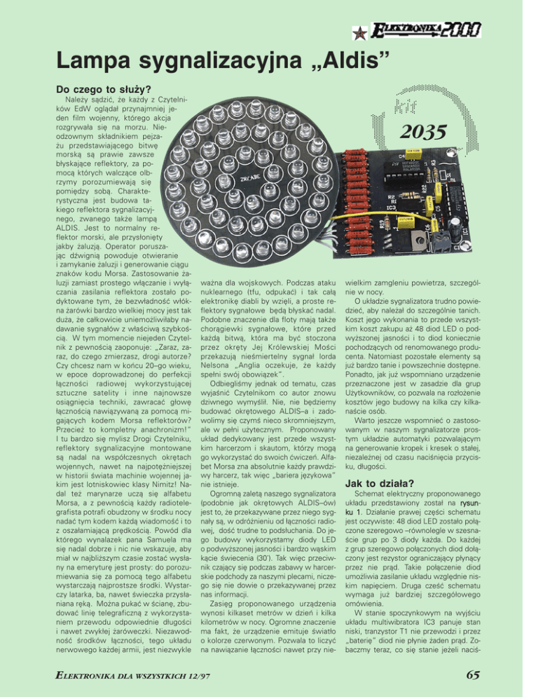 Lampa sygnalizacyjna „Aldis” Do czego to służy? Należy sądzić, że każdy z Czytelni− ków EdW oglądał przynajmniej je− den film wojenny, którego akcja rozgrywała się na morzu. Nie− odzownym składnikiem pejza− żu przedstawiającego bitwę morską są prawie zawsze błyskające reflektory, za po− mocą których walczące olb− rzymy porozumiewają się pomiędzy sobą. Charakte− rystyczna jest budowa ta− kiego reflektora sygnalizacyj− nego, zwanego także lampą ALDIS. Jest to normalny re− flektor morski, ale przysłonięty jakby żaluzją. Operator porusza− jąc dźwignią powoduje otwieranie i zamykanie żaluzji i generowanie ciągu znaków kodu Morsa. Zastosowanie ża− luzji zamiast prostego włączanie i wyłą− czania zasilania reflektora zostało po− dyktowane tym, że bezwładność włók− na żarówki bardzo wielkiej mocy jest tak duża, że całkowicie uniemożliwiłaby na− dawanie sygnałów z właściwą szybkoś− cią. W tym momencie niejeden Czytel− nik z pewnością zaoponuje: „Zaraz, za− raz, do czego zmierzasz, drogi autorze? Czy chcesz nam w końcu 20–go wieku, w epoce doprowadzonej do perfekcji łączności radiowej wykorzystującej sztuczne satelity i inne najnowsze osiągnięcia techniki, zawracać głowę łącznością nawiązywaną za pomocą mi− gających kodem Morsa reflektorów? Przecież to kompletny anachronizm!” I tu bardzo się mylisz Drogi Czytelniku, reflektory sygnalizacyjne montowane są nadal na współczesnych okrętach wojennych, nawet na najpotężniejszej w historii świata machinie wojennej ja− kim jest lotniskowiec klasy Nimitz! Na− dal też marynarze uczą się alfabetu Morsa, a z pewnością każdy radiotele− grafista potrafi obudzony w środku nocy nadać tym kodem każdą wiadomość i to z oszałamiającą prędkością. Powód dla którego wynalazek pana Samuela ma się nadal dobrze i nic nie wskazuje, aby miał w najbliższym czasie zostać wysła− ny na emeryturę jest prosty: do porozu− miewania się za pomocą tego alfabetu wystarczają najprostsze środki. Wystar− czy latarka, ba, nawet świeczka przysła− niana ręką. Można pukać w ścianę, zbu− dować linię telegraficzną z wykorzysta− niem przewodu odpowiednie długości i nawet zwykłej żaróweczki. Niezawod− ność środków łączności, tego układu nerwowego każdej armii, jest niezwykle 2035 ważna dla wojskowych. Podczas ataku nuklearnego (tfu, odpukać) i tak całą elektronikę diabli by wzięli, a proste re− flektory sygnałowe będą błyskać nadal. Podobne znaczenie dla floty mają także chorągiewki sygnałowe, które przed każdą bitwą, która ma być stoczona przez okręty Jej Królewskiej Mości przekazują nieśmiertelny sygnał lorda Nelsona „Anglia oczekuje, że każdy spełni swój obowiązek”. Odbiegliśmy jednak od tematu, czas wyjaśnić Czytelnikom co autor znowu dziwnego wymyślił. Nie, nie będziemy budować okrętowego ALDIS–a i zado− wolimy się czymś nieco skromniejszym, ale w pełni użytecznym. Proponowany układ dedykowany jest przede wszyst− kim harcerzom i skautom, którzy mogą go wykorzystać do swoich ćwiczeń. Alfa− bet Morsa zna absolutnie każdy prawdzi− wy harcerz, tak więc „bariera językowa” nie istnieje. Ogromną zaletą naszego sygnalizatora (podobnie jak okrętowych ALDIS–ów) jest to, że przekazywane przez niego syg− nały są, w odróżnieniu od łączności radio− wej, dość trudne to podsłuchania. Do je− go budowy wykorzystamy diody LED o podwyższonej jasności i bardzo wąskim kącie świecenia (30°). Tak więc przeciw− nik czający się podczas zabawy w harcer− skie podchody za naszymi plecami, nicze− go się nie dowie o przekazywanej przez nas informacji. Zasięg proponowanego urządzenia wynosi kilkaset metrów w dzień i kilka kilometrów w nocy. Ogromne znaczenie ma fakt, że urządzenie emituje światło o kolorze czerwonym. Pozwala to liczyć na nawiązanie łączności nawet przy nie− ELEKTRONIKA DLA WSZYSTKICH 12/97 wielkim zamgleniu powietrza, szczegól− nie w nocy. O układzie sygnalizatora trudno powie− dzieć, aby należał do szczególnie tanich. Koszt jego wykonania to przede wszyst− kim koszt zakupu aż 48 diod LED o pod− wyższonej jasności i to diod koniecznie pochodzących od renomowanego produ− centa. Natomiast pozostałe elementy są już bardzo tanie i powszechnie dostępne. Ponadto, jak już wspomniano urządzenie przeznaczone jest w zasadzie dla grup Użytkowników, co pozwala na rozłożenie kosztów jego budowy na kilka czy kilka− naście osób. Warto jeszcze wspomnieć o zastoso− wanym w naszym sygnalizatorze pros− tym układzie automatyki pozwalającym na generowanie kropek i kresek o stałej, niezależnej od czasu naciśnięcia przycis− ku, długości. Jak to działa? Schemat elektryczny proponowanego układu przedstawiony został na rysun− ku 1. Działanie prawej części schematu jest oczywiste: 48 diod LED zostało połą− czone szeregowo –równolegle w szesna− ście grup po 3 diody każda. Do każdej z grup szeregowo połączonych diod dołą− czony jest rezystor ograniczający płynący przez nie prąd. Takie połączenie diod umożliwia zasilanie układu względnie nis− kim napięciem. Druga cześć schematu wymaga już bardziej szczegółowego omówienia. W stanie spoczynkowym na wyjściu układu multiwibratora IC3 panuje stan niski, tranzystor T1 nie przewodzi i przez „baterię” diod nie płynie żaden prąd. Zo− baczmy teraz, co się stanie jeżeli naciś− 65 niemy przycisk S1 na dowolnie nawet krótką chwilę. Konsekwencją powstania stanu wysokiego na wejściu 6 bramki IC2B będzie zmiana stanu przerzutnika typu RS zbudowanego na bramkach IC2A i IC2B. Stan wysoki z wyjścia bramki IC2A zostanie doprowadzony do wejścia zezwolenia układu multiwibratora IC3, który rozpocznie pracę generując ciąg im− pulsów o często