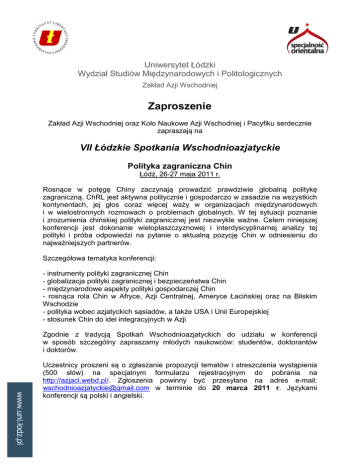Uniwersytet Łódzki Wydział Studiów Międzynarodowych i Politologicznych Zakład Azji Wschodniej Zaproszenie Zakład Azji Wschodniej oraz Koło Naukowe Azji Wschodniej i Pacyfiku serdecznie zapraszają na VII Łódzkie Spotkania Wschodnioazjatyckie Polityka zagraniczna Chin Łódź, 26-27 maja 2011 r. Rosnące w potęgę Chiny zaczynają prowadzić prawdziwie globalną politykę zagraniczną. ChRL jest aktywna politycznie i gospodarczo w zasadzie na wszystkich kontynentach, jej głos coraz więcej waży w organizacjach międzynarodowych i w wielostronnych rozmowach o problemach globalnych. W tej sytuacji poznanie i zrozumienia chińskiej polityki zagranicznej jest niezwykle ważne. Celem niniejszej konferencji jest dokonanie wielopłaszczyznowej i interdyscyplinarnej analizy tej polityki i próba odpowiedzi na pytanie o aktualną pozycję Chin w odniesieniu do najważniejszych partnerów. Szczegółowa tematyka konferencji: - instrumenty polityki zagranicznej Chin - globalizacja polityki zagranicznej i bezpieczeństwa Chin - międzynarodowe aspekty polityki gospodarczej Chin - rosnąca rola Chin w Afryce, Azji Centralnej, Ameryce Łacińskiej oraz na Bliskim Wschodzie - polityka wobec azjatyckich sąsiadów, a także USA i Unii Europejskiej - stosunek Chin do idei integracyjnych w Azji Zgodnie z tradycją Spotkań Wschodnioazjatyckich do udziału w konferencji w sposób szczególny zapraszamy młodych naukowców: studentów, doktorantów i doktorów. www.uni.lodz.pl Uczestnicy proszeni są o zgłaszanie propozycji tematów i streszczenia wystąpienia (500 słów) na specjalnym formularzu rejestracyjnym do pobrania na http://azjaci.webd.pl/. Zgłoszenia powinny być przesyłane na adres e-mail: [email protected] w terminie do 20 marca 2011 r. Językami konferencji są polski i angielski. Zakwalifikowani uczestnicy będą zobowiązani przesłać nam swoje referaty (w wersji roboczej) na dwa tygodnie przed rozpoczęciem konferencji, aby pozostali uczestnicy danego panelu mogli się z nimi zapoznać przed konferencją. Opłata rejestracyjna (płatna do 30 kwietnia) wynosi 200 zł dla studentów i doktorantów oraz 300 zł dla pozostałych. Opłata obejmuje wyżywienie, bankiet, materiały konferencyjne oraz recenzowaną publikację pokonferencyjną (planowana data wydania: do końca 2011 roku). Służymy także pomogą w zorganizowaniu uczestnikom noclegu w Domach Studenckich za cenę około 35-40 zł/noc. Organizatorzy zastrzegają sobie prawo selekcji wystąpień oraz artykułów dla celów publikacji. Bieżące informacje na temat konferencji będą umieszczanie na profilu konferencji na Facebooku: Łódzkie Spotkania Wschodnioazjatyckie oraz blogu: azjaipacyfik.blogspot.com. Kontakt: sekretarz konferencji p. Martyna Rzepecka e-mail: [email protected] tel. 605-251-141 Zapraszamy do udziału! prof. dr hab. Małgorzata Pietrasiak Kierownik Zakładu Azji Wschodniej UŁ Michał Zaręba Przewodniczący SKN Azji Wschodniej i Pacyfiku www.uni.lodz.pl ul. Składowa 41/43, PL - 90-127 Łódź, tel. (48) 042- 635 4232 www.wsmip.uni.lodz.pl, e-mail: [email protected] Kierownik Zakładu: dr hab. Małgorzata Pietrasiak tel. (48) 042-6354232, e-mail:[email protected] Martyna Rzepecka Sekretarz Konferencji