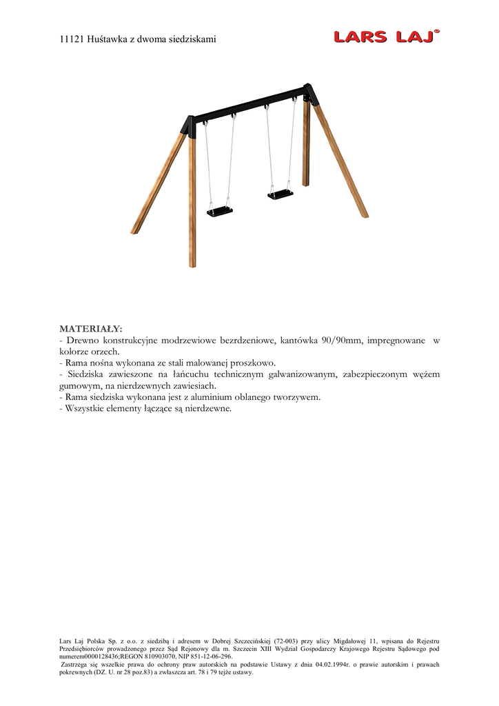 11121 Huśtawka z dwoma siedziskami MATERIAŁY: - Drewno konstrukcyjne modrzewiowe bezrdzeniowe, kantówka 90/90mm, impregnowane w kolorze orzech. - Rama nośna wykonana ze stali malowanej proszkowo. - Siedziska zawieszone na łańcuchu technicznym galwanizowanym, zabezpieczonym wężem gumowym, na nierdzewnych zawiesiach. - Rama siedziska wykonana jest z aluminium oblanego tworzywem. - Wszystkie elementy łączące są nierdzewne. Lars Laj Polska Sp. z o.o. z siedzibą i adresem w Dobrej Szczecińskiej (72-003) przy ulicy Migdałowej 11, wpisana do Rejestru Przedsiębiorców prowadzonego przez Sąd Rejonowy dla m. Szczecin XIII Wydział Gospodarczy Krajowego Rejestru Sądowego pod numerem0000128436;REGON 810903070, NIP 851-12-06-296. Zastrzega się wszelkie prawa do ochrony praw autorskich na podstawie Ustawy z dnia 04.02.1994r. o prawie autorskim i prawach pokrewnych (DZ. U. nr 28 poz.83) a zwłaszcza art. 78 i 79 tejże ustawy.