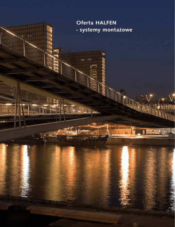Oferta HALFEN - systemy montażowe 23 H A L F E N szyny montażowe W połączeniu HALFEN szyn montażowych z odpowiednimi śrubami lub płytkami gwintowanymi wykonawca uzyskuje regulowane zamocowanie oferujące szereg korzyści. Zastosowanie szyn: • • • • • obiekty przemysłowe konstrukcje stalowe budowa maszyn instalacje solarne oczyszczalnie ścieków itp. Dzięki asortymentowi składającemu się z wielu odmian systemów montażowych (szyn, śrub i akcesoriów) możliwe jest uzyskanie rozwiązania optymalnego pod względem ekonomicznym i technicznym. Dzięki temu można również sprostać różnym i najostrzejszym wymaganiom stawianym przed konstrukcją i jej zamocowaniom. 24 Dostępne są następujące systemy szyn montażowych: ciężki system gorącowalcowanych szyn montażowych przeznaczony dla: - obciążeń dynamicznych - spawania do konstrukcji stalowej - dużych obciążeń średni system szyn montażowych zawierający tylko jeden typ płytek gwintowanych, przeznaczony dla obciążeń o średnich wartościach, kompatybilny z systemem montażowym Powerclick lekki system szyn montażowych zawierający szereg szyn o małych profilach, przeznaczonych do małych obciążeń. Wszystkie szyny montażowe są oferowane jako profile pełne lub perforowane. Szyny są dostępne w wykonaniu ze stali czarnej, jako ocynkowane lub wykonane ze stali nierdzewnej. H A L F E N szyny montażowe Wsporniki montażowe są wykonane z profili szynowych HALFEN i oferują takie korzyści jak: szybkość i bezpieczeństwo montażu oraz możliwość regulacji zamocowania. Wsporniki stanowią kompletną podporę dla rurociągów, przewodów itp. Wykonanie ze stali nierdzewnej lub ocynkowanie powoduje brak konieczności konserwacji elementów. Cechy produktu: • duża wytrzymałość i mały ciężar, dzięki temu szybki i prosty montaż • większość wsporników jest kompatybilna z systemem montażowym Powerclick Obejmy do rur umożliwiają regulowane zamocowanie przy użyciu każdego rodzaju szyn montażowych HALFEN. Tak jak w przypadku systemu montażowego Powerclick, tak i w przypadku obejm, wymiary zostały opracowane dla typowych rozwiązań. Dlatego właśnie połączenie systemu montażowego HALFEN wraz z obejmami do rur jest najbardziej ekonomicznym rozwiązaniem. Cechy produktu: • szeroki zakres wersji i rozmiarów • zakres średnic mocowanych rur od 15mm do 530mm • dostępne w wersji przesuwnej • dostępne w wykonaniu ze stali ocynkowanej lub nierdzewnej 25 H A L F E N P OW E R C L I C K - S Y S T E M M O N TA Ż OW Y HALFEN system montażowy Powerclick jest systemem przeznaczonym dla podparcia rurociągów w obiektach przemysłowych. Nigdy wcześniej nie było możliwości tworzenia tak dużej różnorodności konstrukcji nośnych przy użyciu tak małej ilości wielofunkcyjnych elementów. • jeden profil dla wszystkich konstrukcji nośnych • jeden łącznik narożny w dwóch wersjach dla 112 wariantów • jeden zacisk mocujący dla belek wszystkich wielkości HALFEN system montażowy Powerclick został stworzony na potrzeby obiektów przemysłowych i oferuje najbardziej ekonomiczne rozwiązanie. Używając systemu Powerclick można tworzyć konstrukcje wsporcze o zupełnie nowych koncepcjach: 26 • bardzo mała liczba komponentów, z których wszystkie oferują wielofunkcyjność • optymalny zakres regulacji mocowania • nowoczesna technologia w przystępnej cenie • mały ciężar elementów • bezpieczeństwo dzięki zdefiniowanej nośności • dopasowanie elementów we wszystkich połączeniach