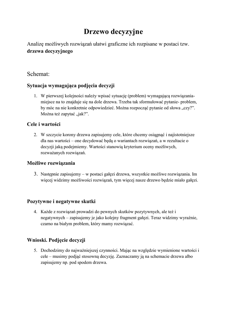 Drzewo decyzyjne Analizę możliwych rozwiązań ułatwi graficzne ich rozpisane w postaci tzw. drzewa decyzyjnego Schemat: Sytuacja wymagająca podjęcia decyzji 1. W pierwszej kolejności należy wpisać sytuację (problem) wymagającą rozwiązaniamiejsce na to znajduje się na dole drzewa. Trzeba tak sformułować pytanie- problem, by móc na nie konkretnie odpowiedzieć. Można rozpocząć pytanie od słowa „czy?”. Można też zapytać „jak?”. Cele i wartości 2. W szczycie korony drzewa zapisujemy cele, które chcemy osiągnąć i najistotniejsze dla nas wartości – one decydować będą o wariantach rozwiązań, a w rezultacie o decyzji jaką podejmiemy. Wartości stanowią kryterium oceny możliwych, rozważanych rozwiązań. Możliwe rozwiązania 3. Następnie zapisujemy – w postaci gałęzi drzewa, wszystkie możliwe rozwiązania. Im więcej widzimy możliwości rozwiązań, tym więcej nasze drzewo będzie miało gałęzi. Pozytywne i negatywne skutki 4. Każde z rozwiązań prowadzi do pewnych skutków pozytywnych, ale też i negatywnych – zapisujemy je jako kolejny fragment gałęzi. Teraz widzimy wyraźnie, czarno na białym problem, który mamy rozwiązać. Wnioski. Podjęcie decyzji 5. Dochodzimy do najważniejszej czynności. Mając na względzie wymienione wartości i cele – musimy podjąć stosowną decyzję. Zaznaczamy ją na schemacie drzewa albo zapisujemy np. pod spodem drzewa.