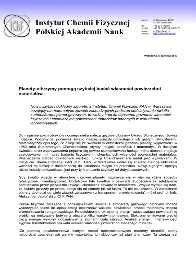 Instytut Chemii Fizycznej Polskiej Akademii Nauk adres: tel.: fax/tel.: email: WWW: ul. Kasprzaka 44/52 01-224 Warszawa +48 22 3432000 +48 22 3433333, 6325276 [email protected] http://www.ichf.edu.pl/ Warszawa, 5 czerwca 2013 Planety-olbrzymy pomogą szybciej badać własności powierzchni materiałów Nowy, szybki i dokładny algorytm z Instytutu Chemii Fizycznej PAN w Warszawie, bazujący na matematyce zjawisk zachodzących podczas oddziaływania światła z atmosferami planet gazowych, to ważny krok ku lepszemu poznaniu własności fizycznych i chemicznych powierzchni materiałów badanych w warunkach laboratoryjnych. Do najjaśniejszych obiektów nocnego nieba należą gazowe olbrzymy Układu Słonecznego: Jowisz i Saturn. Widzimy je, ponieważ światło naszej gwiazdy oddziałuje z ich gęstymi atmosferami. Matematyczny opis tego, co dzieje się ze światłem w atmosferze gazowej planety, wyprowadził w 1950 roku Subramanyan Chandrasekhar, słynny indyjski astrofizyk i matematyk. W liczącym dwieście stron wyprowadzeniu pojawiła się pewna skomplikowana funkcja, która obecnie znajduje zastosowanie m.in. przy badaniu fizycznych i chemicznych własności powierzchni materiałów. Wyznaczanie bardzo dokładnych wartości funkcji Chandrasekhara nadal jest wyzwaniem. W Instytucie Chemii Fizycznej PAN (IChF PAN) w Warszawie udało się znaleźć metodę obliczania wartości tej funkcji z dokładnością do kilkunastu miejsc po przecinku. Nowy algorytm, łączący różne metody obliczeniowe, jest przy tym znacznie szybszy od dotychczasowych. Gdy światło wpada w atmosferę gazowej planety, rozprasza się w niej na różne sposoby (elastycznie i nieelastycznie). Dodatkowo fale świetlne o pewnych długościach są selektywnie pochłanianie przez pierwiastki i związki chemiczne zawarte w atmosferze. „Zwykle wydaje się nam, że światło gwiazdy po prostu odbija się od planety jak od lustra. To nie jest prawda. W atmosferze planety dochodzi do wielu zjawisk związanych z transportem promieniowania”, mówi prof. dr hab. Aleksander Jabłoński z IChF PAN. Prawa fizyczne związane z oddziaływaniem światła z atmosferą gazowego olbrzyma można wykorzystać także do opisu emisji elektronów wskutek oświetlania próbek materiałów wiązką promieniowania rentgenowskiego. Fotoelektrony o określonej energii, opuszczające powierzchnię próbki, są emitowane jedynie z obszaru kilku warstw atomowych. Elektrony emitowane głębiej tracą energię wskutek oddziaływań z atomami ciała stałego. Analiza energii i intensywności sygnału fotoelektronów pozwala oceniać własności powierzchni badanego materiału. „Za pomocą powierzchniowo czułych metod spektroskopowych możemy określać cechy najbardziej zewnętrznych warstw materiałów, ich skład czy też stan chemiczny. Ta wiedza jest szczególnie ważna w inżynierii materiałowej, mikroelektronice i różnych nanotechnologiach, a także w tak istotnych procesach jak kataliza czy wszechobecna korozja”, wyjaśnia prof. Jabłoński. Prof. Jabłoński od lat przygotowuje bazy danych dla amerykańskiego Narodowego Instytutu Technologii i Standardyzacji (National Institute of Standards and Technology, NIST). Zawierają one pewne parametry niezbędne w obliczeniach związanych z badaniem własności spektroskopowych powierzchni. Jedna z tych baz była w całości wyznaczona z użyciem matematyki zbliżonej do formalizmu pierwotnie zaproponowanego przez Chandrasekhara do opisu zjawisk astronomicznych. Obliczenia potrzebne do opracowania wyników badań spektroskopowych powierzchni wymagają wielokrotnego wyznaczania wartości funkcji Chandrasekhara z możliwie dużą dokładnością. Problem tkwi w tym, że choć funkcja Chandrasekhara opisuje stosunkowo proste zjawisko fizyczne, sama jest dość skomplikowanym wyrażeniem matematycznym. Istnieje wiele metod obliczania wartości tej funkcji z niezbyt dużą dokładnością, zbliżoną do 1-2%. W niektórych zastosowaniach związanych z transportem elektronu w powierzchniowych warstwach materiałów pojawia się jednak konieczność wyznaczania wartości funkcji Chandrasekhara z precyzją nawet do 11-15 miejsc po przecinku. „W ostatnich latach udało mi się opracować algorytm, który pozwala otrzymać tak dużą dokładność, a przy tym działa nawet kilkadziesiąt razy szybciej od dotychczasowych”, mówi prof. Jabłoński. Wzrost szybkości wykonywania algorytmu jest równie ważny jak wzrost dokładności. Związane jest to z faktem, że w programach modelujących transport elektronów na powierzchni materiału funkcję Chandrasekhara trzeba liczyć tysiące, a nawet dziesiątki tysięcy razy. Kod programu realizującego nowy algorytm wyznaczania wartości funkcji Chandrasekhara został udostępniony w czasopiśmie „Computer Physics Communications”. Warto podkreślić, że funkcja Chandrasekhara odgrywa ważną rolę nie tylko w astronomii czy fizykochemii powierzchni. Znalazła zastosowanie także w energetyce jądrowej, gdzie używa się jej m.in. do analizowania rozpraszania neutronów w osłonach reaktorów atomowych. Materiał prasowy przygotowany w ramach grantu NOBLESSE z działania „Potencjał badawczy” 7. Programu Ramowego Unii Europejskiej. Instytut Chemii Fizycznej Polskiej Akademii Nauk (http://www.ichf.edu.pl/) został powołany w 1955 roku jako jeden z pierwszych instytutów chemicznych PAN. Profil naukowy Instytutu jest silnie powiązany z najnowszymi światowymi kierunkami rozwoju chemii fizycznej i fizyki chemicznej. Badania naukowe są prowadzone w 9 zakładach naukowych. Działający w ramach Instytutu Zakład Doświadczalny CHEMIPAN wdraża, produkuje i komercjalizuje specjalistyczne związki chemiczne do zastosowań m.in. w rolnictwie i farmacji. Instytut publikuje około 200 oryginalnych prac badawczych rocznie. KONTAKTY DO NAUKOWCÓW: prof. dr hab. Aleksander Jabłoński Instytut Chemii Fizycznej Polskiej Akademii Nauk tel. +48 22 3433331 e