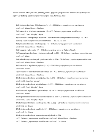 Zestaw ćwiczeń z książki Fale, spirale, jodełki, zygzaki i proponowane do nich utwory muzyczne z płyt CD Zabawy z papierowym wachlarzem oraz Zabawy z linią 1) Rytmiczne kreślenie fal jedną ręką (s. 14) – CD Zabawy z papierowym wachlarzem utwór nr 9 Maravillosos e Piadosos 2) Ćwiczenie w składaniu papieru (s. 15) – CD Zabawy z papierowym wachlarzem utwór nr 12 Denis Murphy’s Ryan 3) Ćwiczenie – manipulacja modelem – konstruowanie dużego obrazu oceanu (s. 16) – CD Zabawy z papierowym wachlarzem utwór nr 11 Ta Me Mo Shui 4) Rytmiczne kreślenie fal oburącz (s. 17) – CD Zabawy z papierowym wachlarzem utwór nr 9 Maravillosos e Piadosos 5) Ćwiczenie ruchowe (s. 19) – CD Zabawy z linią utwór nr 7 Hava Nagila 6) Naprzemienne kreślenie rytmicznych kresek (s. 20) – CD Zabawy z papierowym wachlarzem utwór nr 5 Marsz 7) Kreślenie naprzemiennych rytmicznych fal (s. 23) – CD Zabawy z papierowym wachlarzem utwór nr 9 Maravillosos e Piadosos 8) Ćwiczenie w wycinaniu papieru (s. 24) – CD Zabawy z papierowym wachlarzem utwór nr 5 Marsz 9) Ćwiczenie w konstruowaniu aniołka (s. 25) – CD Zabawy z papierowym wachlarzem utwór nr 9 Maravillosos e Piadosos 10) Rytmiczne kreślenie spirali jedną ręką (s. 27) – CD Zabawy z papierowym wachlarzem utwór nr 10 Lo primer de mai 11) Rytmiczne kreślenie spirali oburącz (s. 29) – CD Zabawy z papierowym wachlarzem utwór nr 12 Denis Murphy’s Ryan 12) Ćwiczenia wycinania i rysowania (s. 30) – CD Zabawy z papierowym wachlarzem utwór nr 5 Marsz 13) Naprzemienne rytmiczne kreślenie spirali (s. 31) – CD Zabawy z papierowym wachlarzem utwór nr 12 Denis Murphy’s Ryan 14) Rytmiczne kreślenie jodełek jedną ręką (s. 33) – CD Zabawy z papierowym wachlarzem utwór nr 2 Les Cocos 15) Rytmiczne kreślenie jodełek (s. 35) – CD Zabawy z papierowym wachlarzem utwór nr 2 Les Cocos 16) Rytmiczne kreślenie naprzemiennych jodełek (s. 38) – CD Zabawy z papierowym wachlarzem utwór nr 9 Maravillosos e Piadosos – CD Zabawy z papierowym wachlarzem utwór nr 2 Les Cocos 1 17) Rytmiczne kreślenie zygzaków (s. 40) – CD Zabawy z papierowym wachlarzem utwór nr 5 Marsz 18) Ćwiczenie kompozycyjne – układanie rybek (s. 42) – CD Zabawy z papierowym wachlarzem utwór nr 5 Marsz 19) Rytmiczne kreślenie zygzaków oburącz (s. 43) – CD Zabawy z papierowym wachlarzem utwór nr 5 Marsz 20) Naprzemienne rytmiczne kreślenie zygzaków (s. 45) – CD Zabawy z papierowym wachlarzem utwór nr 10 Lo primer de mai – CD Zabawy z papierowym wachlarzem utwór nr 9 Maravillosos e Piadosos 2