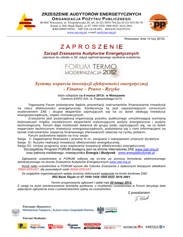 ZRZESZENIE AUDYTORÓW ENERGETYCZNYCH O RG ANIZ ACJ A P O śYTKU P UBLICZNEGO 00-002 Warszawa, ul. Świętokrzyska 20, tel. (0-22) 5054-784,fax (0-22) 825-86-70 Konto w ING Bank Śląski nr 07 1050 1038 1000 0022 3616 2661 KRS 0000159593, NIP 526-24-68-043, REGON 016355216 www.zae.org.pl, e-mail [email protected] Warszawa, dnia 14 luty 2012r. Zarząd Zrzeszenia Audytorów Energetycznych zaprasza do udziału w XII. edycji ogólnokrajowego spotkania audytorów Systemy wsparcia inwestycji efektywności energetycznej - Finanse – Prawo - Ryzyko które odbędzie się 6 marca 2012r. w Warszawie Centrum EXPO XXI, ul. Prądzyńskiego12/14 Tegoroczne Forum poświęcone będzie prezentacji instrumentów finansowania inwestycji na rzecz efektywności energetycznej. Konferencja ta jest najwaŜniejszym corocznym wydarzeniem ZAE i skupia ekspertów zajmujących się na co dzień obsługą inwestycji energooszczędnych, często innowacyjnych. Zrzeszenie jest pozarządową organizacją poŜytku publicznego umoŜliwiającą wymianę doświadczeń między niezaleŜnymi ekspertami wykonującymi audyty energetyczne i audyty technologiczne. Forum daje moŜliwość dotarcia do grupy osób, zajmujących się, na co dzień wsparciem technicznym inwestycji energooszczędnych, podzielenia się z nimi informacjami na temat instrumentów wsparcia finansowego oferowanych obecnie na rynku polskim. Forum podzielone będzie na trzy sesje: Sesja I: Zagadnienia finansowe i prawne m.in. związane z wdraŜaniem unijnych dyrektyw. Sesja II: Ryzyko realizacji inwestycji efektywności energetycznej. Sesja III: Unijne programy oraz wspieranie inwestycji efektywności energetycznej. Szczegółowy Program FORUM dostępny jest na stronie internetowej ZAE www.zae.org.pl; oraz patrona medialnego, miesięcznika Energia i Budynek www.energiaibudynek.pl . Zgłoszenie uczestnictwa w FORUM odbywa się on-line za pomocą formularza elektronicznego zamieszczonego na stronie Zrzeszenia Audytorów Energetycznych www.zae.org.pl. Koszt netto uczestnictwa w FORUM wynosi dla Członka Zrzeszenia z opłaconymi bieŜącymi składkami 180zł+23%VAT, dla pozostałych osób 200zł+23%VAT. Ze względów organizacyjnych wpłaty prosimy dokonywać wyłącznie na konto bankowe ZAE: ING Bank Śląski nr 07 1050 1038 1000 0022 3616 2661. Termin przyjmowania zgłoszeń i wpłat mija 20 lutego 2012. Z uwagi na duŜe zainteresowanie tematyką spotkania, o moŜliwości uczestnictwa w Forum decyduje data wpłynięcia zgłoszenia wraz z potwierdzeniem opłaty za uczestnictwo. Z powaŜaniem Patronaty Honorowe: Patroni Medialni: