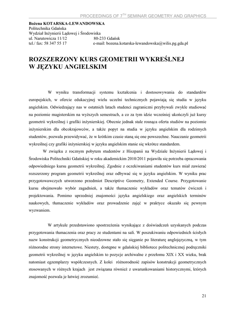 PROCEEDINGS OF 7TH SEMINAR GEOMETRY AND GRAPHICS Bożena KOTARSKA-LEWANDOWSKA Politechnika Gdańska Wydział Inżynierii Lądowej i Środowiska ul. Narutowicza 11/12 80-233 Gdańsk tel./ fax: 58 347 55 17 e-mail: [email protected] ROZSZERZONY KURS GEOMETRII WYKREŚLNEJ W JĘZYKU ANGIELSKIM W wyniku transformacji systemu kształcenia i dostosowywania do standardów europejskich, w ofercie edukacyjnej wielu uczelni technicznych pojawiają się studia w języku angielskim. Odwiedzający nas w ostatnich latach studenci zagraniczni przybywali zwykle studiować na poziomie magisterskim na wyższych semestrach, a co za tym idzie wcześniej ukończyli już kursy geometrii wykreślnej i grafiki inżynierskiej. Obecnie jednak stale rosnąca oferta studiów na poziomie inżynierskim dla obcokrajowców, a także popyt na studia w języku angielskim dla rodzimych studentów, pozwala przewidywać, że w krótkim czasie staną się one powszechne. Nauczanie geometrii wykreślnej czy grafiki inżynierskiej w języku angielskim stanie się wkrótce standardem. W związku z rocznym pobytem studentów z Hiszpanii na Wydziale Inżynierii Lądowej i Środowiska Politechniki Gdańskiej w roku akademickim 2010/2011 pojawiła się potrzeba opracowania odpowiedniego kursu geometrii wykreślnej. Zgodnie z oczekiwaniami studentów kurs miał zawierać rozszerzony program geometrii wykreślnej oraz odbywać się w języku angielskim. W wyniku prac przygotowawczych utworzono przedmiot Descriptive Geometry, Extended Course. Przygotowanie kursu obejmowało wybór zagadnień, a także tłumaczenie wykładów oraz tematów ćwiczeń i projektowania. Pomimo uprzedniej znajomości języka angielskiego oraz angielskich terminów naukowych, tłumaczenie wykładów oraz prowadzenie zajęć w praktyce okazało się pewnym wyzwaniem. W artykule przedstawiono spostrzeżenia wynikające z doświadczeń uzyskanych podczas przygotowania tłumaczenia oraz pracy ze studentami na sali. W poszukiwaniu odpowiednich ścisłych nazw konstrukcji geometrycznych nieodzowne stało się sięganie po literaturę anglojęzyczną, w tym różnorodne strony internetowe. Niestety, dostępne w gdańskiej bibliotece politechnicznej podręczniki geometrii wykreślnej w języku angielskim to pozycje archiwalne z przełomu XIX i XX wieku, brak natomiast egzemplarzy współczesnych. Z kolei różnorodność zapisów konstrukcji geometrycznych stosowanych w różnych krajach jest związana również z uwarunkowaniami historycznymi, których znajomość pozwala je łatwiej zrozumieć. 21