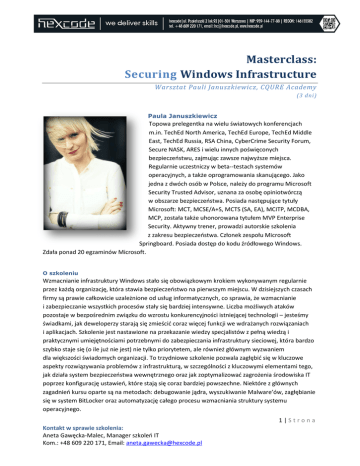 Masterclass: Securing Windows Infrastructure Warsztat Pauli Januszkiewicz, CQURE Academy (3 dni) Paula Januszkiewicz Topowa prelegentka na wielu światowych konferencjach m.in. TechEd North America, TechEd Europe, TechEd Middle East, TechEd Russia, RSA China, CyberCrime Security Forum, Secure NASK, ARES i wielu innych poświęconych bezpieczeństwu, zajmując zawsze najwyższe miejsca. Regularnie uczestniczy w beta-‐testach systemów operacyjnych, a także oprogramowania skanującego. Jako jedna z dwóch osób w Polsce, należy do programu Microsoft Security Trusted Advisor, uznana za osobę opiniotwórczą w obszarze bezpieczeństwa. Posiada następujące tytuły Microsoft: MCT, MCSE/A+S, MCTS (SA, EA), MCITP, MCDBA, MCP, została także uhonorowana tytułem MVP Enterprise Security. Aktywny trener, prowadzi autorskie szkolenia z zakresu bezpieczeństwa. Członek zespołu Microsoft Springboard. Posiada dostęp do kodu źródłowego Windows. Zdała ponad 20 egzaminów Microsoft. O szkoleniu Wzmacnianie infrastruktury Windows stało się obowiązkowym krokiem wykonywanym regularnie przez każdą organizację, która stawia bezpieczeństwo na pierwszym miejscu. W dzisiejszych czasach firmy są prawie całkowicie uzależnione od usług informatycznych, co sprawia, że wzmacnianie i zabezpieczanie wszystkich procesów stały się bardziej intensywne. Liczba możliwych ataków pozostaje w bezpośrednim związku do wzrostu konkurencyjności istniejącej technologii – jesteśmy świadkami, jak deweloperzy starają się zmieścić coraz więcej funkcji we wdrażanych rozwiązaniach i aplikacjach. Szkolenie jest nastawione na przekazanie wiedzy specjalistów z pełną wiedzą i praktycznymi umiejętnościami potrzebnymi do zabezpieczania infrastruktury sieciowej, która bardzo szybko staje się (o ile już nie jest) nie tylko priorytetem, ale również głównym wyzwaniem dla większości świadomych organizacji. To trzydniowe szkolenie pozwala zagłębić się w kluczowe aspekty rozwiązywania problemów z infrastrukturą, w szczególności z kluczowymi elementami tego, jak działa system bezpieczeństwa wewnętrznego oraz jak zoptymalizować zagrożenia środowiska IT poprzez konfigurację ustawień, które stają się coraz bardziej powszechne. Niektóre z głównych zagadnień kursu oparte są na metodach: debugowanie jądra, wyszukiwanie Malware’ów, zagłębianie się w system BitLocker oraz automatyzację całego procesu wzmacniania struktury systemu operacyjnego. 1|Strona Kontakt w sprawie szkolenia: Aneta Gawęcka-Malec, Manager szkoleń IT Kom.: +48 609 220 171, Email: [email protected] Dla kogo • • • Specjaliści ds. bezpieczeństwa informacji Agencje rządowe Administratorzy IT Forma szkolenia • Architekci IT • • Specjaliści oceny ryzyka Testerzy penetracyjni Materiały szkoleniowe Trzy dni szkolenia z ćwiczeniami i wykładami prowadzonymi przez instruktora • • Komplet materiałów ćwiczeniowych Instrukcje do ćwiczeń Szczegółowy program szkolenia Module 1. Designing Secure Windows Infrastructure 3. Deploying secure Remote Access (VPN, Direct Access, Workplace Join, RDS Gateway) 4. Deploying DNS and DNSSEC 1. Providing the complete knowledge for the areas that can be secured Module 7. Securing Web Server Module 2. Securing Windows Platform 1. Defining and disabling unnecessary services 2. Implementing secure service accounts, permissions and privileges 3. Driver signing Module 3. Malware Protection 1. Techniques used by modern malware 2. Malware investigation techniques 3. Analyzing cases of real malware 4. Implementing protection mechanisms Module 4. Managing Physical Security 1. Managing port security: USB, FireWire, and other 2. Mitigating Offline Access 3. Implementing and managing BitLocker Module 5. Deploying and configuring Public Key Infrastructure 1. Configuring IIS features for security 2. Deploying Server Name Indication and Centralized SSL Certificate Support 3. Monitoring Web Server recources and performance 4. Deploying Distributed Denial of Service attack prevention 5. Deploying Network Load Balancing and Web Farms Module 8. Providing Data Security and Availability 1. Designing data protection for Microsoft Office, PDF and other file types 2. Deploying Active Directory Rights Management Services 3. Deploying File Calssification Infrastructure and Dynamic Access Control 4. Configuring a secure File Server 5. Hardening basics for Microsoft SQL Server 6. Clustering selected Windows services Module 9. Mitigating the common password 1. Role and capabilities of the PKI in the infrastructure 2. Designing PKI architecture 3. PKI Deployment - Best practices attacks Module 6. Configuring Secure Communication Module 10. Automating Windows Security 1. Deploying and managing Windows Firewall advanced and useful features 2. Deploying and configuring IPsec 1. Impementing Advanced GPO Features 2. Deploying Software Restriction: Applocker 3. Advanced PowerShell for administration 1. Performing Pass-the-Hash attack 2. Performing the LSA Secrets dump 2|Strona Kontakt w sprawie szkolenia: Aneta Gawęcka-Malec, Manager szkoleń IT Kom.: +48 609 220 171, Email: [email protected] Dyplom Uczestnicy otrzymują dyplom CQURE Academy podpisany przez trenera CQURE, zaświadczający o ukończeniu szkolenia. Kiedy Gdzie 17-19.06.2015 GoldenFloor Plaza Al. Jerozolimskie 123A, Warszawa Cena standardowa Zniżki 5250 PLN netto Członkowie ISSA Polska -10% od ceny standardowej 3|Strona