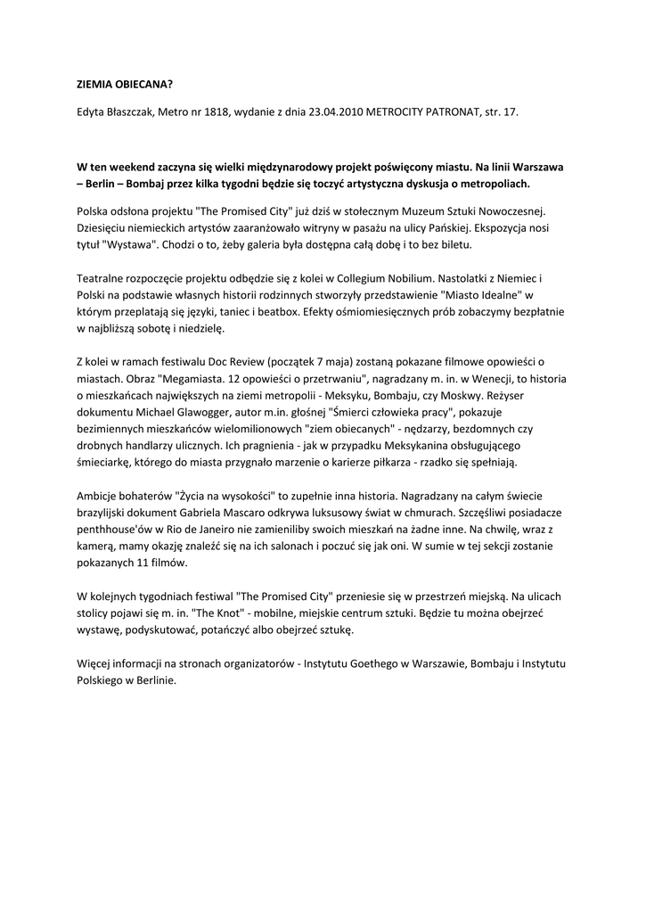 ZIEMIA OBIECANA? Edyta Błaszczak, Metro nr 1818, wydanie z dnia 23.04.2010 METROCITY PATRONAT, str. 17. W ten weekend zaczyna się wielki międzynarodowy projekt poświęcony miastu. Na linii Warszawa – Berlin – Bombaj przez kilka tygodni będzie się toczyd artystyczna dyskusja o metropoliach. Polska odsłona projektu "The Promised City" już dziś w stołecznym Muzeum Sztuki Nowoczesnej. Dziesięciu niemieckich artystów zaaranżowało witryny w pasażu na ulicy Paoskiej. Ekspozycja nosi tytuł "Wystawa". Chodzi o to, żeby galeria była dostępna całą dobę i to bez biletu. Teatralne rozpoczęcie projektu odbędzie się z kolei w Collegium Nobilium. Nastolatki z Niemiec i Polski na podstawie własnych historii rodzinnych stworzyły przedstawienie "Miasto Idealne" w którym przeplatają się języki, taniec i beatbox. Efekty ośmiomiesięcznych prób zobaczymy bezpłatnie w najbliższą sobotę i niedzielę. Z kolei w ramach festiwalu Doc Review (początek 7 maja) zostaną pokazane filmowe opowieści o miastach. Obraz "Megamiasta. 12 opowieści o przetrwaniu", nagradzany m. in. w Wenecji, to historia o mieszkaocach największych na ziemi metropolii - Meksyku, Bombaju, czy Moskwy. Reżyser dokumentu Michael Glawogger, autor m.in. głośnej "Śmierci człowieka pracy", pokazuje bezimiennych mieszkaoców wielomilionowych "ziem obiecanych" - nędzarzy, bezdomnych czy drobnych handlarzy ulicznych. Ich pragnienia - jak w przypadku Meksykanina obsługującego śmieciarkę, którego do miasta przygnało marzenie o karierze piłkarza - rzadko się spełniają. Ambicje bohaterów "Życia na wysokości" to zupełnie inna historia. Nagradzany na całym świecie brazylijski dokument Gabriela Mascaro odkrywa luksusowy świat w chmurach. Szczęśliwi posiadacze penthhouse'ów w Rio de Janeiro nie zamieniliby swoich mieszkao na żadne inne. Na chwilę, wraz z kamerą, mamy okazję znaleźd się na ich salonach i poczud się jak oni. W sumie w tej sekcji zostanie pokazanych 11 filmów. W kolejnych tygodniach festiwal "The Promised City" przeniesie się w przestrzeo miejską. Na ulicach stolicy pojawi się m. in. "The Knot" - mobilne, miejskie centrum sztuki. Będzie tu można obejrzed wystawę, podyskutowad, potaoczyd albo obejrzed sztukę. Więcej informacji na stronach organizatorów - Instytutu Goethego w Warszawie, Bombaju i Instytutu Polskiego w Berlinie.