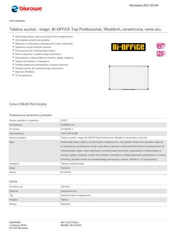 Warszawa 2017-03-04 Karta produktu: Tablica suchoś. -magn. BI-OFFICE Top Professional, 90x60cm, ceramiczna, rama alu. Doskonałej jakości tablica suchościeralno-magnetyczna Ultra gładka ceramiczna powłoka Odporna na zadrapania, powstawanie smug i zabrudzeń Zapewnia wysoki kontrast kolorów Przeznaczona do intensywnego użytku Rama wykonana z anodowanego aluminium Wyposażona w dolną półkę na markery, gąbkę, magnesy Zestaw do montażu w komplecie Produkt pakowany jednostkowo w karton ochronny Posiada zestaw do samodzielnego mocowania Rozmiar: 90x60cm 25 lat gwarancji Cena 238,84 PLN brutto Podstawowe parametry produktu Numer produktu w systemie 20391 Nr dostawcy GCR0601178 Nr Celcen 20-00286-3 Kod kreskowy 5603750541486 Nazwa produktu Tablica suchoś. -magn. BI-OFFICE Top Professional, 90x60cm, ceramiczna, rama alu. Opis Doskonałej jakości tablica suchościeralno-magnetyczna; ultra gładka ceramiczna powłoka; odporna na zadrapania, powstawanie smug i zabrudzeń; zapewnia wysoki kontrast kolorów; przeznaczona do intensywnego użytku; rama wykonana z anodowanego aluminium; wyposażona w dolną półkę na markery, gąbkę, magnesy; zestaw do montażu w komplecie; produkt pakowany jednostkowo w karton ochronny; posiada zestaw do samodzielnego mocowania; rozmiar: 90x60cm; 25 lat gwarancji Kategoria Tablice suchościeralne Klasa Premium Marka BI-OFFICE Cecha W ofercie od 2014-03 Materiał Stal/aluminium Typ Suchościeralno-magnetyczny Produkt Tablica Rodzaj Standard EBIUROWE 1 Sierpnia 39/26 02-134 Warszawa NIP: 5222725611 REGON: 362214769 Warszawa 2017-03-04 Karta katalogowa produktu cd. Tablica suchoś. -magn. BI-OFFICE Top Professional, 90x60cm, ceramiczna, rama alu. Zamiennik Zamiennik GCR0601170 Wspólny słownik zamówień CPV 30195900-1 Tablice do pisania i tablice magnetyczne Certyfikaty Ilość lat gwarancji 25 Hit Hit Nowy produkt w ofercie Standard Kolor Kolor Biały Wymiary Wymiary (mm) 900x600 Serdecznie zapraszamy do współpracy EBIUROWE zespół. EBIUROWE 1 Sierpnia 39/26 02-134 Warszawa NIP: 5222725611 REGON: 362214769