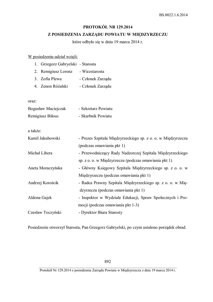 892 PROTOKÓŁ NR 129.2014 Z POSIEDZENIA ZARZĄDU
