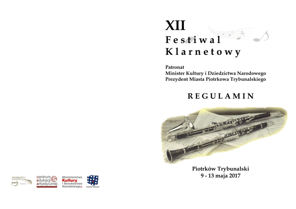 XII Festiwal Klarnetowy Patronat Minister Kultury i Dziedzictwa Narodowego Prezydent Miasta Piotrkowa Trybunalskiego REGULAMIN Piotrków Trybunalski 9 - 13 maja 2017 Szanowni Państwo POSTANOWIENIA KOŃCOWE: 1. 2. 3. 4. 5. 6. Dane uczestników Konkursu będą przetwarzane zgodnie z postanowieniami Ustawy o ochronie danych osobowych (Dz. U. z 1997, nr 133, poz. 883, ze zm.). Podanie danych ma charakter dobrowolny, ale niezbędny do wzięcia udziału w Konkursie. Osobom przysługuje prawo do wglądu do swoich danych oraz ich poprawienia. Organizator zastrzega sobie prawo do podania do publicznej wiadomości danych osobowych (imienia i nazwiska, nazwy szkoły, którą te osoby reprezentują) osób, które otrzymają nagrody i wyróżnienia w Konkursie. W Konkursie nie będą brały udziału zgłoszenia, w których podano niekompletne lub nieprawdziwe dane. Organizator nie ponosi odpowiedzialności za zgłoszenia, które nie dotarły do niego w terminie na skutek okoliczności niezależnych od niego. Uczestnicy pokrywają koszty podróży i pobytu w Piotrkowie Trybunalskim. Zgłoszenie udziału w Konkursie oznacza akceptację niniejszego Regulaminu Zachęceni dużym, niesłabnącym zainteresowaniem dotychczasowych edycji Festiwalu, pragniemy zaprosić Państwa do udziału w XII Festiwalu Klarnetowym w Piotrkowie Trybunalskim. Jest to spotkanie klarnecistów reprezentujących wszystkie szczeble kształcenia muzycznego, od szkoły podstawowej poprzez średnią do wyższej. Wychodząc naprzeciw wnioskom Komisji Artystycznej, Pedagogów i własnym doświadczeniom organizacyjnym zmieniliśmy formułę organizacyjną. Będą nie trzy, ale cztery grupy prezentacji. Uczestnikom Festiwalu nie stawiamy żadnych wymagań repertuarowych, jedynie limit czasowy wykonań. Wzorem ubiegłych edycji planujemy urozmaicić przebieg Festiwalu koncertami wybitnych klarnecistów, spotkaniami pedagogów, wystawami instrumentów i akcesoriów. ZAPRASZAMY NA FESTIWAL KLARNETOWY. Miło nam będzie gościć Państwa w Piotrkowie Trybunalskim. XII FESTIWAL KLARNETOWY Piotrków Trybunalski 9 – 13 maja 2017 r. ORGANIZATORZY ● Państwowa Szkoła Muzyczna I i II st im. I. J. Paderewskiego w Piotrkowie Tryb. ● Urząd Miasta w Piotrkowie Tryb. Adres Biura Konkursu CELE FESTIWALU Państwowa Szkoła Muzyczna I i II st. im. I. J. Paderewskiego 97 – 300 Piotrków Tryb. Pasaż Rudowskiego 4 tel./fax – [ 0-44 ] 647-19-05 e-mail – [email protected] www.muzpt.neostrada.pl Kierownik Biura – Jerzy Patora tel. 605 635 101 ● spotkanie klarnecistów reprezentujących różne szczeble kształcenia muzycznego ● podnoszenie poziomu pedagogiki instrumentalnej poprzez wymianę doświadczeń ● popularyzacja klarnetu, wartościowej literatury, poszerzanie repertuaru ● promocja utalentowanych klarnecistów FORMUŁA ORGANIZACYJNA TERMINY W Festiwalu mogą uczestniczyć soliści i zespoły w następujących grupach wiekowych: Grupa I Uczniowie klasy klarnetu szkół muzycznych I i II stopnia urodzeni w roku 2006 i młodsi Grupa II Uczniowie klasy klarnetu szkół muzycznych I i II stopnia urodzeni w latach 2005,2004,2003,2002 Grupa III Uczniowie klasy klarnetu szkół muzycznych I i II stopnia urodzeni w roku 2001 i starsi Grupa IV Studenci – klarneciści wydziału instrumentalnego Akademii Muzycznych Festiwal odbędzie się w dniach 9 - 13 maja 2017 roku w Państwowej Szkole Muzycznej I i II st. w Piotrkowie Tryb. Czytelnie wypełnione zgłoszenia uczestników wraz z repertuarem i czasem trwania utworów prosimy przesyłać na adres Biura Festiwalu w nieprzekraczalnym terminie do 24 marca 2017 roku . Do udziału dopuszcza się solistów i zespoły zagraniczne z miast partnerskich i innych krajów świata. REPERTUAR Uczestnicy wykonują dowolny program, obowiązuje jedynie limit czasowy jednakowy dla solistów jak i zespołów kameralnych. GRUPA I do 5 minut GRUPA II do 8 minut GRUPA III do 12 minut GRUPA IV do 15 minut Szkołę lub uczelnię może reprezentować dowolna ilość uczniów i zespołów. W zespołach wyklucza się zestawienie klarnetu z innym instrumentem we wszystkich kategoriach ( także z akompaniamentem fortepianu ). Jeżeli choćby jeden z członków zespołów przekracza limit wiekowy przewidywany dla danej kategorii wiekowej, zespół zostaje zaklasyfikowany do kategorii wyższej. Soliści obowiązkowo wykonują program z pamięci. NAGRODY Występy uczestników oceniać będzie Komisja Artystyczna powołana przez organizatorów i zaakceptowana przez CEA. Dla najlepszych wykonawców przewidziane są nagrody pieniężne ufundowane przez Prezydenta Miasta Piotrkowa Trybunalskiego oraz nagrody rzeczowe w tym nagroda Grand Prix – klarnet ufundowany przez sponsorów Wszyscy uczestnicy otrzymują dyplomy. Na życzenie uczestnika może być udostępniona jego punktacja średnia. KOSZTY UCZESTNICTWA Ustala się wpisowe w wysokości 100,00 złotych od każdego uczestnika, zarówno solisty jak i członka zespołu, które należy wpłacać do 24 marca 2017 na konto: RADA RODZICÓW przy PSM I i II st. w Piotrkowie Trybunalskim Nordea Bank Polska S.A. 57 1440 1257 0000 0000 0221 8488 Jeżeli uczestnik występuje jednocześnie jako solista i członek zespołu wnosi jedną opłatę, tj. 100,00 złotych. Nauczyciele, akompaniatorzy i opiekunowie nie płacą wpisowego. Przesłanie wpisowego jest potwierdzeniem przyjazdu na Festiwal i w razie rezygnacji z udziału nie podlega zwrotowi. Program ramowy Festiwalu będzie dostępny od 22 kwietnia 2017 roku na stronie internetowej szkoły.