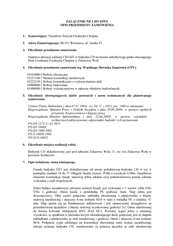 ZAŁĄCZNIK NR 2 DO SIWZ OPIS PRZEDMIOTU ZAMÓWIENIA 1. Zamawiający: Narodowy Instytut Fryderyka Chopina 2. Adres Zamawiającego: 00-355 Warszawa, ul. Tamka 43 3. Określenie przedmiotu zamówienia. Naprawa elewacji szklanej CD-OZ1 w budynku CD na terenie zabytkowego parku otaczającego Dom Urodzenia Fryderyka Chopina w Żelazowej Woli 4. Określenie przedmiotu zamówienia wg. Wspólnego Słownika Zamówień (CPV). 45443000-4 Roboty elewacyjne 45223100-7 Montaż konstrukcji metalowych 45223210-1 Roboty konstrukcyjne z wykorzystaniem stali 45000000-7 Roboty budowlane 45400000-1 Roboty wykończeniowe w zakresie obiektów budowlanych. 5. Określenie obowiązujących aktów prawnych i norm technicznych dla planowanego zamierzenia. Ustawa Prawo Budowlane z dnia 07.07.1994r. (t.j. Dz. U. z 2013, poz. 1409 ze zmianami). Rozporządzenie Ministra Pracy i Polityki Socjalnej z dnia 28.08.2003r. w sprawie ogólnych przepisów bezpieczeństwa i higieny pracy. Rozporządzenie Ministra Infrastruktury z dnia 12.04.2002r. w sprawie warunków technicznych jakim powinny odpowiadać budynki i ich usytuowanie. PN-EN 1273-5+A2:2011 PN-EN 10088 PN-EN 1600:2002 PN-S-10050:1989 PN-82/S-10052 6. Określenie miejsca realizacji robót. Budynek CD zlokalizowany jest pod adresem Żelazowa Wola 15, we wsi Żelazowa Wola w powiecie Sochaczew 7. Opis techniczny stanu istniejącego. Fasada budynku OZ1 jest zlokalizowana od strony południowej budynku CD w osi A pomiędzy rzędami 18 do 37. Długość fasady wynosi 39.8m a wysokość 6.96m. Zasadnicze elementy konstrukcji fasady stanowią żebra szklane oraz jednokomorowe panele szklane wykonane z szyb zespolonych. Żebro będące zasadniczym ustrojem nośnym fasady jest wykonane z 3 warstw szkła ESG VSG o grubości 10mm każda z przekładką PE grubości 2mm. Słup żebra jest dwuczęściowy. Obie części połączone nakładką dwustronną z płaskownika z blachy stalowej nierdzewnej i skręcony 6-ma śrubami M16 w tulei z wkładką PE o średnicy 41 mm. Słup opiera się na fundamencie żelbetowym i jest zamocowany przegubowo za pośrednictwem łączników z blachy stalowej ocynkowanej grubości 2x1 Omm zakotwionej do betonu kotwami wklejanymi HVU HAS M12. Poziomy rygiel żebra o zmiennej wysokości, ze spadkiem w kierunku koryta odwadniającego dach, połączony jest ze słupem nakładkami z płaskownika ze stali nierdzewnej o grubości 10mm i skręcony 6-ma śrubami M16. Podparcie rygla szklanego na konstrukcji drewnianej ramy nośnej zasadniczego ustroju nośnego budynku CD, zrealizowano za pomocą łącznika ze stali nierdzewnej i skręcane za pomocą 2 śrub M16. Szyby zespolone górnej części fasady OZ1 o wymiarach 3.90x2.05m oparte są na dolnej części fasady o wymiarach 2.99x2.05m, która opiera się na fundamencie budynku. Pionowe szprosy fasady stanowią żebra konstrukcji nośnej i do nich są przymocowane szyby zespolone za pośrednictwem złączek systemowych. Szyby zespolone są wykonane ze szkła produkcji firmy Guardian i według rozwiązań systemowych tej firmy. Na szybę zewnętrzną zastosowano szkło Float Glass Clear o grubości 10mm na ramce Clima Guard N o grubości 16mm. Przestrzeń komory międzyszybowej wypełniono w 100% Argonem. Na szybę wewnętrzną zastosowano szybę klejoną z dwóch warstw szkła Lami Glass Extra Clear o grubości 5mm każda. Łącznie grubość szyby wewnętrznej 10.5mm. Żebra szklane połączone są przegubowo z konstrukcją drewnianej ramy nośnej budynku CD. Zasadniczą konstrukcją nośną budynku CD oprócz szklanych żeber nawy trejażu są czteronawowe ramy z drewna klejonego w rzędach 19,20 i 21 oraz trójnawowe ramy z drewna klejonego w rzędach 22 do 32. Rozpiętości osiowe naw ram czteronawowych wynoszą odpowiednio 1.80-1.80-6.61-1.82m a ram trójnawowych 1.80-8.41-1.82m. Wysokość wierzchu rygla poziomego ram 6.58m. Słupy ram są dwugałęzlowe o wymiarach przekroju poszczególnych gałęzi 48x12cm. Słupy połączone sztywno za pomocą śrub stalowych M16 z ryglem drewnianym o przekroju prostokątnym 49x12cm. Dwugałęziowe słupy ram mają jedną przewiązkę ze śruby M24 umieszczoną na wysokości 2.70m od podłogi i są oparte przegubowo na fundamencie za pomocą łącznika stalowego. W trakcie inwentaryzacji stwierdzono istniejące prowizoryczne konstrukcje z rur stalowych, wspomagające utrzymanie stateczności ścian szczytowych fasady w rzędach 18 i3 8. Określenie warunków ogólnych wykonania planowanych robót. Planowane roboty należy wykonać zgodnie z projektem budowlano-wykonawczym naprawy fasady szklanej CD-OZ1 w budynku CD na terenie zabytkowego parku otaczającego Dom Urodzenia Fryderyka Chopina w Żelazowej Woli wykonanym przez „ERECTA 2” Budowlane Biuro Inżynierskie Sp. z o.o. 9. Opis elementów projektowanych Naprawę elewacji szklanej CD-OZ1 w budynku CD na terenie zabytkowego parku otaczającego Dom Urodzenia Fryderyka Chopina w Żelazowej Woli, której zasadniczym działaniem będzie - poprzez dodatkowo zaprojektowane stężenia ramowe między rzędami oraz 36-37 w osi A - wzmocnienie konstrukcji nośnej elewacji. Stężenia ramowe należy wykonać ze stali nierdzewnej z profili rurowych. Słupy oraz rygle zaprojektowano z rur prostokątnych RP200x100x5. Wysokość ramy stężającej wynosi 6,6m natomiast rozstaw osiowy między słupami 1,55m. Stężenie ramowe składa się z dwóch części: niższej o wysokości 3,46m i wyższej o wysokości 3,245m. Obie części połączone są ze sobą za pośrednictwem blach o grubości 10mm i skręconych czterema śrubami M16 klasy 10.9. Stężenie ramowe zakotwione jest sztywno do fundamentu żelbetowego za pomocą kotew chemicznych Hilti lub równoważnych o parametrach: klasa wytrzymałości min 5,8, ocynk galwaniczny (min. 5 µm) i posiadających aprobatę ETA, Pożar Dla wzmocnienia pozostałych istniejących żeber szklanych zaprojektowano stężenia podłużne ze stali nierdzewnej z profilu rurowego RK 100x100x5, mont