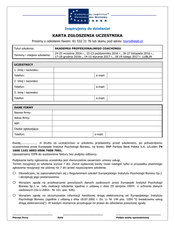 Inspirujemy do działania! KARTA ZGŁOSZENIA UCZESTNIKA Prosimy o odesłanie faxem: 81 532 21 76 lub skanu pod adres: [email protected] Tytuł szkolenia: AKADEMIA PROFESJONALNEGO COACHINGU Terminy i miejsce szkolenia: 24-25 września 2016 r., 22-23 października 2016 r., 26-27 listopada 2016 r., 17-18 grudnia 2016r., 14-15 stycznia 2017 r., 18-19 lutego 2017 r. LUBLIN UCZESTNICY 1. Imię i nazwisko: Telefon: e-mail: 2. Imię i nazwisko: Telefon: e-mail: 3. Imię i nazwisko: Telefon e-mail: DANE FIRMY Nazwa firmy: Adres firmy: NIP: Osoba zgłaszająca: Telefon: e-mail: Kwotę................... zł brutto za uczestnictwo w szkoleniu przekażemy przed szkoleniem, po potwierdzeniu uczestnictwa przez Europejski Instytut Psychologii Biznesu, na konto: BNP Paribas Bank Polska S.A. o/Lublin 74 1600 1101 0003 0506 7608 7001. Upoważniamy EIPB do wystawienia faktury bez podpisu odbiorcy. Podpisanie karty zgłoszenia uczestnika jest równocześnie zawarciem umowy usługi. Termin rezygnacji ze szkolenia wynosi 7 dni. Zwrot wpłaconej kwoty może nastąpić tylko w przypadku pisemnego zgłoszenia rezygnacji nie później niż 7 dni przed rozpoczęciem szkolenia. o o o Oświadczam, że zapoznałem/łam się z Regulaminem szkoleń Europejskiego Instytutu Psychologii Biznesu Sp.J. i akceptuję jego postanowienia. Wyrażam zgodę na przetwarzanie powyższych danych osobowych przez Europejski Instytut Psychologii Biznesu Sp.J. w celu realizacji szkolenia zgodnie z ustawą z dnia 29 sierpnia 1997r. o ochronie danych osobowych (Dz.U.2002r. Nr 101 poz. 926). Wyrażam zgodę na otrzymywanie informacji handlowej drogą elektroniczną od Europejskiego Instytutu Psychologii Biznesu (zgodnie z ustawą z dnia 18.07.2002 r. Dz. U. Nr 144 poz. 1204 "O świadczeniu usług drogą elektroniczną"). W każdym momencie przysługuje mi prawo do odwołania powyższej zgody. ………………………………..… Pieczęć firmy ………………………………..… Data ………………………………………. Podpis osoby upoważnionej