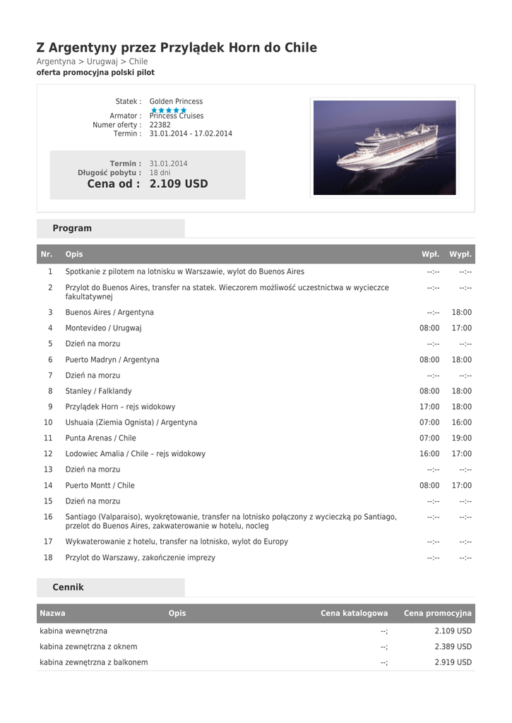 Z Argentyny przez Przylądek Horn do Chile Argentyna > Urugwaj > Chile oferta promocyjna polski pilot Statek : Armator : Numer oferty : Termin : Termin : Długość pobytu : Golden Princess Princess Cruises 22382 31.01.2014 - 17.02.2014 31.01.2014 18 dni Cena od : 2.109 USD Program Nr. Opis Wpł. Wypł. 1 Spotkanie z pilotem na lotnisku w Warszawie, wylot do Buenos Aires --:-- --:-- 2 Przylot do Buenos Aires, transfer na statek. Wieczorem możliwość uczestnictwa w wycieczce fakultatywnej --:-- --:-- 3 Buenos Aires / Argentyna --:-- 18:00 4 Montevideo / Urugwaj 08:00 17:00 5 Dzień na morzu --:-- --:-- 6 Puerto Madryn / Argentyna 08:00 18:00 7 Dzień na morzu --:-- --:-- 8 Stanley / Falklandy 08:00 18:00 9 Przylądek Horn – rejs widokowy 17:00 18:00 10 Ushuaia (Ziemia Ognista) / Argentyna 07:00 16:00 11 Punta Arenas / Chile 07:00 19:00 12 Lodowiec Amalia / Chile – rejs widokowy 16:00 17:00 13 Dzień na morzu --:-- --:-- 14 Puerto Montt / Chile 08:00 17:00 15 Dzień na morzu --:-- --:-- 16 Santiago (Valparaiso), wyokrętowanie, transfer na lotnisko połączony z wycieczką po Santiago, przelot do Buenos Aires, zakwaterowanie w hotelu, nocleg --:-- --:-- 17 Wykwaterowanie z hotelu, transfer na lotnisko, wylot do Europy --:-- --:-- 18 Przylot do Warszawy, zakończenie imprezy --:-- --:-- Cennik Nazwa Opis Cena katalogowa Cena promocyjna kabina wewnętrzna --; 2.109 USD kabina zewnętrzna z oknem --; 2.389 USD kabina zewnętrzna z balkonem --; 2.919 USD opłaty portowe bilet lotniczy ok. 6500 PLN/os. --; 799 USD --; --; Zobacz pozostałe terminy Nie ma innych terminów. Informacje dodatkowe cena obejmuje: rejs statkiem Golden Princess*****, zakwaterowanie w kabinie wybranej kategorii (14 noclegów); serwis bagażowy i kabinowy; wyżywienie – 3 główne posiłki, przekąski między posiłkami, bufet lub przekąski o północy; korzystanie z basenu i innych urządzeń sportowo-rekreacyjnych; udział we wszystkich imprezach organizowanych na statku, transfery, nocleg tranzytowy w Buenos Aires, opiekę polskiego pilota. cena nie obejmuje: opłat portowych i ubezpieczenia KL, NW, bagażu (799$/os.), kosztu przelotów Warszawa – Buenos Aires – Warszawa oraz Santiago - Buenos Aires ok. 6500 PLN/os., wycieczek fakultatywnych; usunięto kosztu wymaganych wiz,korzystania z punktów usługowych (pralnia, fotograf, salon piękności i odnowy biologicznej, internet); obligatoryjnego transferu połączonego z wycieczką w Santiago koszt ok. 45$/os. , napojów do obiadów i kolacji, drinków oraz napiwków obowiązkowych dla obsługi statku (ok. 12$/dzień/osobę dorosłą). uwagi: kabiny 3/4 osobowe są dostępne tylko w wybranych kategoriach, a ich liczba jest ograniczona - sprzedaż tylko po potwierdzeniu. Grupa realizowana przy min. 10 osobach. WYCIECZKI FAKULTATYWNE Z Argentyny przez Przylądek Horn do Chile