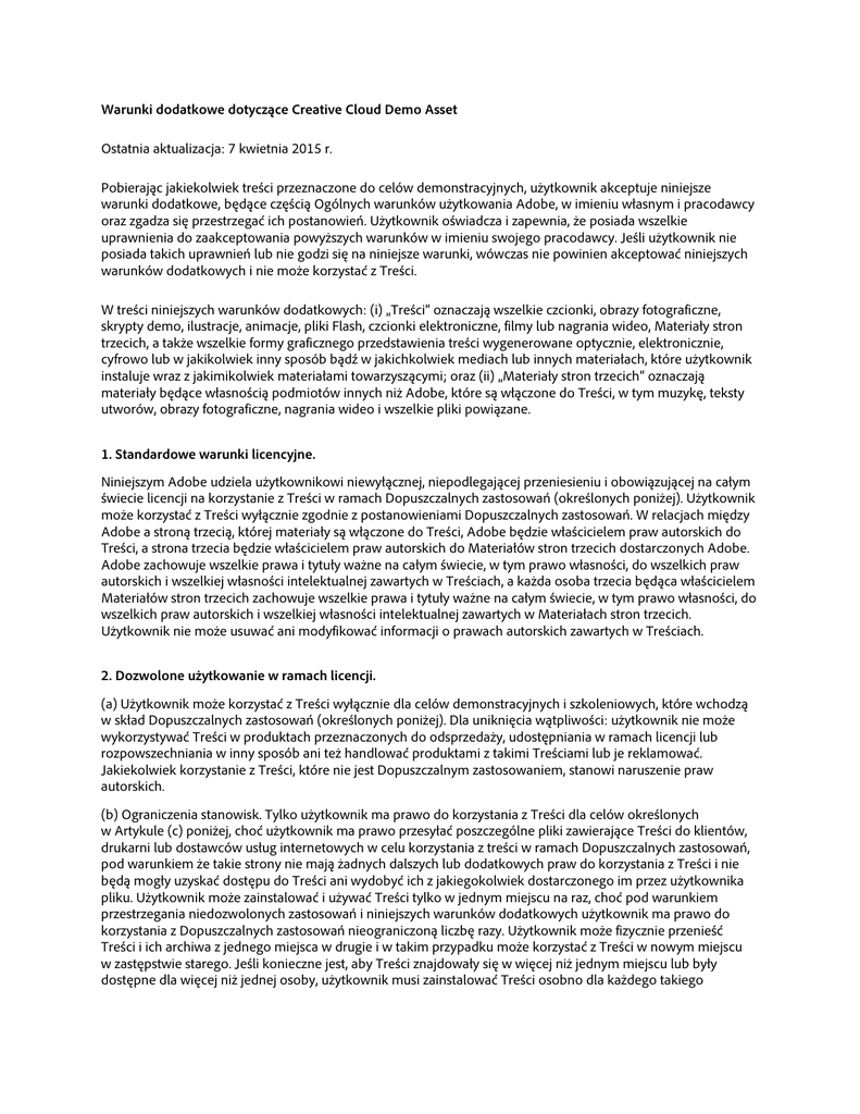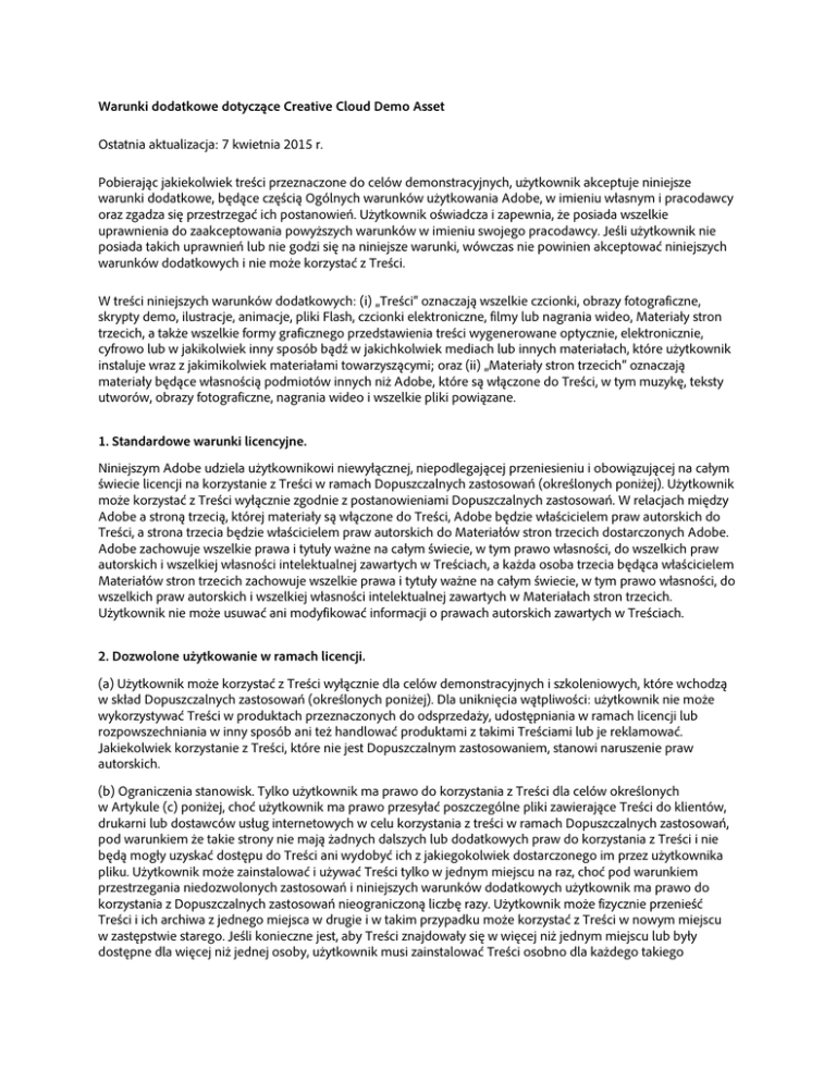 Warunki dodatkowe dotyczące Creative Cloud Demo Asset Ostatnia aktualizacja: 7 kwietnia 2015 r. Pobierając jakiekolwiek treści przeznaczone do celów demonstracyjnych, użytkownik akceptuje niniejsze warunki dodatkowe, będące częścią Ogólnych warunków użytkowania Adobe, w imieniu własnym i pracodawcy oraz zgadza się przestrzegać ich postanowień. Użytkownik oświadcza i zapewnia, że posiada wszelkie uprawnienia do zaakceptowania powyższych warunków w imieniu swojego pracodawcy. Jeśli użytkownik nie posiada takich uprawnień lub nie godzi się na niniejsze warunki, wówczas nie powinien akceptować niniejszych warunków dodatkowych i nie może korzystać z Treści. W treści niniejszych warunków dodatkowych: (i) „Treści“ oznaczają wszelkie czcionki, obrazy fotograficzne, skrypty demo, ilustracje, animacje, pliki Flash, czcionki elektroniczne, filmy lub nagrania wideo, Materiały stron trzecich, a także wszelkie formy graficznego przedstawienia treści wygenerowane optycznie, elektronicznie, cyfrowo lub w jakikolwiek inny sposób bądź w jakichkolwiek mediach lub innych materiałach, które użytkownik instaluje wraz z jakimikolwiek materiałami towarzyszącymi; oraz (ii) „Materiały stron trzecich“ oznaczają materiały będące własnością podmiotów innych niż Adobe, które są włączone do Treści, w tym muzykę, teksty utworów, obrazy fotograficzne, nagrania wideo i wszelkie pliki powiązane. 1. Standardowe warunki licencyjne. Niniejszym Adobe udziela użytkownikowi niewyłącznej, niepodlegającej przeniesieniu i obowiązującej na całym świecie licencji na korzystanie z Treści w ramach Dopuszczalnych zastosowań (określonych poniżej). Użytkownik może korzystać z Treści wyłącznie zgodnie z postanowieniami Dopuszczalnych zastosowań. W relacjach między Adobe a stroną trzecią, której materiały są włączone do Treści, Adobe będzie właścicielem praw autorskich do Treści, a strona trzecia będzie właścicielem praw autorskich do Materiałów stron trzecich dostarczonych Adobe. Adobe zachowuje wszelkie prawa i tytuły ważne na całym świecie, w tym prawo własności, do wszelkich praw autorskich i wszelkiej własności intelektualnej zawartych w Treściach, a każda osoba trzecia będąca właścicielem Materiałów stron trzecich zachowuje wszelkie prawa i tytuły ważne na całym świecie, w tym prawo własności, do wszelkich praw autorskich i wszelkiej własności intelektualnej zawartych w Materiałach stron trzecich. Użytkownik nie może usuwać ani modyfikować informacji o prawach autorskich zawartych w Treściach. 2. Dozwolone użytkowanie w ramach licencji. (a) Użytkownik może korzystać z Treści wyłącznie dla celów demonstracyjnych i szkoleniowych, które wchodzą w skład Dopuszczalnych zastosowań (określonych poniżej). Dla uniknięcia wątpliwości: użytkownik nie może wykorzystywać Treści w produktach przeznaczonych do odsprzedaży, udostępniania w ramach licencji lub rozpowszechniania w inny sposób ani też handlować produktami z takimi Treściami lub je reklamować. Jakiekolwiek korzystanie z Treści, które nie jest Dopuszczalnym zastosowaniem, stanowi naruszenie praw autorskich. (b) Ograniczenia stanowisk. Tylko użytkownik ma prawo do korzystania z Treści dla celów określonych w Artykule (c) poniżej, choć użytkownik ma prawo przesyłać poszczególne pliki zawierające Treści do klientów, drukarni lub dostawców usług internetowych w celu korzystania z treści w ramach Dopuszczalnych zastosowań, pod warunkiem że takie strony nie mają żadnych dalszych lub dodatkowych praw do korzystania z Treści i nie będą mogły uzyskać dostępu do Treści ani wydobyć ich z jakiegokolwiek dostarczonego im przez użytkownika pliku. Użytkownik może zainstalować i używać Treści tylko w jednym miejscu na raz, choć pod warunkiem przestrzegania niedozwolonych zastosowań i niniejszych warunków dodatkowych użytkownik ma prawo do korzystania z Dopuszczalnych zastosowań nieograniczoną liczbę razy. Użytkownik może fizycznie przenieść Treści i ich archiwa z jednego miejsca w drugie i w takim przypadku może korzystać z Treści w nowym miejscu w zastępstwie starego. Jeśli konieczne jest, aby Treści znajdowały się w więcej niż jednym miejscu lub były dostępne dla więcej niż jednej osoby, użytkownik musi zainstalować Treści osobno dla każdego takiego zastosowania. Użytkownik może wykonać jedną (1) kopię Treści wyłącznie w celach kopii zapasowej i musi odtworzyć wszystkie informacje o prawach własności na wykonanej kopii zapasowej. (c) Dopuszczalne zastosowania. Z zastrzeżeniem ograniczeń określonych w Niedozwolonych zastosowaniach poniżej „Dopuszczalne zastosowania“ Treści są następujące: (i) demonstracja, w tym demonstracja na żywo, nagrana i internetowa, produktów firmy Adobe razem z produktem użytkownika (nie w celu odsprzedaży lub licencjonowania); (ii) zastosowanie w materiałach szkoleniowych na temat korzystania z produktów firmy Adobe razem z produktami użytkownika lub bez (w przypadku korzystania z Treści na potrzeby szkolenia dozwolone jest przenoszenie pojedynczych plików Treści do innego komputera w trakcie sesji szkoleniowej, lecz muszą być one usunięte i/lub zniszczone wraz z zakończeniem szkolenia); (iii) wszelkie inne zastosowania zatwierdzone z wyprzedzeniem i na piśmie przez firmę Adobe. 3. Niedozwolone zastosowania. Użytkownik nie może wykorzystywać Treści w żaden sposób, który nie jest wyraźnie dozwolony w poprzednim Artykule. Dla pewności poniżej przedstawiono przykłady „Niedozwolonych zastosowań“. Użytkownikowi zabrania się: (a) stosowania Treści w jakichkolwiek aplikacjach przeznaczonych do odsprzedaży, zarówno online, jak i off-line, w tym m.in. szablonów stron, szablonów Flash i szablonów projektowych ulotek; (b) stosowania lub wyświetlania Treści na stronach internetowych i w innych 