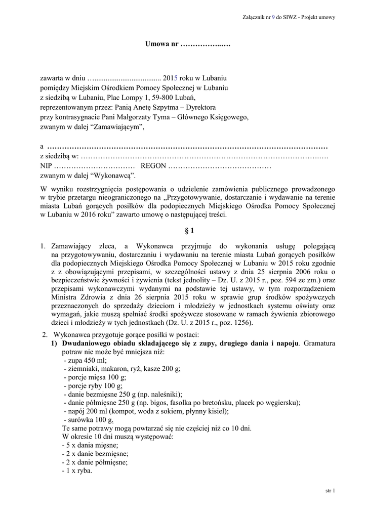 Załącznik nr 9 do SIWZ - Projekt umowy Umowa nr ……………..…. zawarta w dniu ….................................... 2015 roku w Lubaniu pomiędzy Miejskim Ośrodkiem Pomocy Społecznej w Lubaniu z siedzibą w Lubaniu, Plac Lompy 1, 59-800 Lubań, reprezentowanym przez: Panią Anetę Szpytma – Dyrektora przy kontrasygnacie Pani Małgorzaty Tyma – Głównego Księgowego, zwanym w dalej “Zamawiającym”, a …………………………………………………………………………………………………… z siedzibą w: …………………………………………………………………………………….…. NIP …………………………… REGON …………………………………… zwanym w dalej “Wykonawcą”. W wyniku rozstrzygnięcia postępowania o udzielenie zamówienia publicznego prowadzonego w trybie przetargu nieograniczonego na „Przygotowywanie, dostarczanie i wydawanie na terenie miasta Lubań gorących posiłków dla podopiecznych Miejskiego Ośrodka Pomocy Społecznej w Lubaniu w 2016 roku” zawarto umowę o następującej treści. §1 1. Zamawiający zleca, a Wykonawca przyjmuje do wykonania usługę polegającą na przygotowywaniu, dostarczaniu i wydawaniu na terenie miasta Lubań gorących posiłków dla podopiecznych Miejskiego Ośrodka Pomocy Społecznej w Lubaniu w 2015 roku zgodnie z z obowiązującymi przepisami, w szczególności ustawy z dnia 25 sierpnia 2006 roku o bezpieczeństwie żywności i żywienia (tekst jednolity – Dz. U. z 2015 r., poz. 594 ze zm.) oraz przepisami wykonawczymi wydanymi na podstawie tej ustawy, w tym rozporządzeniem Ministra Zdrowia z dnia 26 sierpnia 2015 roku w sprawie grup środków spożywczych przeznaczonych do sprzedaży dzieciom i młodzieży w jednostkach systemu oświaty oraz wymagań, jakie muszą spełniać środki spożywcze stosowane w ramach żywienia zbiorowego dzieci i młodzieży w tych jednostkach (Dz. U. z 2015 r., poz. 1256). 2. Wykonawca przygotuje gorące posiłki w postaci: 1) Dwudaniowego obiadu składającego się z zupy, drugiego dania i napoju. Gramatura potraw nie może być mniejsza niż: - zupa 450 ml; - ziemniaki, makaron, ryż, kasze 200 g; - porcje mięsa 100 g; - porcje ryby 100 g; - danie bezmięsne 250 g (np. naleśniki); - danie półmięsne 250 g (np. bigos, fasolka po bretońsku, placek po węgiersku); - napój 200 ml (kompot, woda z sokiem, płynny kisiel); - surówka 100 g. Te same potrawy mogą powtarzać się nie częściej niż co 10 dni. W okresie 10 dni muszą występować: - 5 x dania mięsne; - 2 x danie bezmięsne; - 2 x danie półmięsne; - 1 x ryba. str 1 Załącznik nr 9 do SIWZ - Projekt umowy Wyżej wymienione rodzaje dań winny być serwowane naprzemiennie. Wydawanie dwudaniowego obiadu odbywać się będzie na podstawie listy sporządzonej przez Zamawiającego i przekazanej Wykonawcy w miesiącu XII 2015 roku oraz w VI i VIII 2016 roku oraz na podstawie kolejnych zgłoszeń Zamawiającego telefonicznych lub e-mailem na dzień przed wydaniem obiadu (w przypadku zmiany liczby posiłków). Lista i zgłoszenie zawierać będą imię i nazwisko oraz adres zamieszkania dziecka zgłaszanego na obiad. 2) Zupy. Gramatura potraw nie może być mniejsza niż: - zupa 500 ml; - chleb 100 g. 3) Zupy z dodatkiem. Dodatek stanowią np. parówka, kaszanka, jajka, pasztet, pieczeń, ser topiony. Gramatura potraw nie może być mniejsza niż: - zupa 500 ml; - chleb 100 g; - dodatek 100 g. Wydawanie zup i zup z dodatkiem odbywać się będzie na podstawie listy sporządzonej przez Zamawiającego i przekazanej Wykonawcy w miesiącu XII 2015 roku i VI 2016 roku oraz na podstawie kolejnych zgłoszeń Zamawiającego telefonicznych lub emailem na dzień przed wydaniem zupy (w przypadku zmiany liczby posiłków). Lista i zgłoszenie zawierać będą imię i nazwisko, adres zamieszkania oraz ilość zup/zup z dodatkiem do wydania dziennie dla danej osoby. 3. Gramatura opisana w ust. 2 pkt 1,2,3 stanowi gramaturę wydawanego (gotowego do spożycia) składnika posiłku. 4. Wykonawca przygotuje posiłki na bazie własnych produktów (w tym produktów sezonowych), we wszystkich wydawanych posiłkach wykonawca zapewni wartości kaloryczne i odżywcze - zgodnie z normami Instytutu Żywności i Żywienia w Warszawie. Posiłki muszą charakteryzować się dobrą jakością, posiadać walory smakowe oraz właściwą temperaturę (nie niższą niż: zupy 750C, drugie danie 630C, gorące napoje 800C), winny być urozmaicone, bez zastosowania produktów nieświeżych, o złej jakości i wysoko przetworzonych (zupy w proszku) oraz produktów zawierających ilość konserwantów przekraczających normy określone w odpowiednich przepisach. Środki spożywcze wykorzystywane do przygotowywania posiłków muszą spełniać wymogi określone w Załączniku nr 2 do rozporządzenia Ministra Zdrowia z dnia 26 sierpnia 2015 roku w sprawie grup środków spożywczych przeznaczonych do sprzedaży dzieciom i młodzieży w jednostkach systemu oświaty oraz wymagań, jakie muszą spełniać środki spożywcze stosowane w ramach żywienia zbiorowego dzieci i młodzieży w tych jednostkach (Dz. U. z 2015 r., poz. 1256). 5. Wykonawca zobowiązany będzie do wydawania posiłków gorących, przygotowanych w dniu wydawania od poniedziałku do piątku z wyłączeniem dni wolnych od pracy i dni świątecznych, z tym że: 1) Dwudaniowe obiady od poniedziałku do piątku; 2) Zupy od poniedziałku do czwartku; 3) Zupy z dodatkiem w piątki i dni poprzedzające dni wolne od pracy i dni świąteczne. 6. Obowiązujące godziny wydawania posiłków w lokalu, o którym mowa w § 3 ust. 2: 1) zupy i zupy z dodatkiem w godzinach od 930 do 1200, 2) dwudaniowe obiady w godzinach od 1200 do 1530. 7. Zamawiający nie dopuszcza możliwości wydawania posiłków w naczyniach jednorazowych (dotyczy posiłków wydawanych w lokalu, o którym mowa w § 3 ust. 2). 8. W godzinach wydawania posiłków w lo
