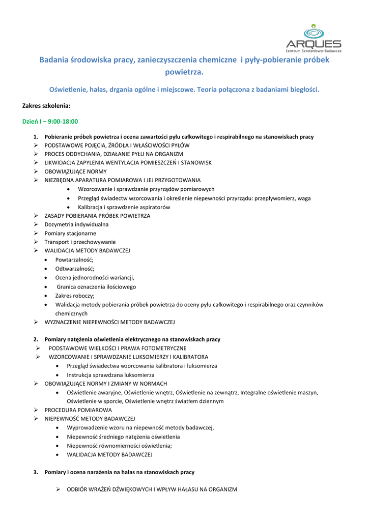 Badania środowiska pracy, zanieczyszczenia chemiczne i pyły-pobieranie próbek powietrza. Oświetlenie, hałas, drgania ogólne i miejscowe. Teoria połączona z badaniami biegłości. Zakres szkolenia: Dzień I – 9:00-18:00 1. Pobieranie próbek powietrza i ocena zawartości pyłu całkowitego i respirabilnego na stanowiskach pracy PODSTAWOWE POJĘCIA, ŹRÓDŁA I WŁAŚCIWOŚCI PYŁÓW PROCES ODDYCHANIA, DZIAŁANIE PYŁU NA ORGANIZM LIKWIDACJA ZAPYLENIA WENTYLACJA POMIESZCZEŃ I STANOWISK OBOWIĄZUJĄCE NORMY NIEZBĘDNA APARATURA POMIAROWA I JEJ PRZYGOTOWANIA Wzorcowanie i sprawdzanie przyrządów pomiarowych Przegląd świadectw wzorcowania i określenie niepewności przyrządu: przepływomierz, waga Kalibracja i sprawdzenie aspiratorów ZASADY POBIERANIA PRÓBEK POWIETRZA Dozymetria indywidualna Pomiary stacjonarne Transport i przechowywanie WALIDACJA METODY BADAWCZEJ Powtarzalność; Odtwarzalność; Ocena jednorodności wariancji, Granica oznaczenia ilościowego Zakres roboczy; Walidacja metody pobierania próbek powietrza do oceny pyłu całkowitego i respirabilnego oraz czynników chemicznych WYZNACZENIE NIEPEWNOŚCI METODY BADAWCZEJ 2. Pomiary natężenia oświetlenia elektrycznego na stanowiskach pracy PODSTAWOWE WIELKOŚCI I PRAWA FOTOMETRYCZNE WZORCOWANIE I SPRAWDZANIE LUKSOMIERZY I KALIBRATORA Przegląd świadectwa wzorcowania kalibratora i luksomierza Instrukcja sprawdzana luksomierza OBOWIĄZUJĄCE NORMY I ZMIANY W NORMACH Oświetlenie awaryjne, Oświetlenie wnętrz, Oświetlenie na zewnątrz, Integralne oświetlenie maszyn, Oświetlenie w sporcie, Oświetlenie wnętrz światłem dziennym PROCEDURA POMIAROWA NIEPEWNOŚĆ METODY BADAWCZEJ Wyprowadzenie wzoru na niepewność metody badawczej, Niepewność średniego natężenia oświetlenia Niepewność równomierności oświetlenia; WALIDACJA METODY BADAWCZEJ 3. Pomiary i ocena narażenia na hałas na stanowiskach pracy ODBIÓR WRAŻEŃ DŹWIĘKOWYCH I WPŁYW HAŁASU NA ORGANIZM 4. WZORCOWANIE I SPRAWDZENIE PRZYRZĄDÓW POMIAROWYCH Przegląd świadectw wzorcowania i wyznaczenie składowych niepewności Instrukcja sprawdzenia przyrządów pomiarowych METODA BADAWCZA Pomiar i ocena ekspozycji zawodowej na gałas (PN- ISO 9612:2011) Hałas komunalny (PN-B-02156:1987)) NIEPEWNOŚĆ METOD BADAWCZYCH Budżet niepewności w pomiarach hałasu; Niepewność wskazań przyrządu pomiarowego. Wyznaczenie niepewności w pomiarach hałasu; WALIDACJA METODY BADAWCZEJ Pomiary i ocena drgań na stanowiskach pracy WPŁYW DRGAŃ NA CZŁOWIEKA WZORCOWANIE I SPRAWDZENIE PRZYRZĄDÓW POMIAROWYCH Przegląd świadectw wzorcowania i wyznaczenie składowych niepewności Instrukcja sprawdzenia przyrządów pomiarowych METODA BADAWCZA Pomiar i ocena drgań o oddziaływaniu ogólnym Pomiar i ocena drgań o oddziaływaniu miejscowym NIEPEWNOŚĆ METOD BADAWCZYCH Budżet niepewności w pomiarach drgań; Wyznaczenie niepewności w pomiarach drgań ogólnych i miejscowych; WALIDACJA METODY BADAWCZEJ Dzień II – 9:00-17:00 PRAKTYKA POŁĄCZONA Z BADANIAMI BIEGŁOŚCI . Badania Biegłości realizowane zgodnie z wymaganiami normy PN-EN/ISO 17043:2011 Pobieranie próbek powietrza metodą dozymetrii indywidualnej i ocena narażenia na pył całkowity i respirabilny i czynniki chemiczne Pomiary hałasu na stanowiskach pracy oraz hałasu zewnętrznego Pomiary drgań ogólnych i miejscowych Pomiary oświetlenia Dyskusja i pytania Dlaczego warto wziąć udział w szkoleniach. Uczestnicy szkolenia nabywają wiedzy i umiejętności: . pobierania próbek powietrza do oceny zawartości pyłu całkowitego i respirabilnego oraz czynników chemicznych sprawdzenia aparatury pomiarowej; wyznaczenia wskaźnika narażenia; określenia niepewności aparatury pomiarowej i niepewności metody badawczej; walidowania metody badawczej. Termin szkolenia: 15-16.05.2014r Miejsce szkolenia: Arques Sp. z o. o ,ul. Mostowa 9 64-800 Chodzież Koszt uczestnictwa: 1200,00 zł netto Podana cena obejmuje udział w szkoleniu, certyfikat uczestnictwa, materiały szkoleniowe, serwis kawowy wraz z obiadem (2 dni), kolacja w formie bankietu, 1 nocleg w pokoju dwuosobowym. Prowadzący szkolenie: mgr Andrzej Uzarczyk Absolwent Politechniki Gdańskiej wydziału Fizyki Technicznej i Matematyki Stosowanej. Wieloletni pracownik Laboratorium Badań środowiska pracy Państwowej Inspekcji Pracy w Gdańsku i wieloletni wykładowca. Autor publikacji i programów komputerowych z zakresu czynników szkodliwych w środowisku pracy. Informacja o tym, co będzie przydatne uczestnikom na szkoleniu Kopie świadectw wzorcowania aparatury pomiarowej, kalkulator. Uczestnicy biorący udział w badaniach biegłości zobowiązani są do zabrania swojego sprzętu pomiarowego. W przypadku, kiedy nie będzie takiej możliwości prosimy o wcześniejsze przesłanie informacji w celu udostępnienia sprzętu od organizatora. Termin nadsyłania zgłoszeń: Zgłoszenia, w formie wypełnionego formularza, prosimy nadsyłać najpóźniej do dnia 09.05.2014r na adres [email protected] Udział w szkoleniu na podstawie wystawionej faktury proforma lub faktury. Więcej informacji na temat organizacji szkoleń w zakładce Ogólne Warunki Świadczenia Usług.