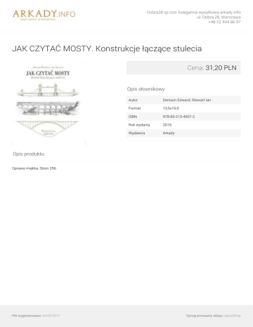 Dobra28 sp zoo. księgarnia wysyłkowa arkady.info ul. Dobra 28, Warszawa +48 22 444 86 97 JAK CZYTAĆ MOSTY. Konstrukcje łączące stulecia Cena: 31,20 PLN Opis słownikowy Autor Denison Edward, Stewart Ian Format 13,5x16,5 ISBN 978-83-213-4957-2 Rok wydania 2016 Wydawca Arkady Opis produktu Oprawa miękka, Stron 256 Plik wygenerowano: 04-03-2017 Powered by TCPDF (www.tcpdf.org) Oprogramowanie sklepu: AptusShop