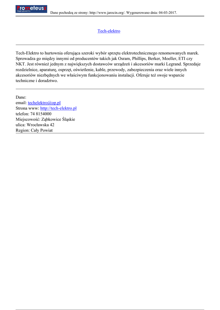 Dane pochodzą ze strony: http://www.jarocin.org/. Wygenerowano dnia: 04-03-2017. Tech-elektro Tech-Elektro to hurtownia oferująca szeroki wybór sprzętu elektrotechnicznego renomowanych marek. Sprowadza go między innymi od producentów takich jak Osram, Phillips, Berker, Moeller, ETI czy NKT. Jest również jednym z największych dostawców urządzeń i akcesoriów marki Legrand. Sprzedaje rozdzielnice, aparaturę, osprzęt, oświetlenie, kable, przewody, zabezpieczenia oraz wiele innych akcesoriów niezbędnych we właściwym funkcjonowaniu instalacji. Oferuje też swoje wsparcie techniczne i doradztwo. Dane: email: [email protected] Strona www: http://tech-elektro.pl telefon: 74 8154000 Miejscowość: Ząbkowice Śląskie ulica: Wrocławska 42 Region: Cały Powiat