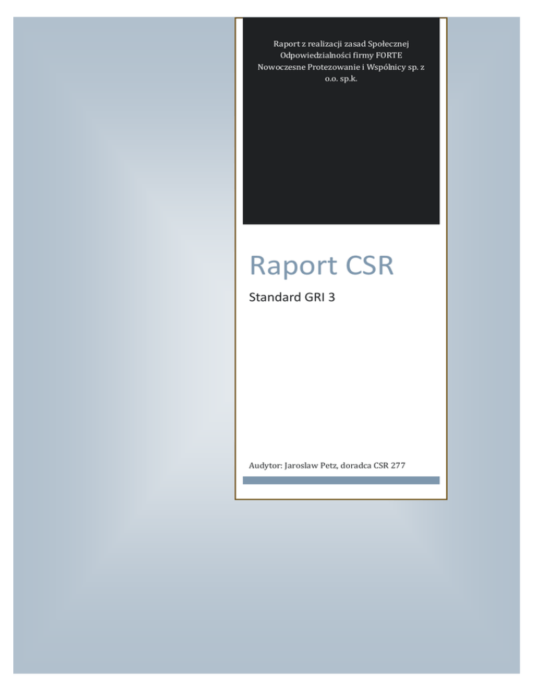 Raport z realizacji zasad Społecznej Odpowiedzialności firmy FORTE Nowoczesne Protezowanie i Wspólnicy sp. z o.o. sp.k. Raport CSR Standard GRI 3 Audytor: Jaroslaw Petz, doradca CSR 277 SPIS TREŚCI SPIS TREŚCI Spis treści Część 1 — O naszej Firmie...................................................................................................................................................... 3 1. Strategia i analiza........................................................................................................................................................ 3 2. Profil organizacyjny................................................................................................................................................... 4 2.1. Nazwa organizacji. ........................................................................................................................................... 4 2.2. Główne marki, produkty i/lub usługi......................................................................................................... 4 2.3. Struktura operacyjna organizacji, z wyróżnieniem głównych działów, spółek zależnych, podmiotów powiązanych oraz przedsięwzięć typu joint-venture..................................................................... 4 2.4. Lokalizacja siedziby głównej organizacji.................................................................................................. 4 2.5. Liczba krajów, w których działa organizacja oraz podanie nazw tych krajów, gdzie zlokalizowane są główne operacje organizacji lub tych, które są szczególnie adekwatne w kontekście treści raportu...................................................................................................................................................................... 4 2.6. Forma własności i struktura prawna organizacji................................................................................... 4 2.7. Obsługiwane rynki z zaznaczeniem zasięgu geograficznego, obsługiwanych sektorów, charakterystyki klientów/ konsumentów i beneficjentów................................................................................. 5 2.8. Skala działalności .............................................................................................................................................. 5 2.9. Znaczące zmiany w raportowanym okresie dotyczące rozmiaru, struktury lub formy własności............................................................................................................................................................................. 5 3. Parametry Raportu..................................................................................................................................................... 7 3.1. Okres raportowania (np. rok obrotowy/kalendarzowy)..................................................................... 7 3.2. Data publikacji ostatniego raportu (jeśli został opublikowany) ........................................................ 7 3.3. Cykl raportowania (roczny, dwuletni itd) ................................................................................................. 7 3.4. Osoba kontaktowa............................................................................................................................................ 7 3.5. Zakres i Zasięg Raportu.................................................................................................................................. 7 3.6. Oświadczenie w sprawie jakichkolwiek ograniczeń, w zakresie i zasięgu raportu. ................... 7 3.7. Informacja o przedsięwzięciach typu joint venture, podmiotach zależnych, obiektach dzierżawionych, operacjach outsoursowanych i innych jednostkach, które w znaczący sposób mogą wpłynąć na porównywalność działań organizacji w poszczególnych okresach i/lub w stosunku do innych organizacji w poszczególnych okresach i/lub w stosunku do innych organizacji......................... 8 3.8. Wyjaśnienia dotyczące efektów jakichkolwiek korekt informacji zawartych w poprzednich raportach z podaniem powodów ich wprowadzenia oraz ich wpływu (np. fuzje, przejęcia, zmiana roku/okresu bazowego, charakteru działalności, metod pomiaru)................................................................. 8 3.9. Znaczne zmiany w stosunku do poprzedniego raportu dotyczące zakresu, zasięgu lub metod pomiaru zastosowanych w raporcie. ......................................................................................................................... 8 SPIS TREŚCI 4. Nadzór, zobowiązania i zaangażowanie.............................................................................................................. 9 4.1. Nadzór.................................................................................................................................................................. 9 4.2. Struktura nadzorcza organizacji wraz z komisjami podlegającymi pod najwyższy organ nadzorczy, odpowiedzialnymi za poszczególne zadania, jak na przykład tworzenie strategii czy nadzór nad organizacją................................................................................................................................................... 9 4.3. Liczba członków najwyższego organu nadzorczego z wyróżnieniem niezależnych i/lub nie wykonawczych członków (dotyczy organizacji posiadających monistyczną strukturę rady nadzorczej/organu nadzorczego)..............................................................................................................................10 4.4. Mechanizmy umożliwiające akcjonariuszom i pracownikom zgłaszanie rekomendacji i wskazówek dla najwyższego organu nadzorczego. Opis procesów służących do Informowania pracowników i konsultacji z nimi w sprawach dotyczących pracy. ................................................................10 Id