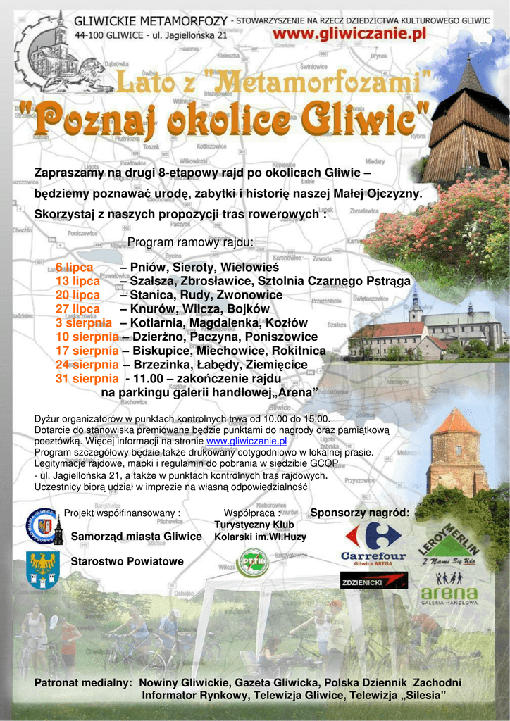 Zapraszamy na drugi 8-etapowy rajd po okolicach Gliwic – będziemy poznawać urodę, zabytki i historię naszej Małej Ojczyzny. Skorzystaj z naszych propozycji tras rowerowych : Program ramowy rajdu: 6 lipca – Pniów, Sieroty, Wielowieś 13 lipca – Szałsza, Zbrosławice, Sztolnia Czarnego Pstrąga 20 lipca – Stanica, Rudy, Zwonowice 27 lipca – Knurów, Wilcza, Bojków 3 sierpnia – Kotlarnia, Magdalenka, Kozłów 10 sierpnia – Dzierżno, Paczyna, Poniszowice 17 sierpnia – Biskupice, Miechowice, Rokitnica 24 sierpnia – Brzezinka, Łabędy, Ziemięcice 31 sierpnia - 11.00 – zakończenie rajdu na parkingu galerii handlowej„Arena” Dyżur organizatorów w punktach kontrolnych trwa od 10.00 do 15.00. Dotarcie do stanowiska premiowane będzie punktami do nagrody oraz pamiątkową pocztówką. Więcej informacji na stronie www.gliwiczanie.pl Program szczegółowy będzie także drukowany cotygodniowo w lokalnej prasie. Legitymacje rajdowe, mapki i regulamin do pobrania w siedzibie GCOP - ul. Jagiellońska 21, a także w punktach kontrolnych tras rajdowych. Uczestnicy biorą udział w imprezie na własną odpowiedzialność Projekt współfinansowany : Samorząd miasta Gliwice Współpraca : Sponsorzy nagród: Turystyczny Klub Kolarski im.Wł.Huzy Starostwo Powiatowe Patronat medialny: Nowiny Gliwickie, Gazeta Gliwicka, Polska Dziennik Zachodni Informator Rynkowy, Telewizja Gliwice, Telewizja „Silesia”