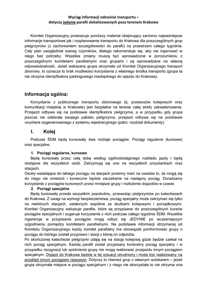 Wyciąg informacji odnośnie transportu – dotyczy jedynie parafii zlokalizowanych poza terenem Krakowa Komitet Organizacyjny przekazuje poniższy materiał obejmujący zarówno najważniejsze informacje transportowe jak i rozplanowanie transportu do Krakowa dla poszczególnych grup pielgrzymów (z zachowaniem szczegółowości do parafii) na przestrzeni całego tygodnia. Cały plan uwzględniał szereg czynników, dlatego rekomenduje się, aby nie ingerować w niego bez potrzeby. Wszelkie zmiany muszą być wprowadzone w porozumieniu z poszczególnymi komitetami parafialnymi oraz grupami i są wprowadzane na własną odpowiedzialność. Jeżeli wskazana grupa otrzymała od Komitet Organizacyjnego transport zbiorowy, to oznacza to brak możliwości korzystania z własnego środka transportu (grupa ta nie otrzyma identyfikatora parkingowego niezbędnego do wjazdu do Krakowa). Informacja ogólna: Korzystanie z publicznego transportu zbiorowego (tj. przewozów kolejowych oraz komunikacji miejskiej w Krakowie) jest bezpłatne na terenie całej strefy zakwaterowania. Przejazd odbywa się na podstawie identyfikatora pielgrzyma, a w przypadku gdy grupa jeszcze nie odebrała swojego pakietu pielgrzyma, przejazd odbywa się na podstawie vouchera wygenerowanego z systemu rejestracyjnego (patrz: rozdział dokumenty). I. Kolej Podczas ŚDM będą kursowały dwa rodzaje pociągów. Pociągi regularne (kursowe) oraz specjalne. 1. Pociągi regularne, kursowe Będą kursowały przez całą dobę według ogólnodostępnego rozkładu jazdy i będą dostępne dla wszystkich osób. Zatrzymują się one na wszystkich przystankach oraz stacjach. Osoby wsiadające do takiego pociągu na stacjach powinny mieć na uwadze to, że mogą się do niego nie zmieścić i konieczne będzie zaczekanie na następny pociąg. Doradzamy korzystanie z pociągów kursowych przez mniejsze grupy i rozłożenie dojazdów w czasie. 2. Pociągi specjalne Będą kursowały przede wszystkim popołudniu, przewożąc pielgrzymów po katechezach do Krakowa. Z uwagi na wymogi bezpieczeństwa, pociąg specjalny może zatrzymać się tylko na niektórych stacjach, ustalonych wspólnie ze służbami kolejowymi i porządkowymi. Komitet Organizacyjny wskazuje parafie, które są przypisane do poszczególnych kursów pociągów specjalnych i sugeruje korzystanie z nich podczas całego tygodnia ŚDM. Wszelkie ingerencje w przypisanie pociągów mogą odbyć się JEDYNIE po wcześniejszym uzgodnieniu pomiędzy komitetami parafialnymi. Na podstawie informacji otrzymanej od Komitetu Organizacyjnego każdy komitet parafialny ma obowiązek poinformować grupy o pociągu do którego zostali przypisani i stacji z której on odjeżdża. Po skończonej katechezie pielgrzymi udają się na stację kolejową gdzie będzie czekał na nich pociąg specjalnym. Każdej parafii został przypisany konkretny pociąg specjalny i w przypadku rezygnacji lub spóźnienia grupy nie mogą realizować przejazdu innym pociągiem specjalnym. Dojazd do Krakowa będzie w tej sytuacji utrudniony i może być realizowany na przykład innym pociągiem rejsowym. Dotyczy to również grup z własnym autokarem – jeżeli grupa otrzymała miejsce w pociągu specjalnym i z niego nie skorzystała to nie otrzyma ona Wyciąg informacji odnośnie transportu – dotyczy jedynie parafii zlokalizowanych poza terenem Krakowa możliwości dojazdu do Krakowa własnym autokarem. Zaleca się aby pielgrzymi trzymali się wytycznych od komitetu organizacyjnego. Pielgrzymi mają obowiązek dostosować się do organizacji ruchu przewidzianej na danym dworcu kolejowym. Pociąg specjalny ma wystarczającą ilość miejsc aby pomieścić wszystkich pielgrzymów (o ile będą się oni trzymać wyznaczonych kursów). Nie każdy pociąg specjalny ma taką samą ilość miejsc i zostało to uwzględnione podczas przydzielania parafiom pociągów. Pociąg specjalny kursuje między dwoma stacjami i nie zatrzymuje się na stacjach pośrednich. Dla każdego kierunku dojazdu wyznaczona jest stacja końcowa w Krakowie. Inna stacja końcowa może obowiązywać od wtorku do piątku a inna na sobotę. Rozkłady jazdy oraz liczba pociągów może różnić się w zależności od okresu: a) wtorek, czwartek i piątek – 26, 28, 29 lipca; b) środa – 27 lipca; c) sobota – spotkanie z papieżem na Brzegach – 30 lipca. Inny rozkład jazdy w środę 27 lipca, wynika ze specjalnych wydarzeń przewidzianych dla pielgrzymów z Włoch. W środę niektóre pociągi specjalne pojadą wcześniej. We wtorek, środę, czwartek i piątek pociąg specjalny w Krakowie będzie zatrzymywał się na jednej stacji docelowej (zależnej od kierunku). Pielgrzymi powinni wtedy opuścić pociąg, a następnie poruszać się po Krakowie przy pomocy komunikacji miejskiej lub pieszo. W sobotę pociąg zawiezie pielgrzymów na stację możliwie najbliżej Brzegów, skąd dostaną się oni na spotkanie z papieżem. Analogicznie do przyjazdu, będzie wyglądał powrót po skończonych uroczystościach na miejsce zakwaterowania. Pielgrzymi udają się na stację na której przedtem wysiadali i pociągiem wracają na swoje miejsce zakwaterowania. Podczas powrotu nie ma przypisanych pociągów do grup. Pociąg jedzie w określonym kierunku i zatrzymuje się na stacjach z których wcześniej kursowały pociągi specjalne. Rozkład jazdy pociągów specjalnych jest uwarunkowany przez możliwości techniczne i organizacyjne przewoźników i nie ma możliwości ingerencji w godziny odjazdów pociągów. Wyciąg informacji odnośnie transportu – dotyczy jedynie parafii zlokalizowanych poza terenem Krakowa II. Transport autokarem własnym 1. Dojazd autokarem do Krakowa W sytuacjach, kiedy grupa nie będzie mogła podróżować koleją otrzyma specjalny identyfikator (patrz: rozdział dokumenty), który będzie uprawniał do wjazdu autokaru w strefy ograniczonego ruchu. Na identyfikatorze oprócz nr rejestracyjnego pojazdu znajdować się bę