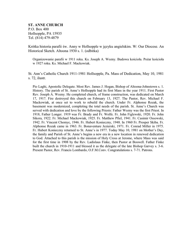 ST. ANNE CHURCH P.O. Box 400 Hollsopple, PA 15935 Tel. (814) 479-4879 Krótka historia parafii św. Anny w Hollsopple w języku angielskim. W: Our Diocese. An Historical Sketch. Altoona 1930 s. 1. (odbitka) Organizowanie parafii w 1911 roku. Ks. Joseph A. Wozny. Budowa kościoła. Pożar kościoła w 1927 roku. Ks. Michael F. Mackowiak. St. Ann’s Catholic Church 1911-1981 Hollsopple, Pa. Mass of Dedication, May 10, 1981 s. 72, ilustr. Pio Laghi, Apostolic Delegate. Most Rev. James J. Hogan, Bishop of Altoona-Johnstown s. 1. History. The parish of St. Anne’s Hollsopple had its first Mass in the year 1911. First Pastor Rev. Joseph A. Wozny. He completed church, of frame construction, was dedicated on March 17, 1917. Fire destroyed this church on February 13, 1927. The Pastor, Rev. Michael F. Mackowiak, at once set to work to rebuild the church. Under Fr. Alphonse Rozak, the basement was modernized, completing the total needs of the parish. St. Anne’s Church was served with dedication and love by the following Priests: Father Wozny was the first Priest. In 1918, Father Longer. 1919 was Fr. Brady and Fr. Wolfe. Fr. John Figlewski, 1920. Fr. John Sikora, 1922. Fr. Michael Mackowiak, 1925. Fr. Matthew Pfiel, 1941. Fr. Casimir Ossowski, 1942. Fr. Vincent Chomyc, 1946. Fr. Hubert Konieczny, 1948. In 1960 Fr. Prosper Skiba. Fr. Alphonse Rozak came in 1963. Fr. Bonaventure Jezierski, 1971. Fr. Conrad Miller in 1975. Fr. Hubert Konieczny returned to St. Anne’s in 1977. Today May 10, 1981 on Mother’s Day, the family and Parish of St. Anne’s begins a new era in a new location in renewed dedication to God. Attached to this parish is the mission of Holy Cross at Jerome, where Mass was said for the first time in 1908 by the Rev. Ladislaus Finke, then Pastor at Boswell. Father Finke built the church in 1910-1911 and blessed it as the delegate of the late Bishop Garvey s. 3-6. Present Pastor, Rev. Francis Lombardo, O.F.M.Conv. Congratulations s. 7-71. Patrons.