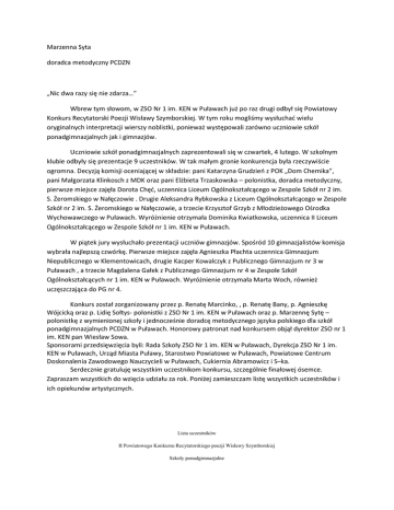 Marzenna Syta doradca metodyczny PCDZN „Nic dwa razy się nie zdarza…” Wbrew tym słowom, w ZSO Nr 1 im. KEN w Puławach już po raz drugi odbył się Powiatowy Konkurs Recytatorski Poezji Wisławy Szymborskiej. W tym roku mogliśmy wysłuchad wielu oryginalnych interpretacji wierszy noblistki, ponieważ występowali zarówno uczniowie szkół ponadgimnazjalnych jak i gimnazjów. Uczniowie szkół ponadgimnazjalnych zaprezentowali się w czwartek, 4 lutego. W szkolnym klubie odbyły się prezentacje 9 uczestników. W tak małym gronie konkurencja była rzeczywiście ogromna. Decyzją komisji oceniającej w składzie: pani Katarzyna Grudzieo z POK „Dom Chemika”, pani Małgorzata Klinkosch z MDK oraz pani Elżbieta Trzaskowska – polonistka, doradca metodyczny, pierwsze miejsce zajęła Dorota Chęd, uczennica Liceum Ogólnokształcącego w Zespole Szkół nr 2 im. S. Żeromskiego w Nałęczowie . Drugie Aleksandra Rybkowska z Liceum Ogólnokształcącego w Zespole Szkół nr 2 im. S. Żeromskiego w Nałęczowie, a trzecie Krzysztof Grzyb z Młodzieżowego Ośrodka Wychowawczego w Puławach. Wyróżnienie otrzymała Dominika Kwiatkowska, uczennica II Liceum Ogólnokształcącego w Zespole Szkół nr 1 im. KEN w Puławach. W piątek jury wysłuchało prezentacji uczniów gimnazjów. Spośród 10 gimnazjalistów komisja wybrała najlepszą czwórkę. Pierwsze miejsce zajęła Agnieszka Płachta uczennica Gimnazjum Niepublicznego w Klementowicach, drugie Kacper Kowalczyk z Publicznego Gimnazjum nr 3 w Puławach , a trzecie Magdalena Gałek z Publicznego Gimnazjum nr 4 w Zespole Szkół Ogólnokształcących nr 1 im. KEN w Puławach. Wyróżnienie otrzymała Marta Woch, również uczęszczająca do PG nr 4. Konkurs został zorganizowany przez p. Renatę Marcinko, , p. Renatę Bany, p. Agnieszkę Wójcicką oraz p. Lidię Sołtys- polonistki z ZSO Nr 1 im. KEN w Puławach oraz p. Marzennę Sytę – polonistkę z wymienionej szkoły i jednocześnie doradcę metodycznego języka polskiego dla szkół ponadgimnazjalnych PCDZN w Puławach. Honorowy patronat nad konkursem objął dyrektor ZSO nr 1 im. KEN pan Wiesław Sowa. Sponsorami przedsięwzięcia byli: Rada Szkoły ZSO Nr 1 im. KEN w Puławach, Dyrekcja ZSO Nr 1 im. KEN w Puławach, Urząd Miasta Puławy, Starostwo Powiatowe w Puławach, Powiatowe Centrum Doskonalenia Zawodowego Nauczycieli w Puławach, Cukiernia Abramowicz i S–ka. Serdecznie gratuluję wszystkim uczestnikom konkursu, szczególnie finałowej ósemce. Zapraszam wszystkich do wzięcia udziału za rok. Poniżej zamieszczam listę wszystkich uczestników i ich opiekunów artystycznych. Lista uczestników II Powiatowego Konkursu Recytatorskiego poezji Wisławy Szymborskiej Szkoły ponadgimnazjalne Puławy 4. 02. 2010r. ZSO Nr 1 im. KEN Lp. Imię i nazwisko uczestnika Imię i nazwisko opiekuna Tytuły utworów „Jawa” 1. Justyna Mączka Monika Witkowska „Nic dwa razy” Liceum Ogólnokształcące w Zespole Szkół Agrobiznesu w Klementowicach „Pod jedną gwiazdą” 2. Małgorzata Łyszcz Monika Nobis „Zakochani” „Pierwsza fotografia Hitlera” 3. Alina Gomółka Dorota Chęć „Kałuża” „Pierwsza miłość” 4. Jolanta Woźniakowska Aleksandra Rybkowska „Chmury” „Ballada” 5. Łukasz Zdanowicz Joanna Czajkowska „Listy umarłych” „Atlantyda” 6. Mariola Guz 7. Nazwa szkoły Krzysztof Grzyb „Wszelki wypadek” Anna Sewczyk „Śmiech” Zespół Szkół Technicznych w Puławach Liceum Ogólnokształcące w Zespole Szkół nr 2 im. S. Żeromskiego w Nałęczowie Liceum Ogólnokształcące w Zespole Szkół nr 2 im. S. Żeromskiego w Nałęczowie III Liceum Ogólnokształcące w Zespole Szkół Ogólnokształcących nr 2 im. F. D. Kniaźnina w Puławach III Liceum Ogólnokształcące w Zespole Szkół Ogólnokształcących nr 2 im. F. D. Kniaźnina w Puławach Grażyna Jasiakiewicz Młodzieżowy Ośrodek Wychowawczy w Puławach Marzenna Syta II Liceum Ogólnokształcące w Zespole Szkół Ogólnokształcących Nr 1 im. KEN w Puławach Renata Marcinko II Liceum Ogólnokształcące w Zespole Szkół Ogólnokształcących Nr 1 im. KEN w Puławach „Nic dwa razy” ”Trzy słowa najdziwniejsze” 8. Paulina Pajórek „Prospekt” 9. Dominika Kwiatkowska „Miłość od pierwszego wejrzenia” „Przy winie” 10. Jolanta Babulewicz „Martwa natura z balonikiem” Bożena Pajurek Zespół Szkół Nr 1 w Puławach „Zdumienie” Lista uczestników II Powiatowego Konkursu Recytatorskiego poezji Wisławy Szymborskiej GIMNAZJUM Puławy 5. 02. 2010r. ZSO Nr 1 im. KEN Lp. Imię i nazwisko uczestnika Tytuły utworów Imię i nazwisko opiekuna Nazwa szkoły 1. Karolina Smytkiewicz „Album” Maria Makuch Publiczne Gimnazjum nr 2 w Puławach „Prospekt” „Koniec i początek” 2. Publiczne Gimnazjum nr 1 w Kurowie Bożena Sułek Agnieszka Michalik „Nienawiść” „Chmury” 3. Dorota Chodoła Agata Szkoda Publiczne Gimnazjum w Górze Puławskiej „Śmiech” „Urodziny” 4. Antonina Miłek Publiczne Gimnazjum nr 2 w Puławach Alina Borsewicz „Otwarcie” „Kot w pustym mieszkaniu” 5. Agnieszka Aleksandrowicz Agnieszka Płachto Gimnazjum Publiczne w Klementowicach „Cebula” „Monolog dla Kasandry” 6. Alicja Próchniak „Wrażenia z teatru” Iwona Kowalik Publiczne Gimnazjum w Górze Puławskiej Bożena Sułek Publiczne Gimnazjum nr 1 w Kurowie Renata Bany Publiczne Gimnazjum nr 4 w Puławach Milena Klimczewska Publiczne Gimnazjum nr 3 w Puławach Dorota Badzio Publiczne Gimnazjum nr 3 w Puławach Bożena Sułek Publiczne Gimnazjum nr 1 w Kurowie „Prospekt” 7. Rafał Rukasz „Pokój samobójcy” „Kot w pustym mieszkaniu” 8. Magdalena Gałek „Cebula” „Terrorysta, on patrzy” 9. Kacper Kowalczyk „Do serca w niedzielę” „Pierwsza miłość” 10. Paulina Noworolnik „Kałuża” „Terrorysta, on patrzy” 11. Agnieszka Smęt „Miłość od pierwszego wejrzenia” „Kot w pustym mieszkaniu” 12. Mar