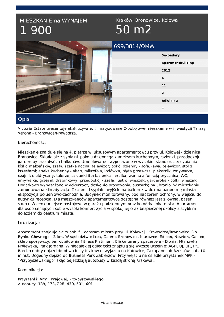 Kraków, Bronowice, Kołowa MIESZKANIE na WYNAJEM 50 m2 1 900 699/3814/OMW Secondary ApartmentBuilding 2012 4 11 2 Adjoining 1 Opis Victoria Estate prezentuje ekskluzywne, klimatyzowane 2-pokojowe mieszkanie w inwestycji Tarasy Verona - Bronowice/Krowodrza. Nieruchomość: Mieszkanie znajduje się na 4. piętrze w luksusowym apartamentowcu przy ul. Kołowej - dzielnica Bronowice. Składa się z sypialni, pokoju dziennego z aneksem kuchennym, łazienki, przedpokoju, garderoby oraz dwóch balkonów. Umeblowane i wyposażone w wysokim standardzie: sypialnia łóżko małżeńskie, szafa, szafka nocna, telewizor; pokój dzienny - sofa, ława, telewizor, stół z krzesłami; aneks kuchenny - okap, mikrofala, lodówka, płyta grzewcza, piekarnik, zmywarka, czajnik elektryczny, talerze, szklanki itp; łazienka - pralka, wanna z funkcją prysznica, WC, umywalka, grzejnik drabinkowy; przedpokój - szafa, lustro, wieszak; garderoba - półki, wieszaki. Dodatkowo wyposażone w odkurzacz, deskę do prasowania, suszarkę na ubrania. W mieszkaniu zamontowana klimatyzacja. Z salonu i sypialni wyjście na balkon z widok na panoramę miasta ekspozycja południowo-zachodnia. Budynek monitorowany, pod nadzorem ochrony, w wejściu do budynku recepcja. Dla mieszkańców apartamentowca dostępna również jest siłownia, basen i sauna. W cenie miejsce postojowe w garażu podziemnym oraz komórka lokatorska. Apartament dla osób ceniących sobie wysoki komfort życia w spokojnej oraz bezpiecznej okolicy z szybkim dojazdem do centrum miasta. Lokalizacja: Apartament znajduje się w pobliżu centrum miasta przy ul. Kołowej - Krowodrza/Bronowice. Do Rynku Głównego - 3 km. W sąsiedztwie Ikea, Galeria Bronowice, biurowce: Edison, Newton, Galileo, sklep spożywczy, banki, siłownia Fitness Platinium. Blisko tereny spacerowe - Błonia, Młynówka Królewska, Park Jordana. W niedalekiej odległości znajdują się wyższe uczelnie: AGH, UJ, UR, PK. Bardzo dobry dojazd do obwodnicy Krakowa i wyjazdu na Katowice, Zakopane lub Rzeszów - ok. 10 minut. Dogodny dojazd do Business Park Zabierzów. Przy wejściu na osiedle przystanek MPK "Przybyszewskiego" skąd odjeżdżają autobusy w każdą stronę Krakowa.. Komunikacja: Przystanki: Armii Krajowej, Przybyszewskiego Autobusy: 139, 173, 208, 439, 501, 601 Victoria Estate Opłaty: 1900zł najem + ok. 700zł czynsz adm. + prąd Polecam i zapraszam do oglądania! Małgorzata Wicha tel. +48 511 560 721 email: [email protected] Victoria Estate Powered by TCPDF (www.tcpdf.org)