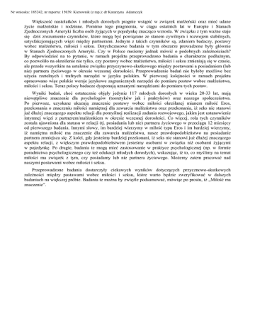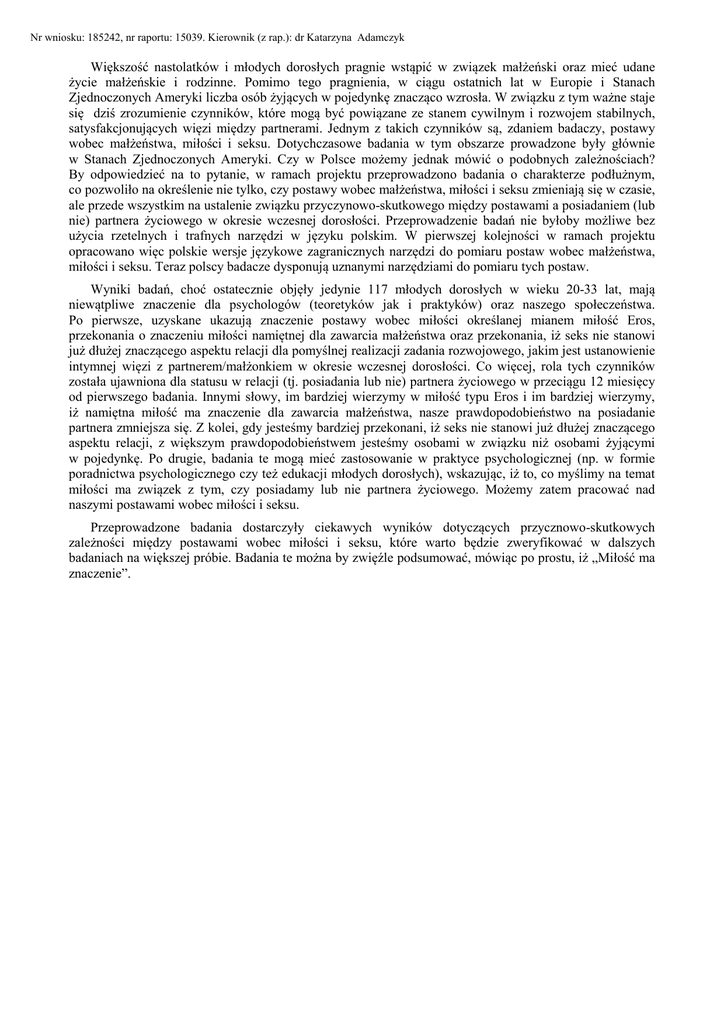 Nr wniosku: 185242, nr raportu: 15039. Kierownik (z rap.): dr Katarzyna Adamczyk Większość nastolatków i młodych dorosłych pragnie wstąpić w związek małżeński oraz mieć udane życie małżeńskie i rodzinne. Pomimo tego pragnienia, w ciągu ostatnich lat w Europie i Stanach Zjednoczonych Ameryki liczba osób żyjących w pojedynkę znacząco wzrosła. W związku z tym ważne staje się dziś zrozumienie czynników, które mogą być powiązane ze stanem cywilnym i rozwojem stabilnych, satysfakcjonujących więzi między partnerami. Jednym z takich czynników są, zdaniem badaczy, postawy wobec małżeństwa, miłości i seksu. Dotychczasowe badania w tym obszarze prowadzone były głównie w Stanach Zjednoczonych Ameryki. Czy w Polsce możemy jednak mówić o podobnych zależnościach? By odpowiedzieć na to pytanie, w ramach projektu przeprowadzono badania o charakterze podłużnym, co pozwoliło na określenie nie tylko, czy postawy wobec małżeństwa, miłości i seksu zmieniają się w czasie, ale przede wszystkim na ustalenie związku przyczynowo-skutkowego między postawami a posiadaniem (lub nie) partnera życiowego w okresie wczesnej dorosłości. Przeprowadzenie badań nie byłoby możliwe bez użycia rzetelnych i trafnych narzędzi w języku polskim. W pierwszej kolejności w ramach projektu opracowano więc polskie wersje językowe zagranicznych narzędzi do pomiaru postaw wobec małżeństwa, miłości i seksu. Teraz polscy badacze dysponują uznanymi narzędziami do pomiaru tych postaw. Wyniki badań, choć ostatecznie objęły jedynie 117 młodych dorosłych w wieku 20-33 lat, mają niewątpliwe znaczenie dla psychologów (teoretyków jak i praktyków) oraz naszego społeczeństwa. Po pierwsze, uzyskane ukazują znaczenie postawy wobec miłości określanej mianem miłość Eros, przekonania o znaczeniu miłości namiętnej dla zawarcia małżeństwa oraz przekonania, iż seks nie stanowi już dłużej znaczącego aspektu relacji dla pomyślnej realizacji zadania rozwojowego, jakim jest ustanowienie intymnej więzi z partnerem/małżonkiem w okresie wczesnej dorosłości. Co więcej, rola tych czynników została ujawniona dla statusu w relacji (tj. posiadania lub nie) partnera życiowego w przeciągu 12 miesięcy od pierwszego badania. Innymi słowy, im bardziej wierzymy w miłość typu Eros i im bardziej wierzymy, iż namiętna miłość ma znaczenie dla zawarcia małżeństwa, nasze prawdopodobieństwo na posiadanie partnera zmniejsza się. Z kolei, gdy jesteśmy bardziej przekonani, iż seks nie stanowi już dłużej znaczącego aspektu relacji, z większym prawdopodobieństwem jesteśmy osobami w związku niż osobami żyjącymi w pojedynkę. Po drugie, badania te mogą mieć zastosowanie w praktyce psychologicznej (np. w formie poradnictwa psychologicznego czy też edukacji młodych dorosłych), wskazując, iż to, co myślimy na temat miłości ma związek z tym, czy posiadamy lub nie partnera życiowego. Możemy zatem pracować nad naszymi postawami wobec miłości i seksu. Przeprowadzone badania dostarczyły ciekawych wyników dotyczących przycznowo-skutkowych zależności między postawami wobec miłości i seksu, które warto będzie zweryfikować w dalszych badaniach na większej próbie. Badania te można by zwięźle podsumować, mówiąc po prostu, iż „Miłość ma znaczenie”.