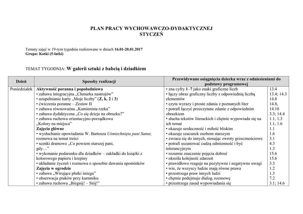 PLAN PRACY WYCHOWAWCZO-DYDAKTYCZNEJ STYCZEŃ Tematy zajęć w 19-tym tygodniu realizowane w dniach 16.01-20.01.2017 Grupa: Kotki (5-latki) TEMAT TYGODNIA: W galerii sztuki z babcią i dziadkiem Dzień Sposoby realizacji Poniedziałek Aktywność poranna i popołudniowa • zabawa integracyjna „Chmurka nastrojów” • uzupełnianie karty „Moje liczby” (Z, k. 2 i 3) • ćwiczenia poranne – Zestaw II • zabawa równoważna „Kamienista rzeka” • zabawa dydaktyczna „Co się dzieje na obrazku?” • zabawa ruchowa orientacyjno-porządkowa „Kolory na miejsca” Zajęcia główne • wysłuchanie opowiadania W. Bartosza Uśmiechnięta pani Sama; rozmowa na temat treści • scenki dramowe „Co powiem starszej pani, gdy…” • wykonanie podarunku dla dziadków – zakładki do książki z kolorowego papieru i krepiny • układanie życzeń i rozmowa o sposobie dawania upominków Zajęcia w ogrodzie • zabawa „Wirujące płatki śniegu” • obserwacja ptaków przy karmniku • zabawa ruchowa „Biegnij! – Stój!” Przewidywane osiągnięcia dziecka wraz z odniesieniami do podstawy programowej • zna cyfry 1–7 jako znaki graficzne liczb 13.4 • łączy obraz graficzny liczby z odpowiednią liczbą 13.4; 14.3 elementów 14.8 • czyta wyrazy i proste zdania z poznanych liter 14.8, • potrafi łączyć przeczytane zdanie z odpowiednim 14.10 obrazkiem 3.3; 14.4 • słucha tekstów literackich i chętnie wypowiada się na 1.1, 1.3 ich temat 1.1, 1.6 • okazuje serdeczność i miłość bliskim 1.1 • okazuje szacunek osobom starszym 1.6 • zwraca się do innych, stosując zwroty grzecznościowe 3.1 • potrafi uszanować cudzą odmienność i być 4.3 tolerancyjnym 1.3 • rozumie znaczenie pojęcia dobroć 15.6 • określa kolejność zdarzeń 15.6 • prawidłowo reaguje na pozytywne i negatywne uwagi 3.3 • wie, że wszyscy ludzie mają równe prawa 1.2 • przestrzega praw innych ludzi 1.3 • chętnie podejmuje dialog, rozmowę 7.2 • przestrzega zasad wypowiadania się 3.1; 14.6 Wtorek Aktywność poranna i popołudniowa • zabawa z treningu twórczości „Jedno okno” • wykonanie ramki do obrazu (KA, k. 13) • ćwiczenia poranne – Zestaw II • „Gdzie szukać głoski g?” – ćwiczenia (KP2, ćw. 1 i 2, s. 63) • zabawa ortofoniczna „Głosy zimowego lasu” • zabawa na czworakach „Podania piłki stopą” Zajęcia główne • zabawa dydaktyczna „Co kryje obraz?” • oglądanie reprodukcji obrazów malarstwa polskiego i światowego • wykonanie zadań związanych z treścią obrazów – poznanie znaczenia słowa galeria • poznanie litery g, G (KP2, s. 62) • analiza i modelowanie wyrazów: galeria i Gutek • wykonanie ćwiczenia (KP2, ćw. 1, s. 62) • „Moje litery” – uzupełnienie alfabetu (Z, k. 1 i 3) • ćwiczenia gimnastyczne – Zestaw IX Zajęcia w ogrodzie • budowanie ze śniegu • potrafi nawiązać kontakt z rówieśnikami • odgrywa scenki, wyrażając emocje i zdarzenia • podejmuje zabawy słowne – dobiera rymy do słów • odczuwa radość z możliwości obdarowywania innych, rozumie, że podarunkiem może być także rzecz niematerialna • układa życzenia dla bliskich • tworzy upominki dla najbliższych z okazji różnych świąt • konstruuje przedmioty z gotowych elementów • sprawnie posługuje się nożyczkami • wypowiada się na temat życia ptaków • wie o konieczności przebywania na świeżym powietrzu • posługuje się mową powiązaną, kontekstową • aktywnie uczestniczy w zabawach słownych • potrafi podawać nieschematyczne pomysły • potrafi wykonać zadanie zgodnie z poleceniem • zna drukowaną małą i wielką literę g, G • potrafi odwzorowywać kształt litery g, G • odczytuje globalnie wyrazy w powiązaniu z przedstawiającym je obrazkiem • wyodrębnia głoski w prostych słowach • prawidłowo wymawia głoski • czyta wyrazy i proste zdania z poznanych liter • umie posługiwać się szablonami i dokładnie obrysowuje kształty przedstawiające literę • jest zaciekawione otaczającą rzeczywistością • ogląda albumy przedstawiające reprodukcje dzieł sztuki • rozumie pojęcie: dzieło sztuki • rozpoznaje i nazywa podstawowe rodzaje malarstwa ze względu na temat (martwa natura, portret, pejzaż) 1.3 3.3 9.1 10.1 6.5; 14.3 12.1, 12.2 5.1, 5.3 3.3 3.1 4.3 1.2 14.7 14.3, 14.9 14.10 14.6 3.1 14.8 14.3 1.3 9.2; 14.4 9.2 9.2 3.4; 9.2 3.1 14.3, 14.9 5.4 • zabawa z elementem rzutu „Traf i zdobądź punkty” Środa Aktywność poranna i popołudniowa • zabawa dydaktyczna „Literkowy kolaż” • historyjka obrazkowa „Wyprawa do galerii sztuki” (KP2, ćw. 1, s. 64) • ćwiczenia poranne – Zestaw II • zabawa dydaktyczna „Pięć przedmiotów” • zabawy konstrukcyjne – budowanie z klocków • ćwiczenie dużych grup mięśniowych „Supełek” Zajęcia główne • zwiedzanie wystawy „Świat malarstwa” – wycieczka do pobliskiego ośrodka kultury na wystawę malarstwa • omówienie zasad obowiązujących w czasie wycieczki • rozmowa na temat oglądanych dzieł (KP2, ćw. 1, s. 65) • nauka piosenki Zajączek odwiedza znajomych (CD) Zajęcia w ogrodzie • zabawa z podskokami i elementem wyprostnym „Bałwanki” • zabawy na sprzęcie terenowym • zabawa ruchowa „Przeskocz przez kałużę” Czwartek Aktywność poranna i popołudniowa • konstruowanie gier planszowych w zespołach • wypowiada się na temat oglądanych obrazów – określa ich nastrój, kolorystykę i kształt; opowiada o tym, co znajduje się na pierwszym, a co na drugim planie • zna pojęcie galeria • odtwarza wzory literopodobne • bierze aktywny udział w organizowanych zajęciach ruchowych • sprawnie posługuje się sprzętem gimnastycznym • sprawnie wycina nożyczkami według podanego wzoru • zna drukowaną małą i wielką literę g, G • czyta wyrazy i proste zdania z poznanych liter • dokonuje analizy i synt